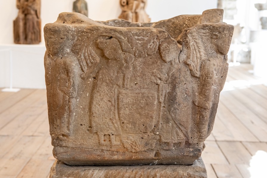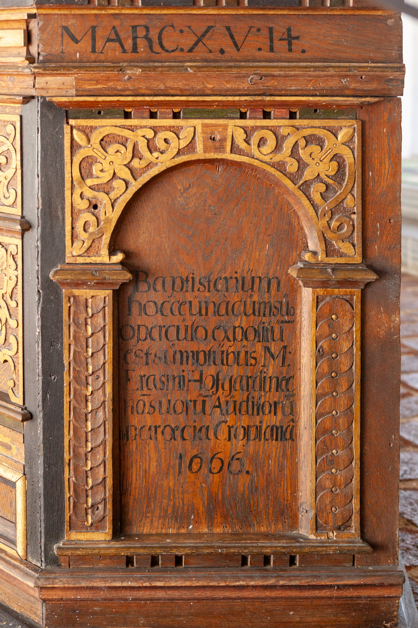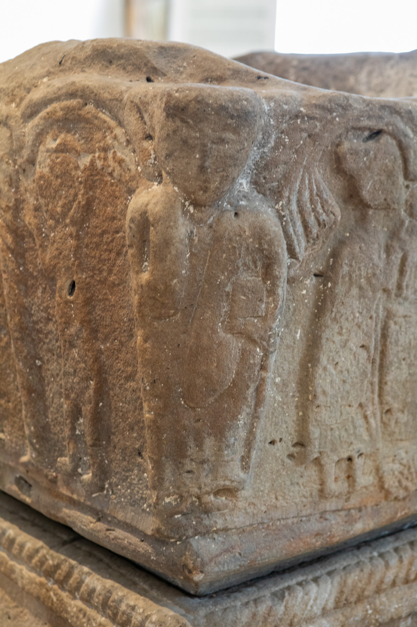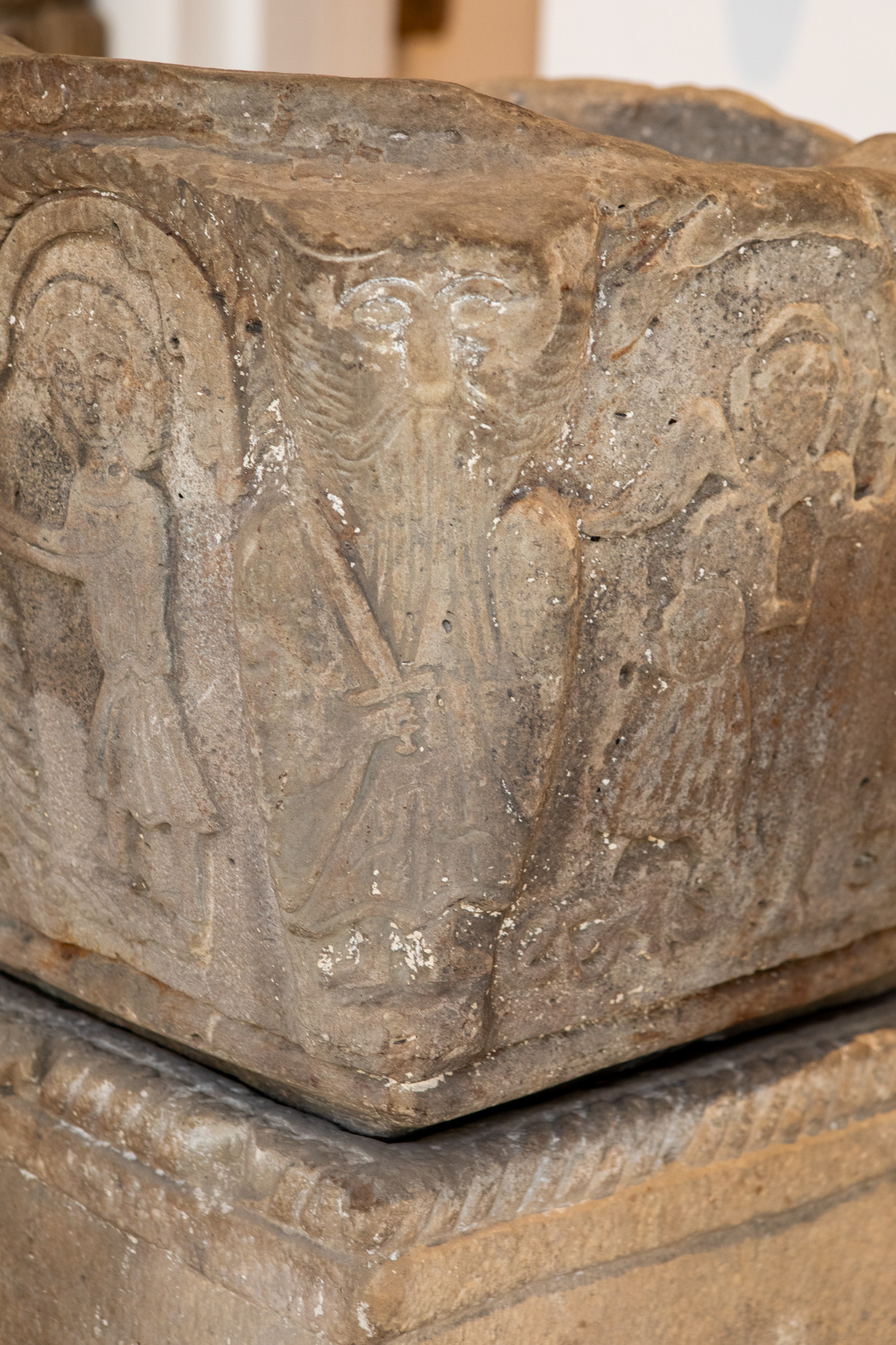 En mand holder et barn over døbefonten. Personen overfor er formodentlig en kvinde. Døbefonten har en tovstav langs den øverste kant og en udsmykket fod. Der er to buer her som på de andre sider, men søjlen mangler.