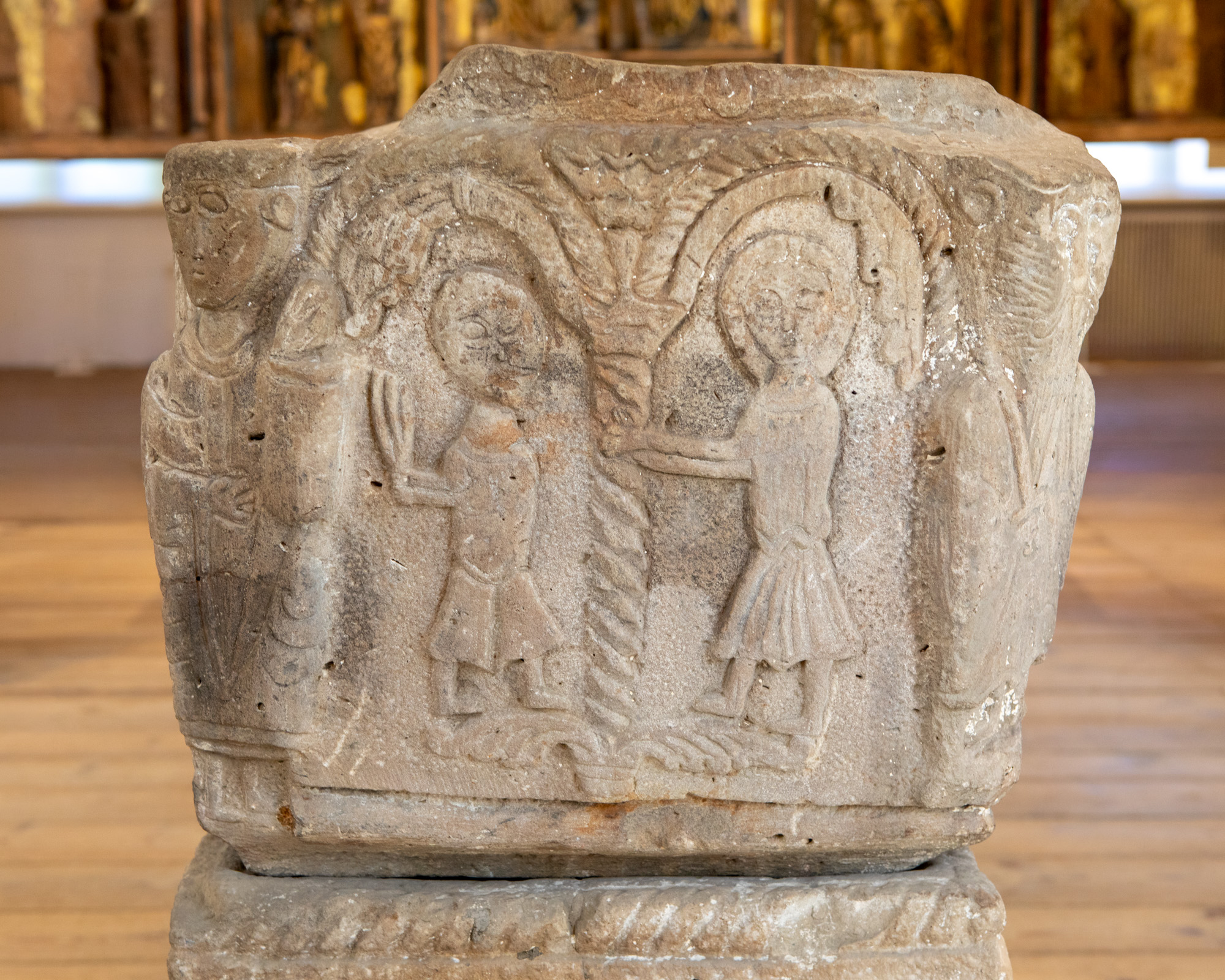Syndefaldet. Adam og Eva står på hver side af træet, som slangen slynger sig rundt om. Den ene søger at skjule sig med gren med blade. Over dem rester af to rundbuer.