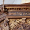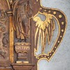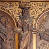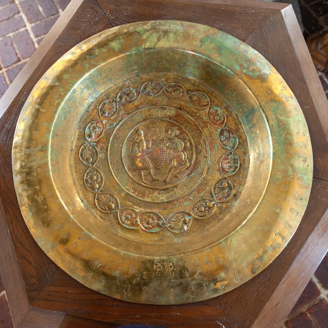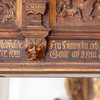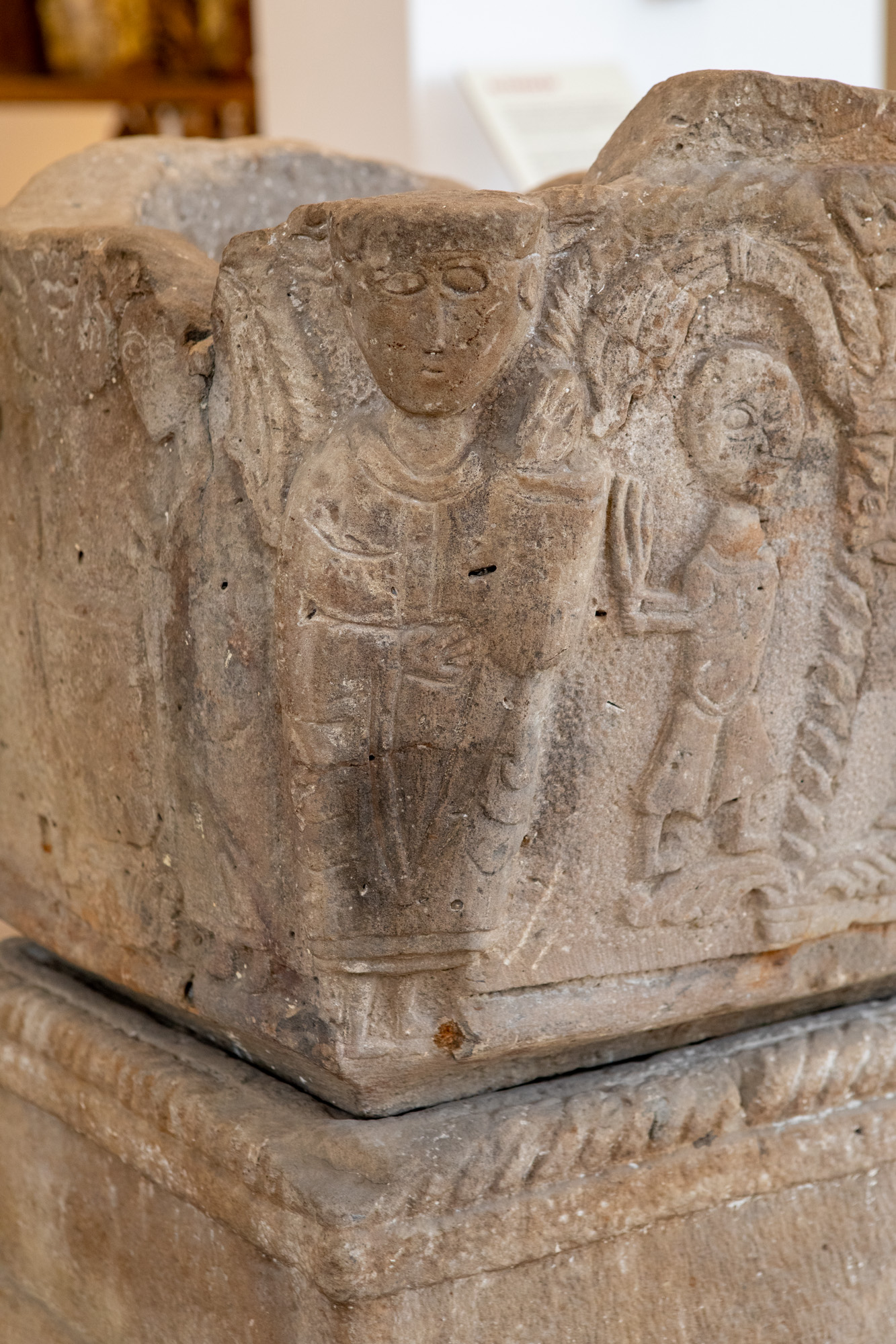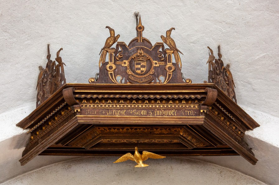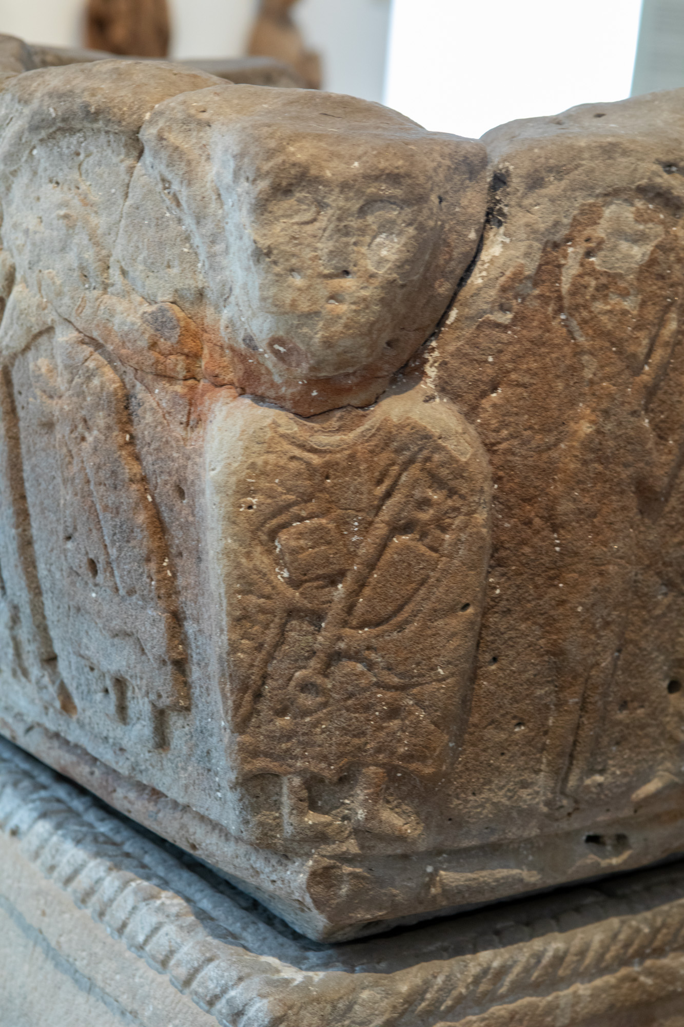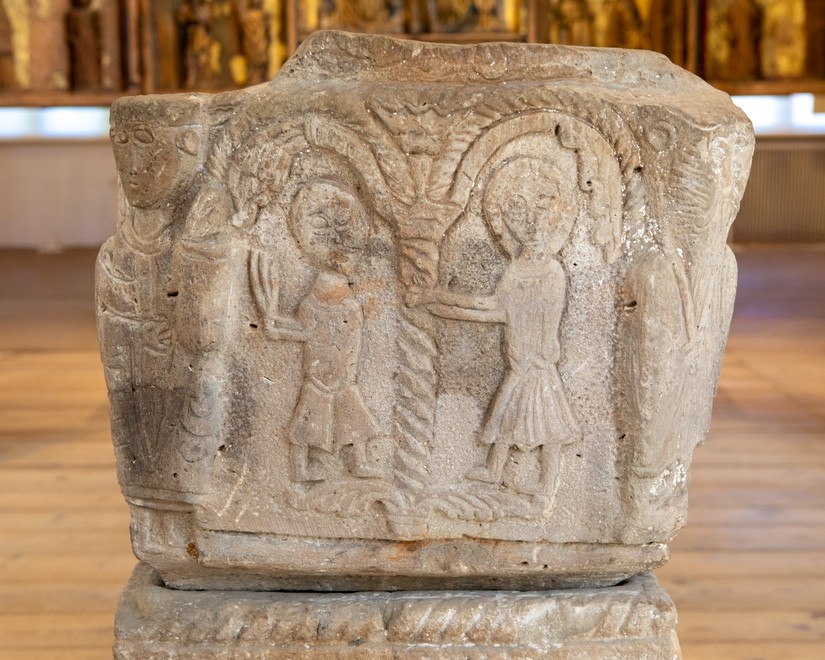 På hvert hjørne er der en figur: Peter med nøgle og bog; Paulus med sværd og langt skæg; en mand med højre hånd løftet og en bog i venstre; en mand med venstre hånd løftet.