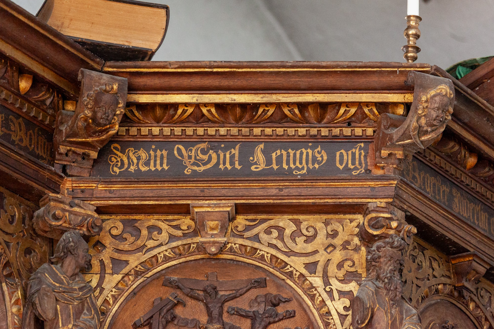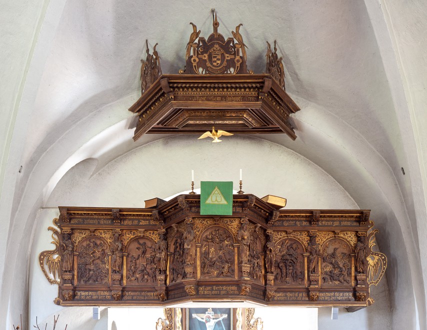 Ved ombygningen af kirken i 1843 blev prædikestolen taget ned og genopsat i kirkens vestende som pulpitur. Men allerede i 1873 blev den taget ned og lå en tid i våbenhuset. I 1880’erne blev den flyttet til det nærliggende Rossendal slot, hvor den blev gemt på loftet. Efter en ødelæggende brand i kirken i 1929, hvor meget af kirkens inventar gik tabt, blev den i 1932 genopsat på sin oprindelige plads.