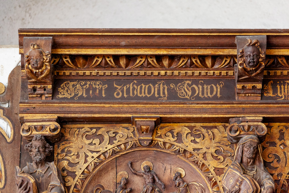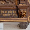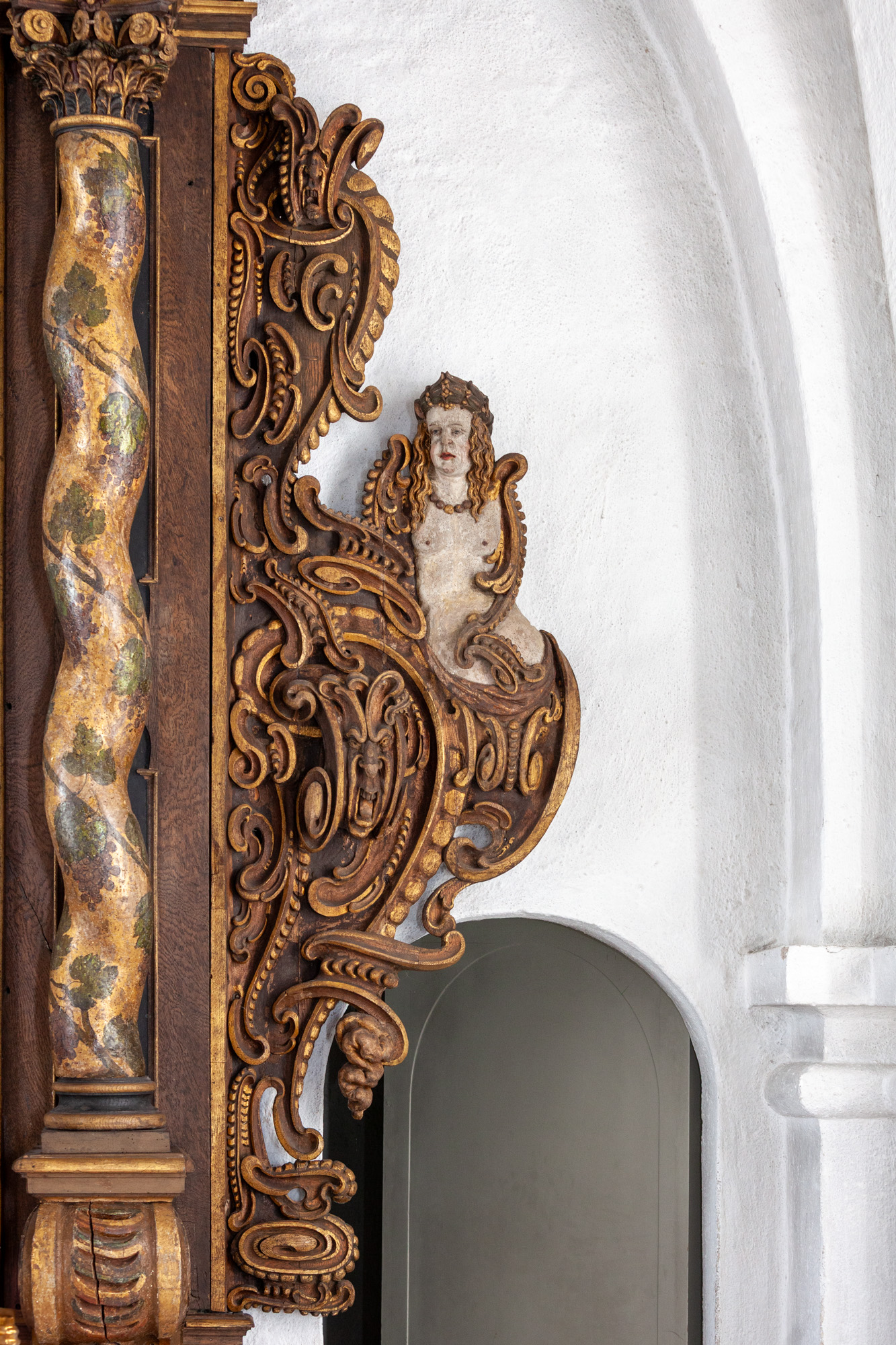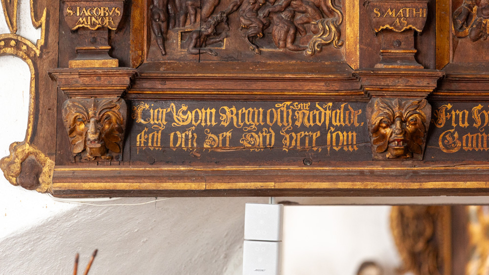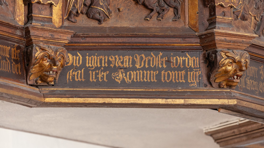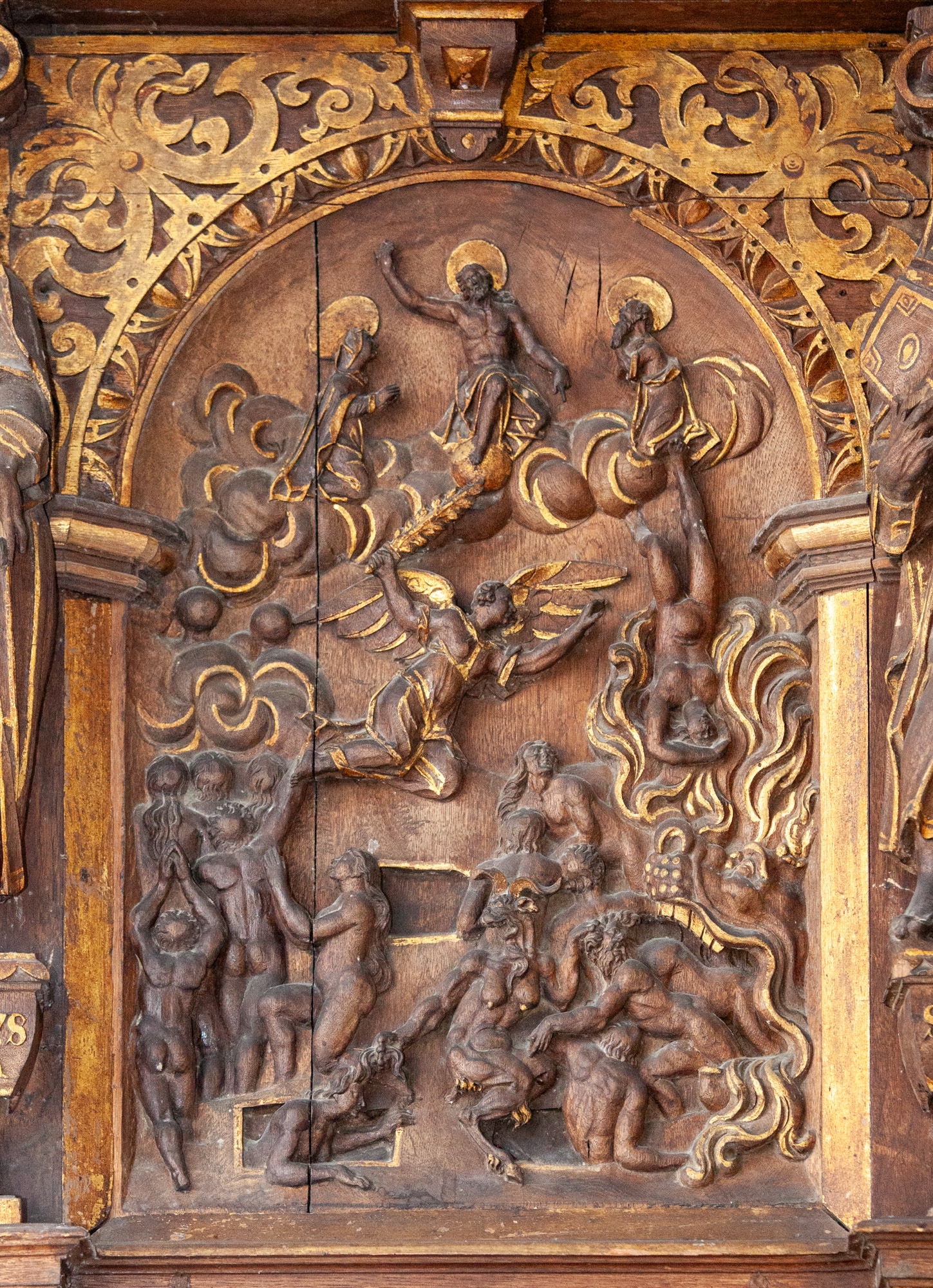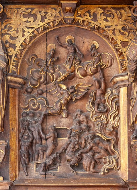 - Verdensdommen. Øverst sidder Kristus som verdensdommeren på jordkloden flankeret af Maria og Johannes, der går i forbøn. Forneden til venstre rejser de døde sig af gravene. Midt i billedet driver en engel de fortabte ned i helvedes gab.