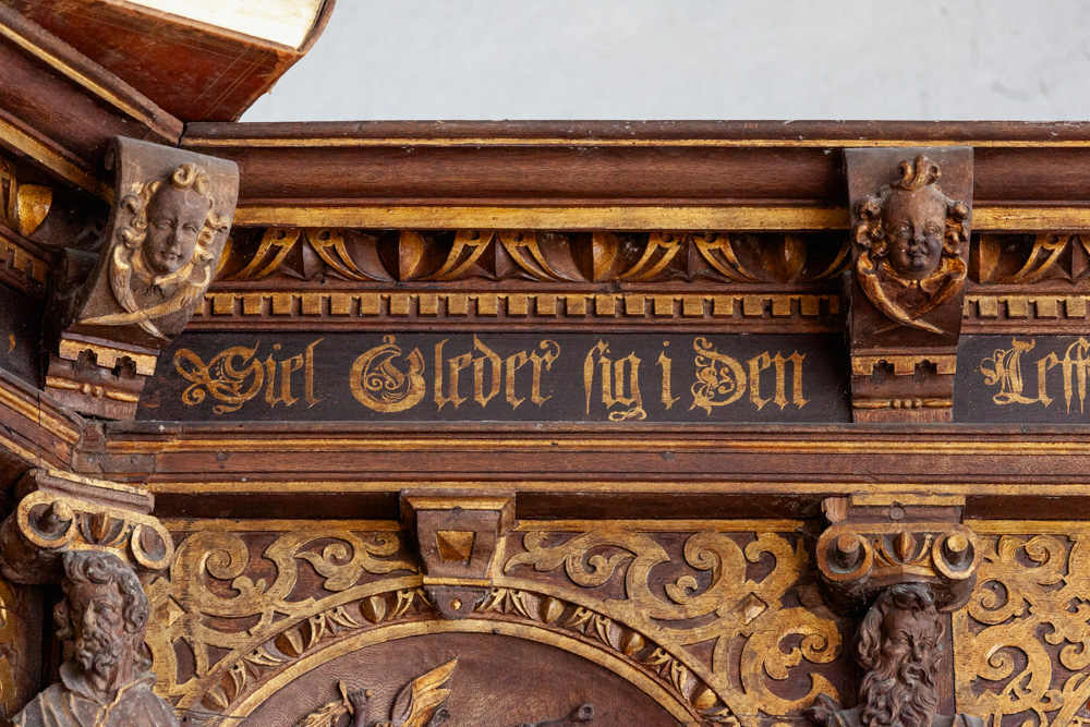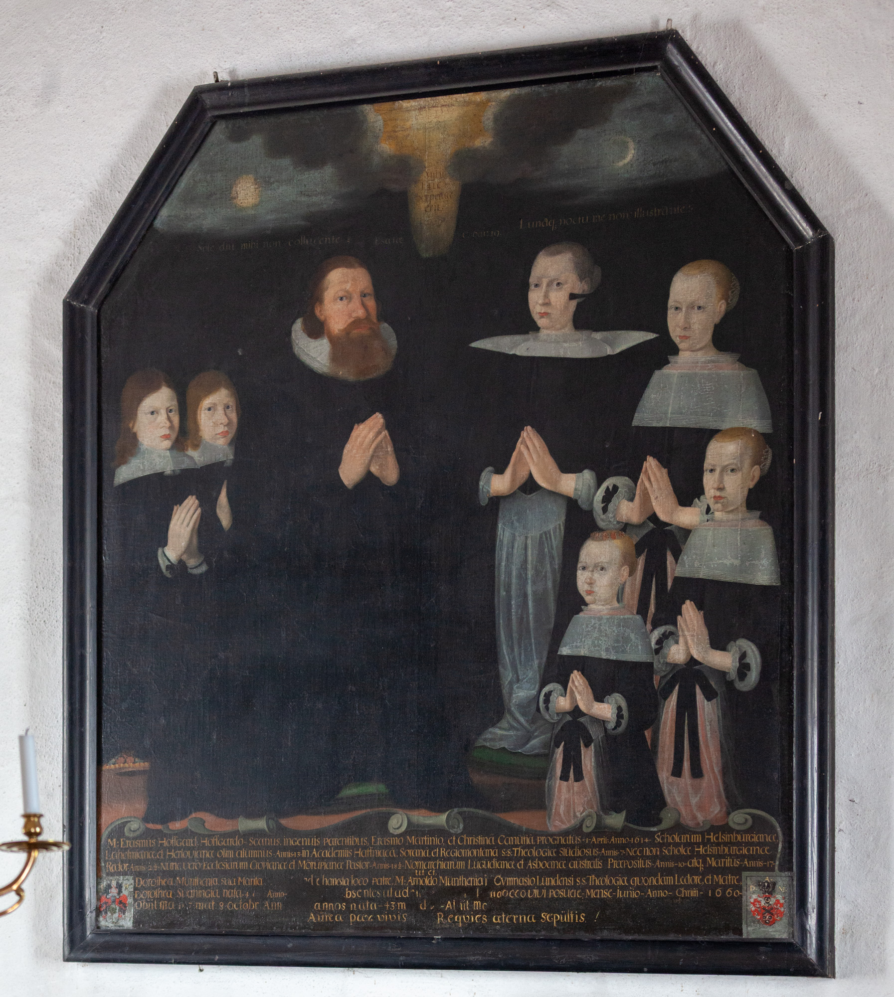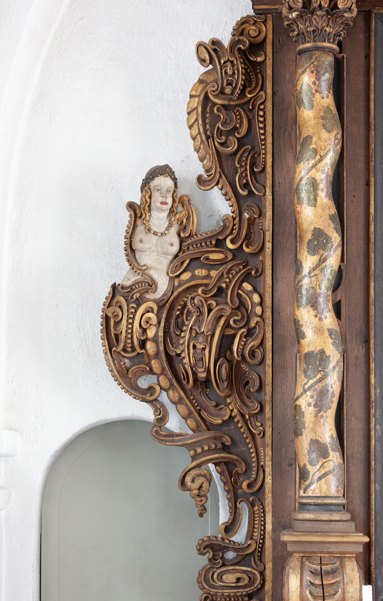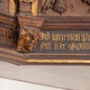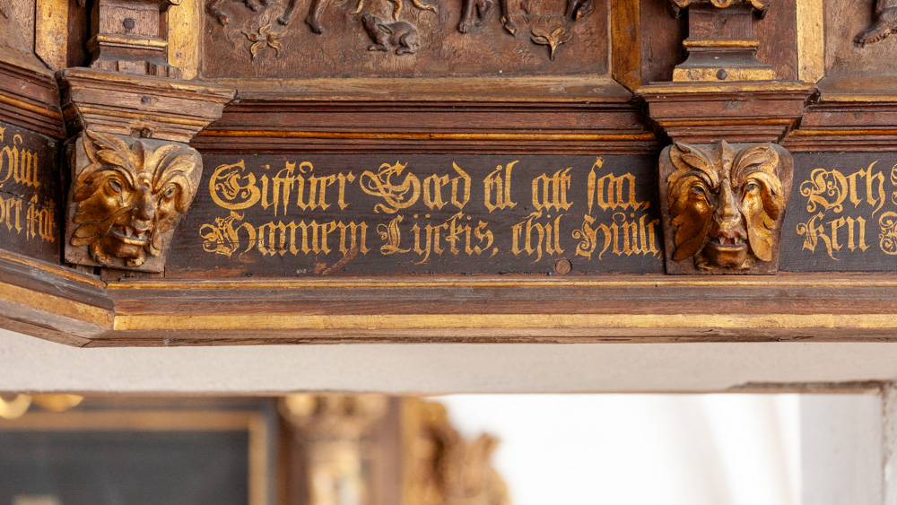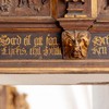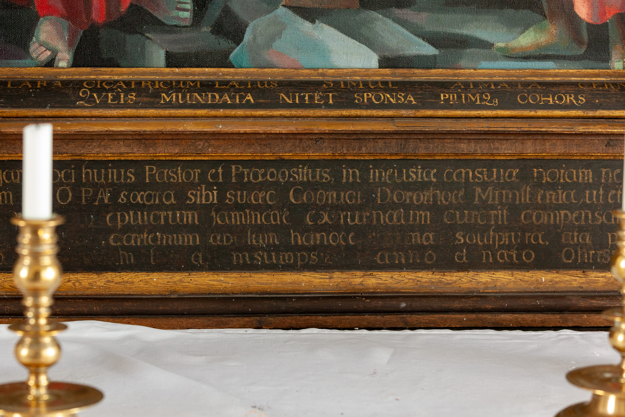 - Verdensdommen. Øverst sidder Kristus som verdensdommeren på jordkloden flankeret af Maria og Johannes, der går i forbøn. Forneden til venstre rejser de døde sig af gravene. Midt i billedet driver en engel de fortabte ned i helvedes gab.