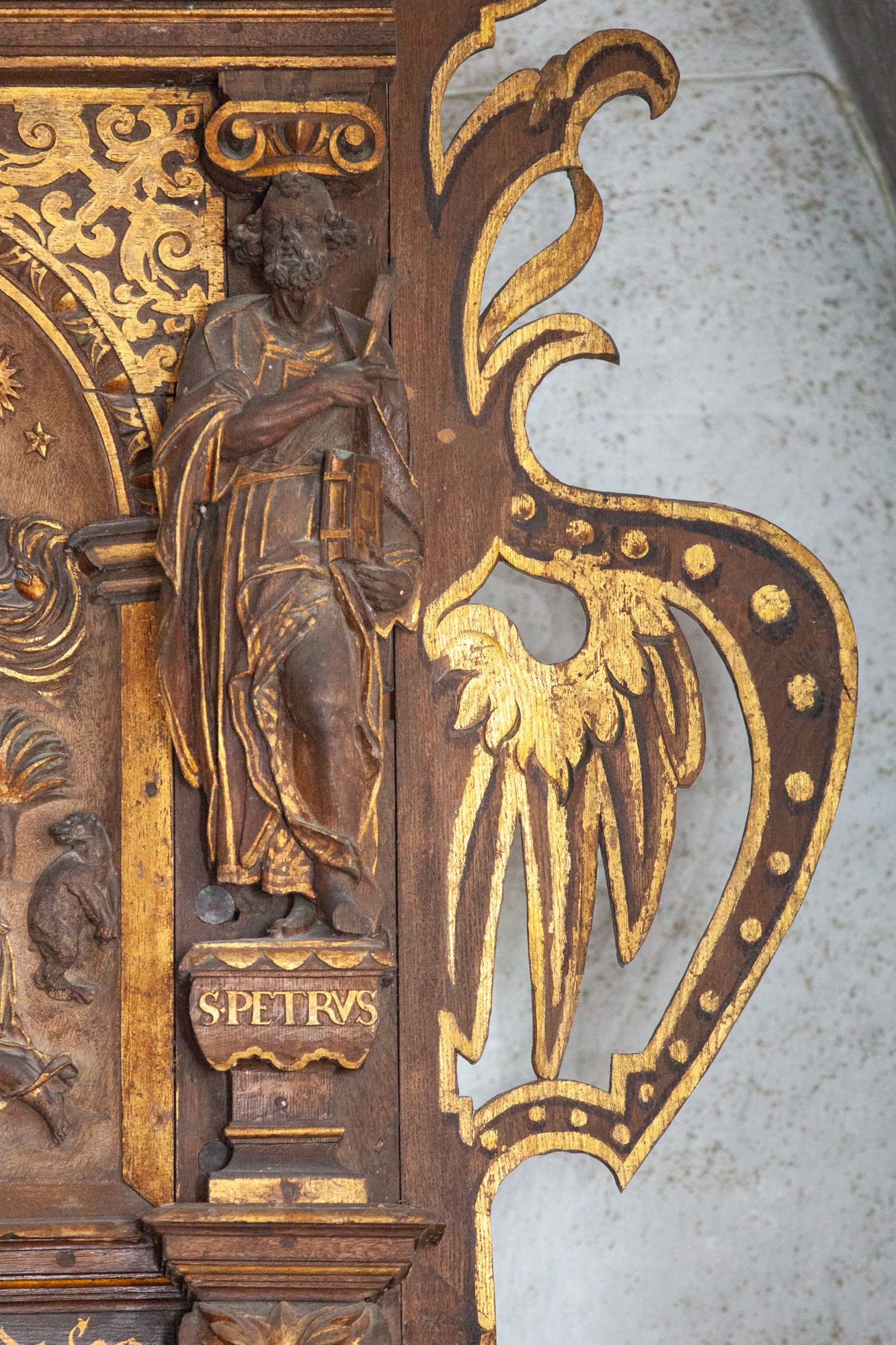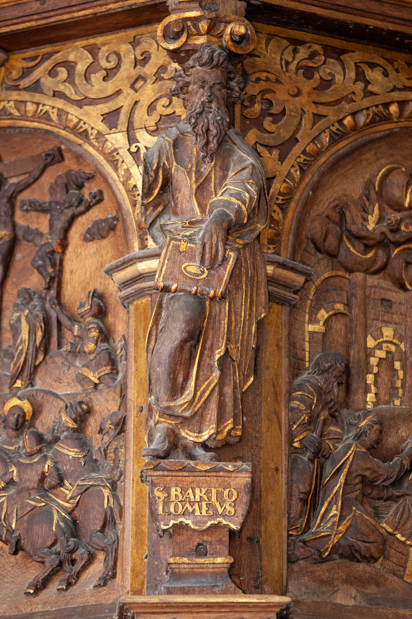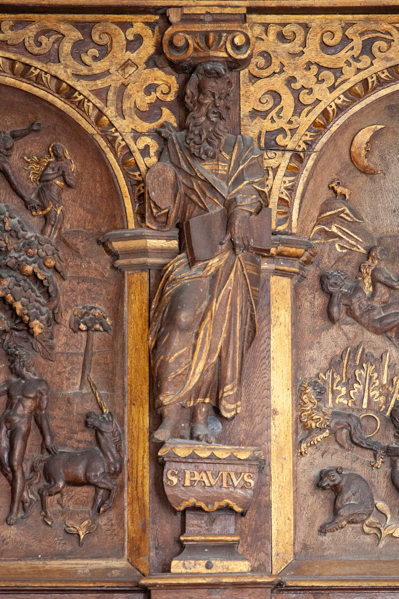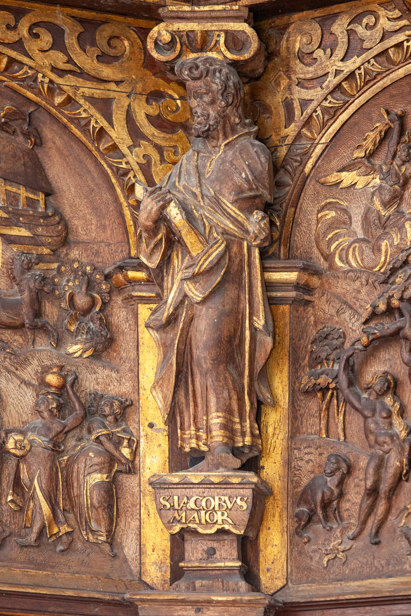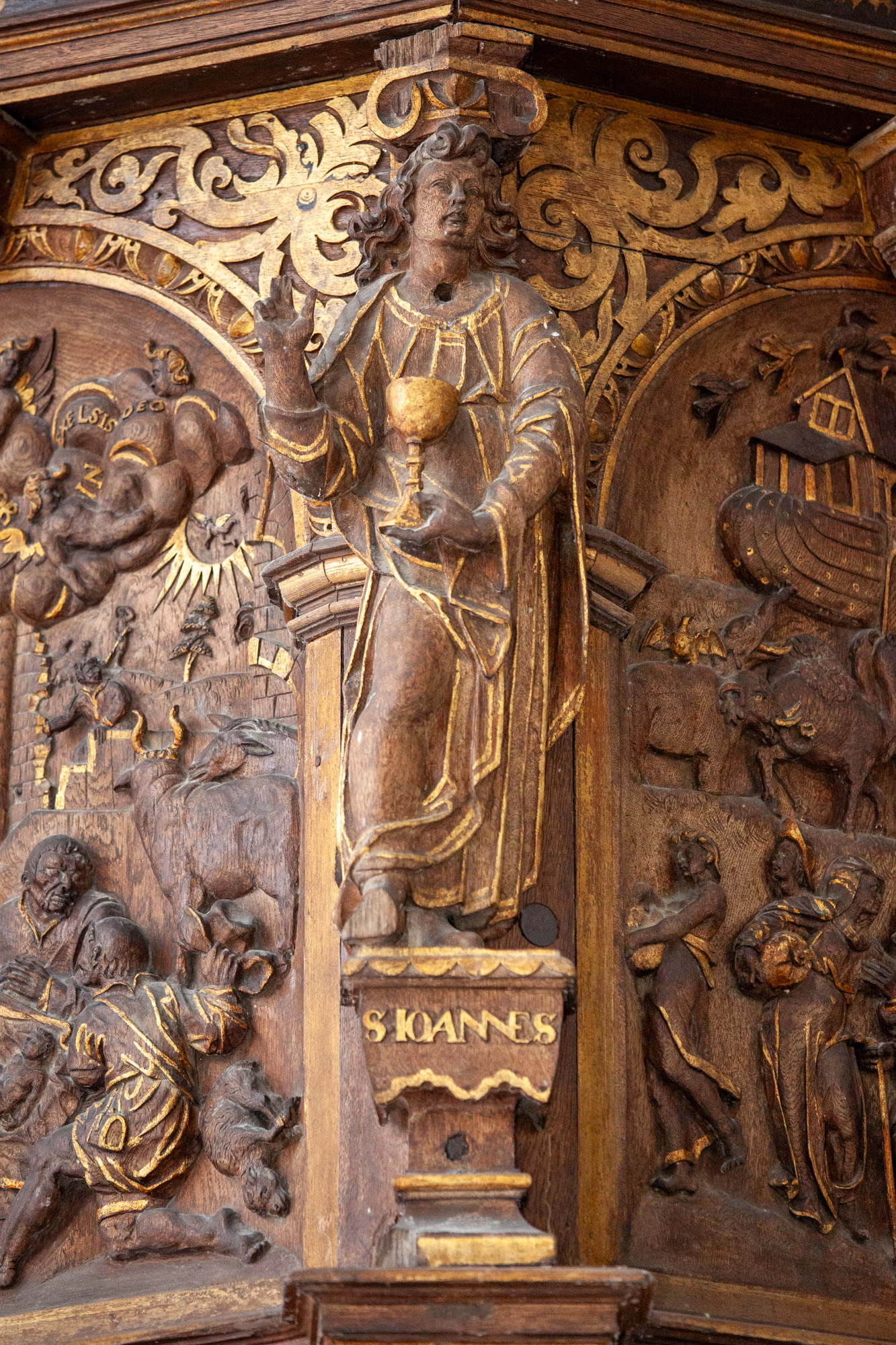 De syv storfelter flankeres af otte apostle. Navnene er anført på postamentet for hver figur. De er livfuldt skildrede med karakterfulde ansigter. Udover apostlene har prædikestolen små vinger.