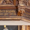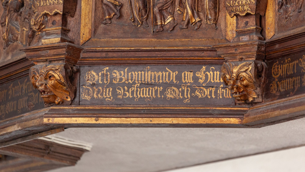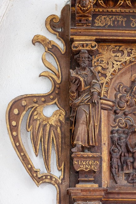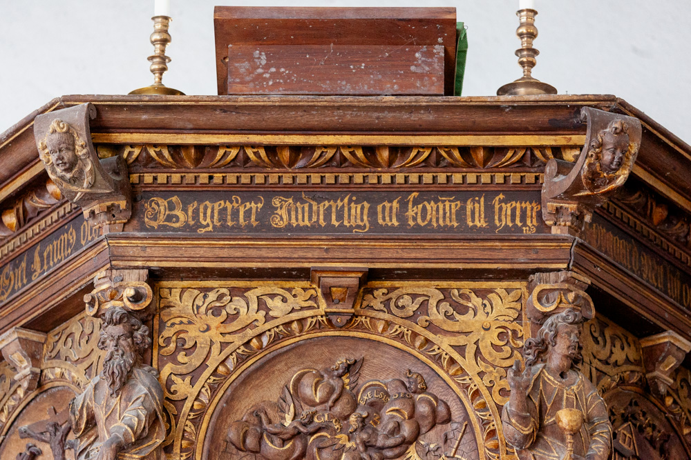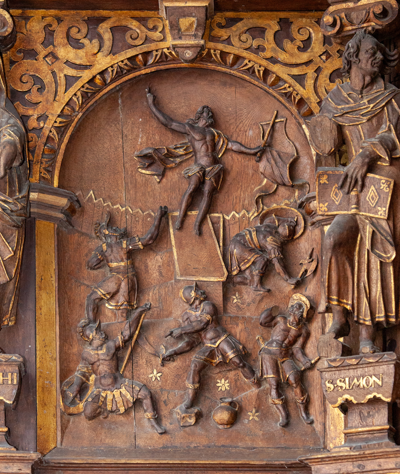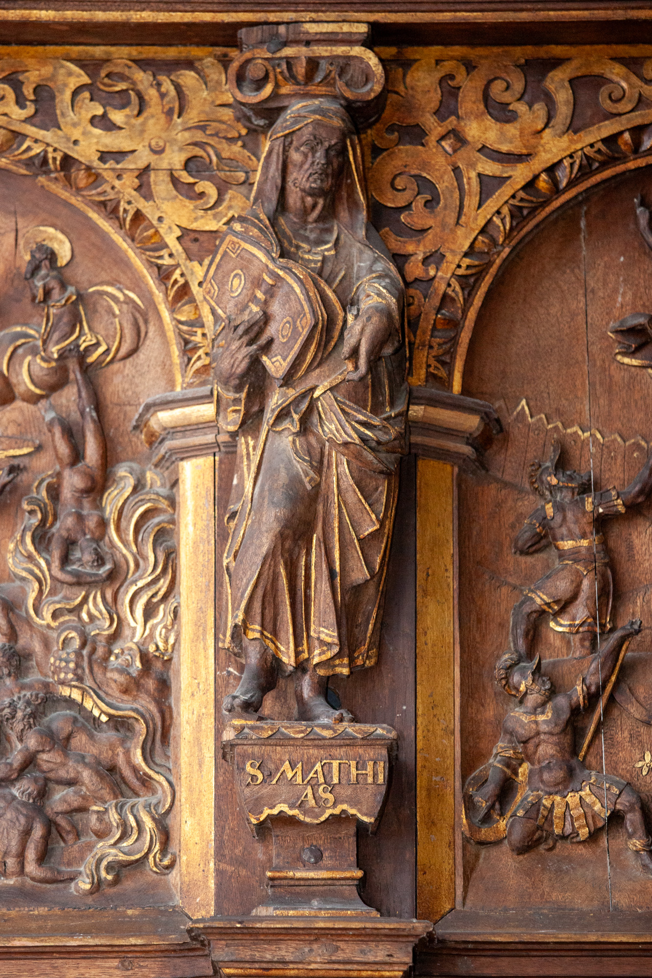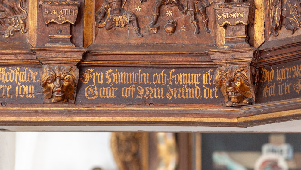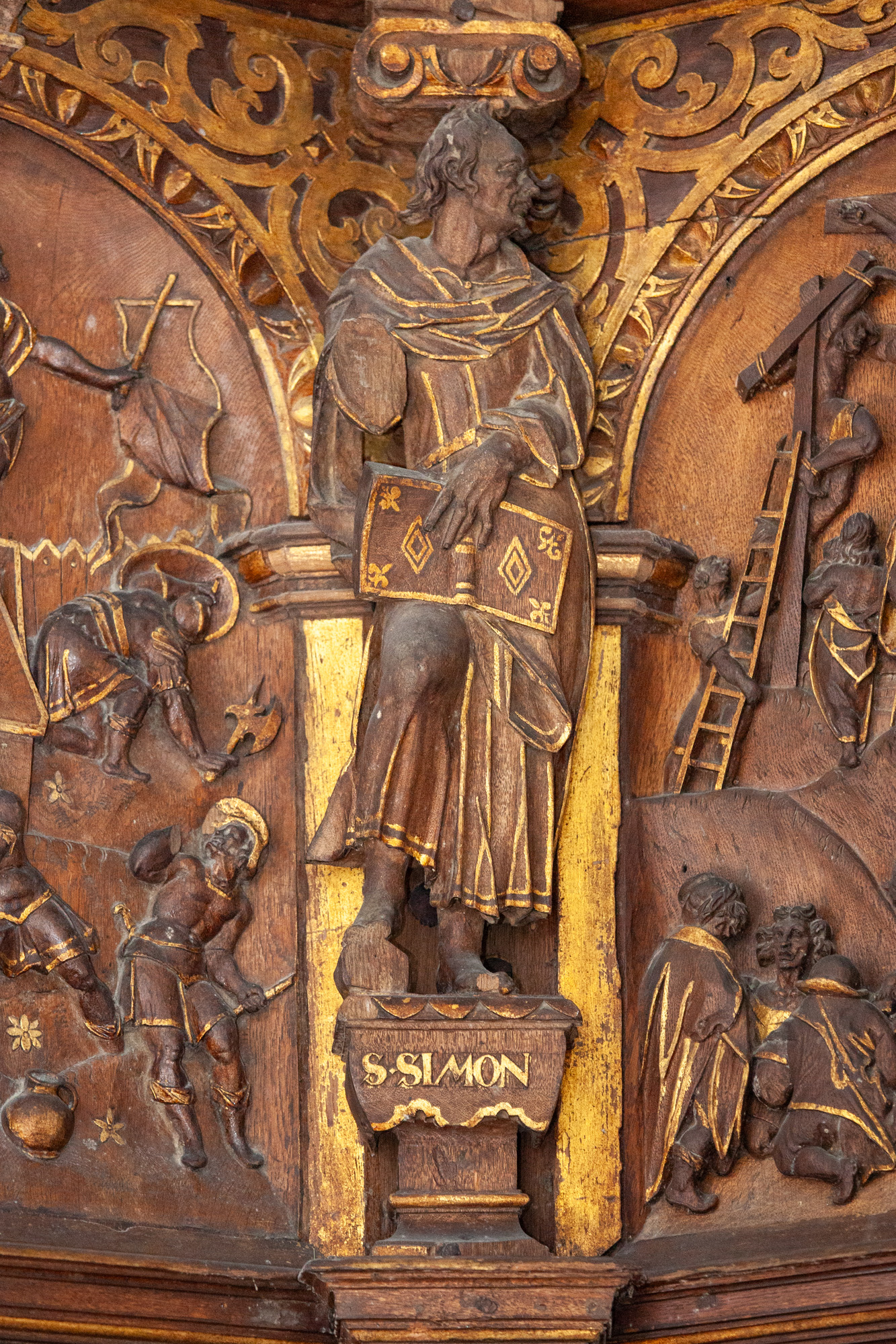 De syv storfelter flankeres af otte apostle. Navnene er anført på postamentet for hver figur. De er livfuldt skildrede med karakterfulde ansigter. Udover apostlene har prædikestolen små vinger.