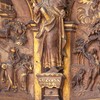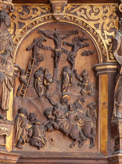 - Korsfæstelsen med de tre kors på Golgata. De to røvere har forvredne kroppe, mens der er en særlig værdighed over den måde, Kristus hænger på. Bødlen er lige blevet færdig med den sidste røver og er i færd med at tage stigen ned. Nedenfor korset står de sørgende Maria og Johannes. En soldat med hjelm og åbent visir knæler for Jesus. Midt i scenen forneden ligger den terning, som vagterne brugte til at spille om hans kappe. Et par soldater til hest og én med brynje gestikulerer.