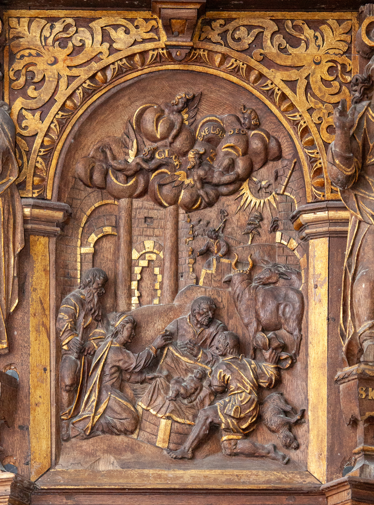 - Jesu Fødsel. Øverst forkyndes Jesu fødsel for hyrderne i form af englekoret, der synger: Gloria in Ex[c]elsis Deo. Under skyen står en lille hyrde med stav i hånden foran sine får og spejder mod stjernen. (Stjernen forekommer ikke i beretningen om hyrderne, men hører derimod hjemme i fortællingen om vismændene, der kom for at tilbede.) Nederst er stalden, hvor hyrderne kommer ind og beretter, hvad englen har fortalt dem.