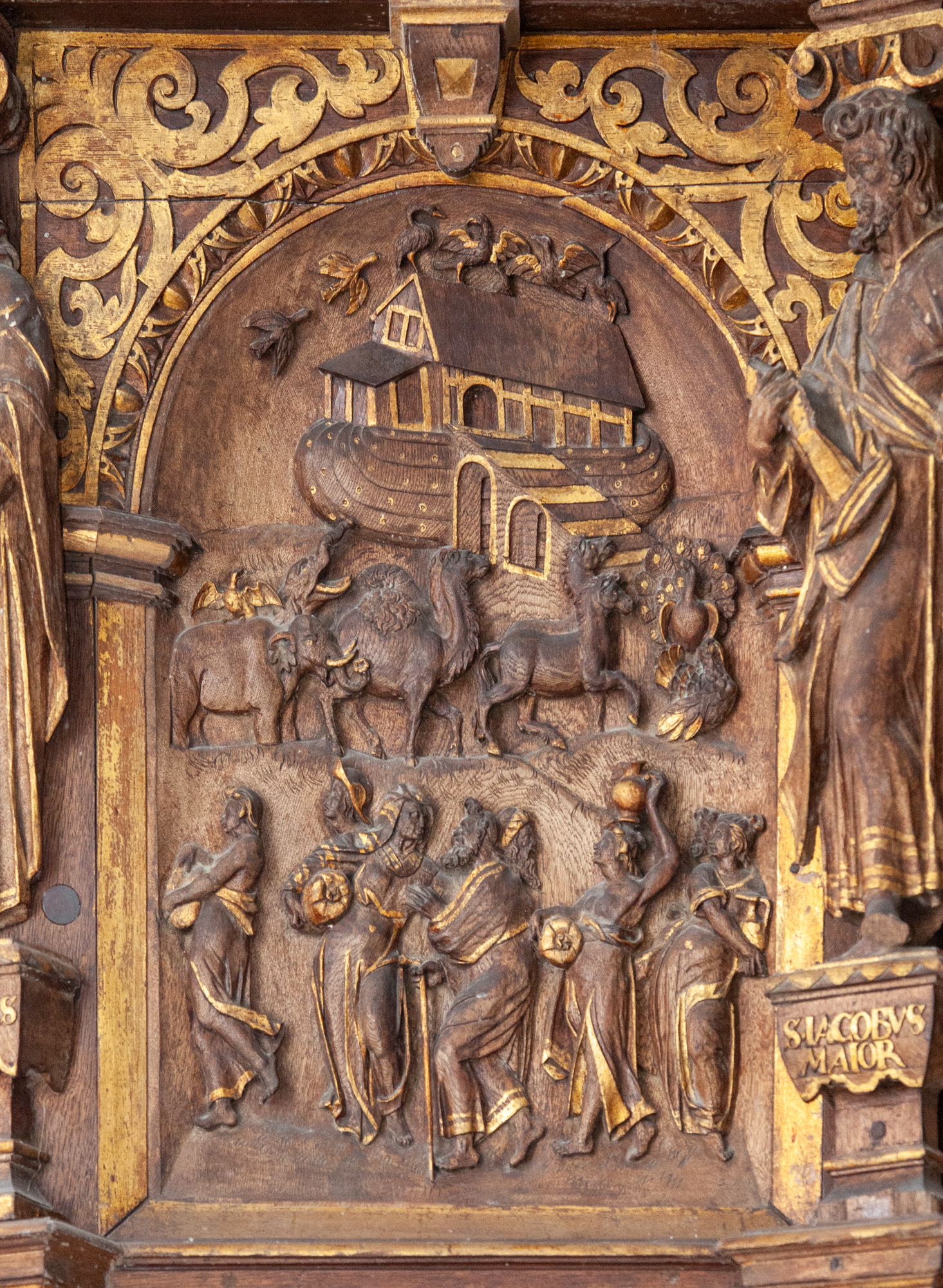 - Noahs Ark. Sejladsen er endt. Mennesker og dyr går i land. Dyrene kommer parvis: to elefenater, to dromedarer, to heste og to påfugle. Nederst i billedet kommer menneskene belæsset med, hvad de måtte have haft tilbage af diverse forråd. Øverst ses arken og flere fugle.