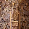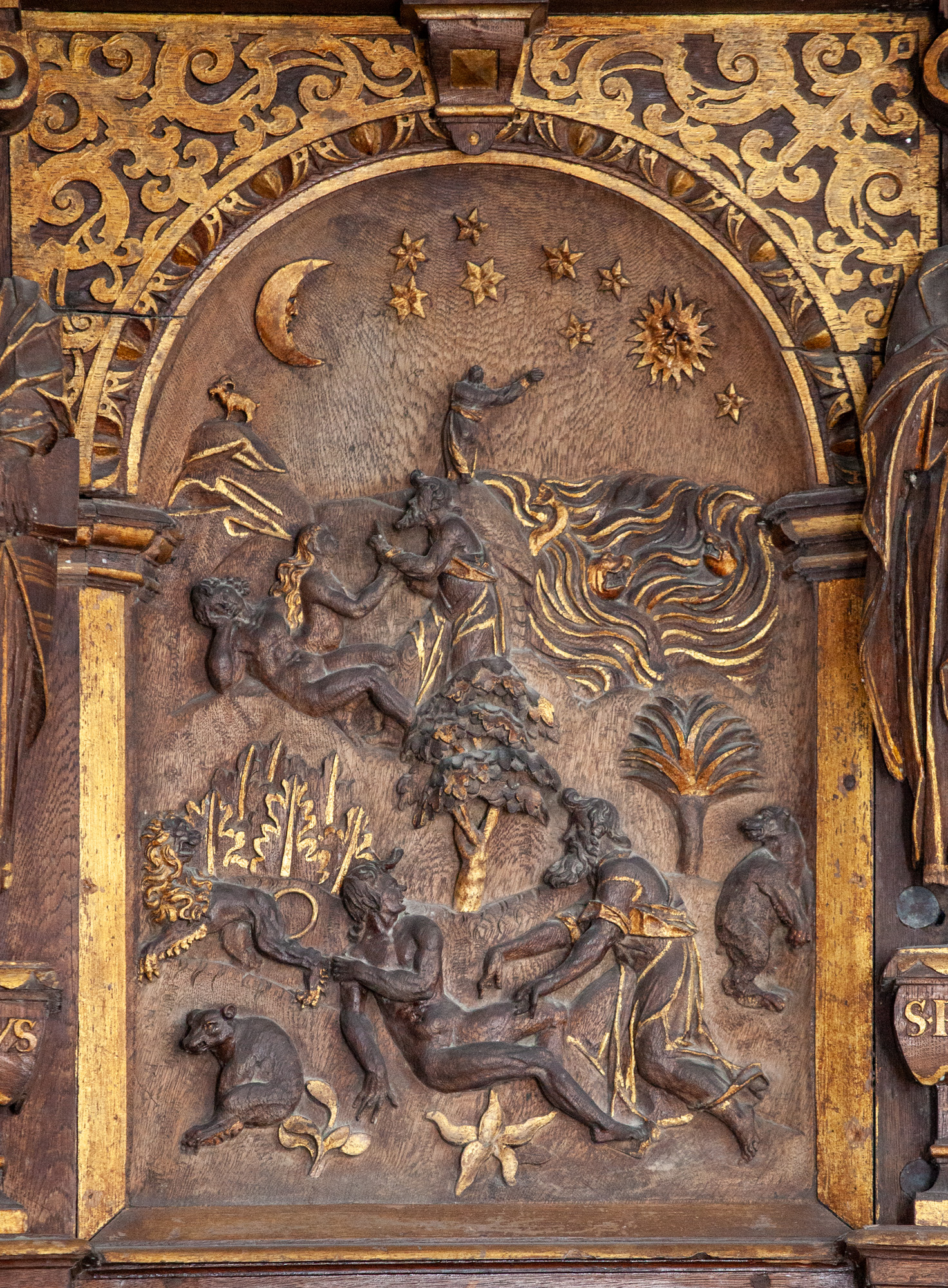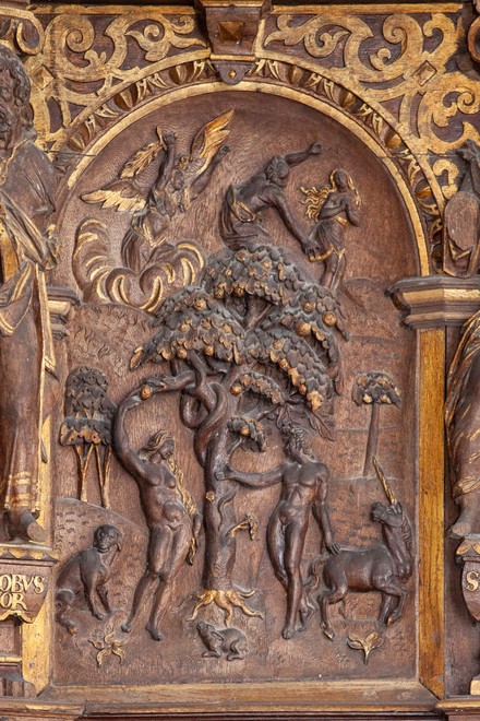 - Syndefaldet, hvor slangen rækker æblet til Eva, mens Adam rækker hånden ud mod hende. De er omgivet af en stor og en lille hund samt en enhjørning. Øverst i billedet fremstilles Uddrivelsen med megen dramatik.