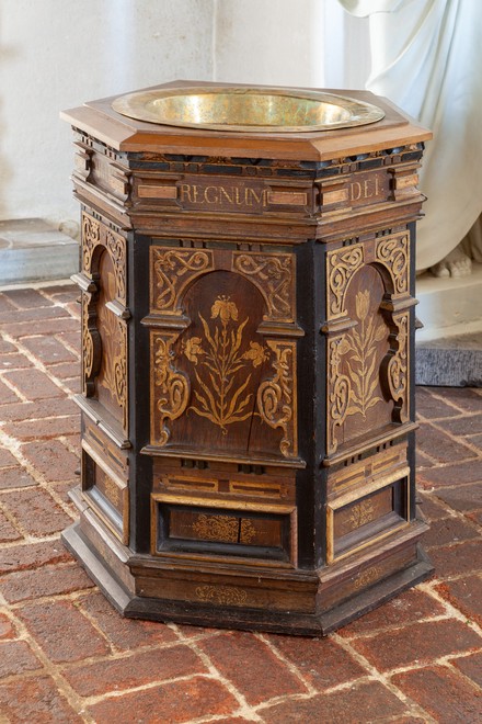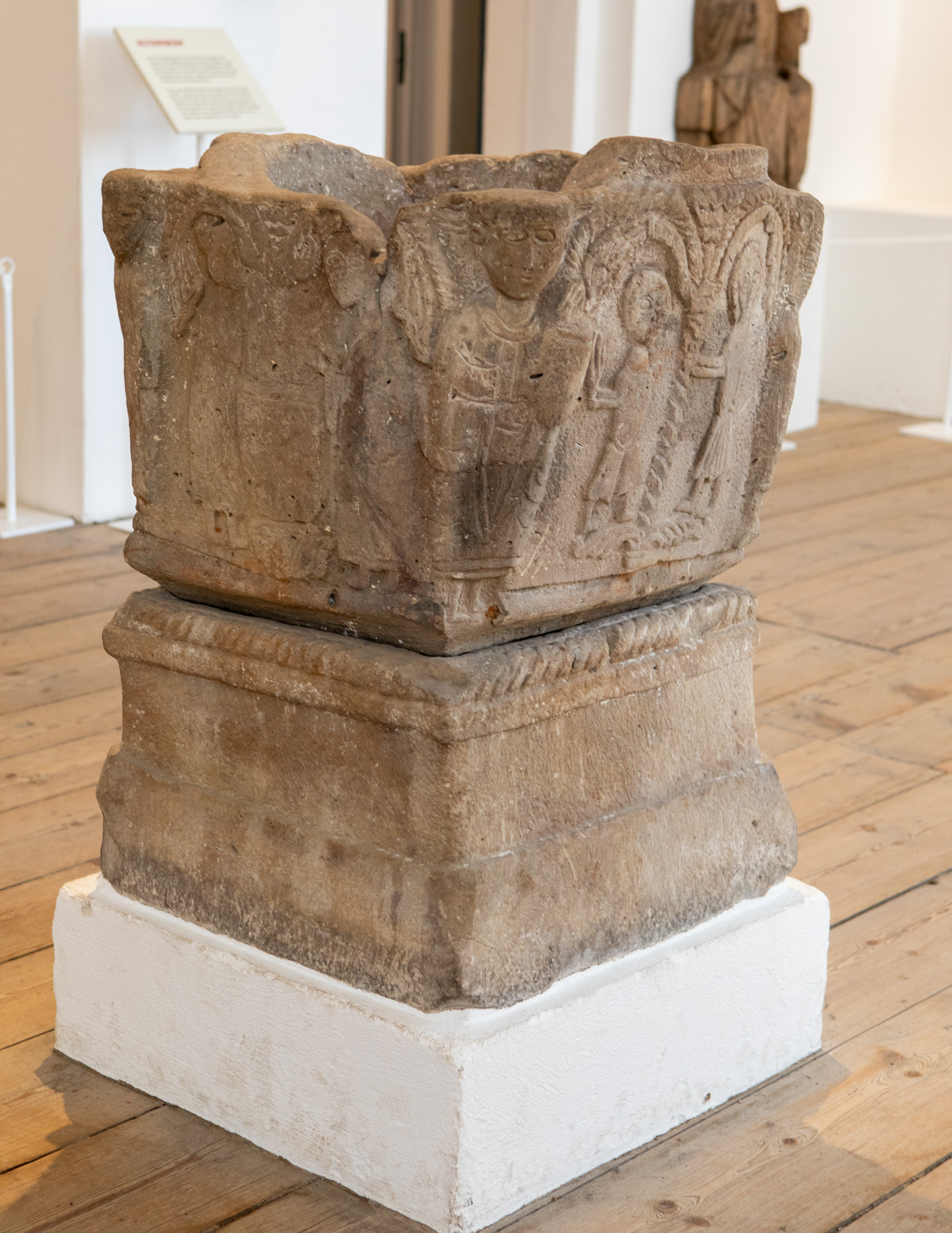 Døbefont, som er af sandsten, opbevares på LUHM. Den er firkantet, mens udhulingen er rund. Der er hverken fals eller afløbshul. Man er dog begyndt med at hugge et hul, men har afbrudt arbejdet og fyldt bly i.