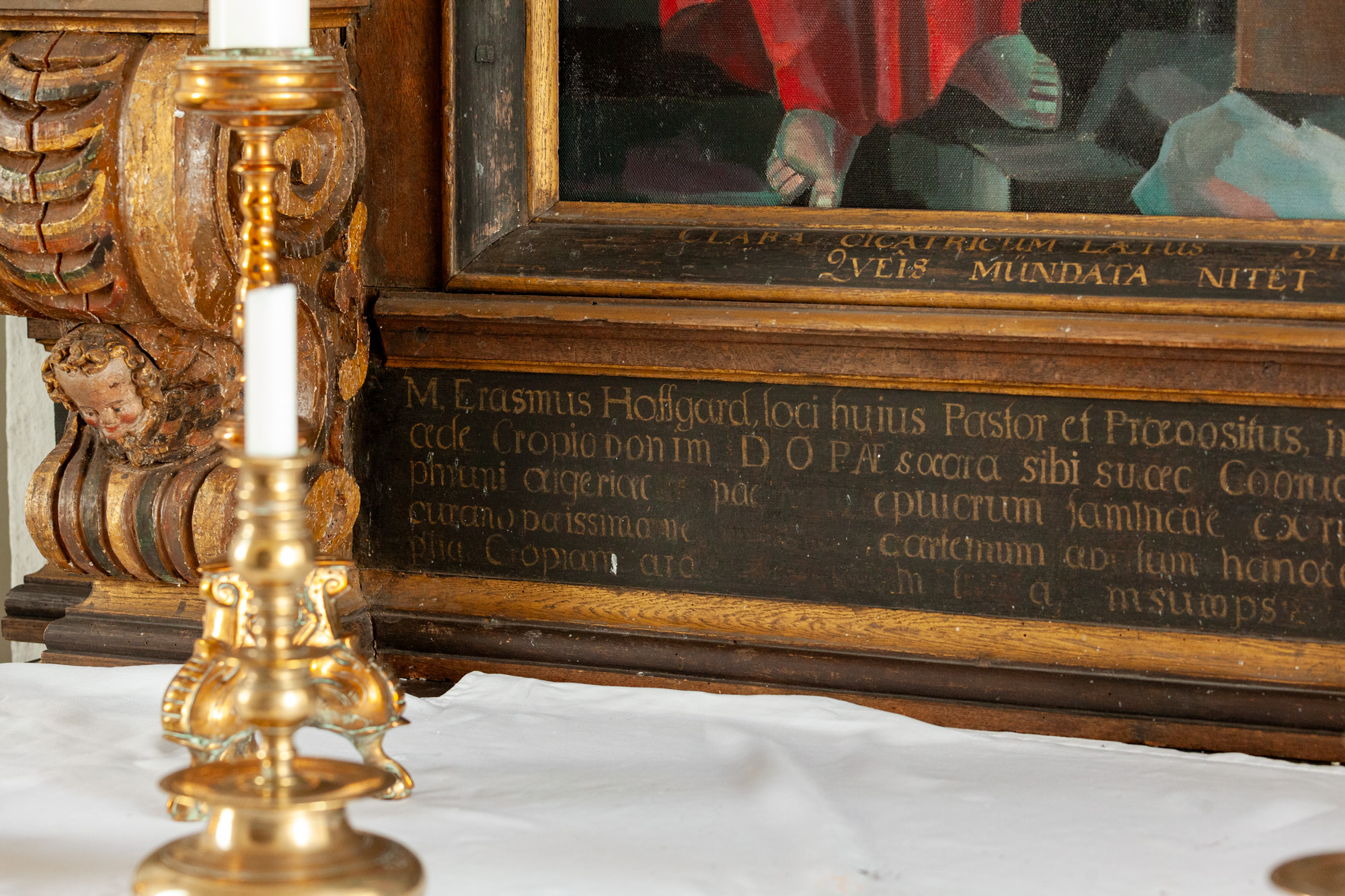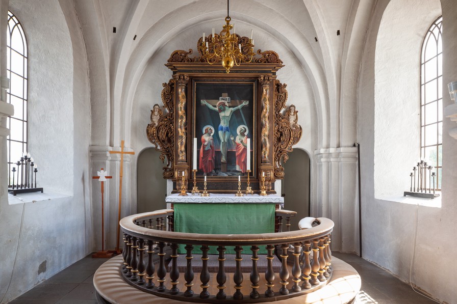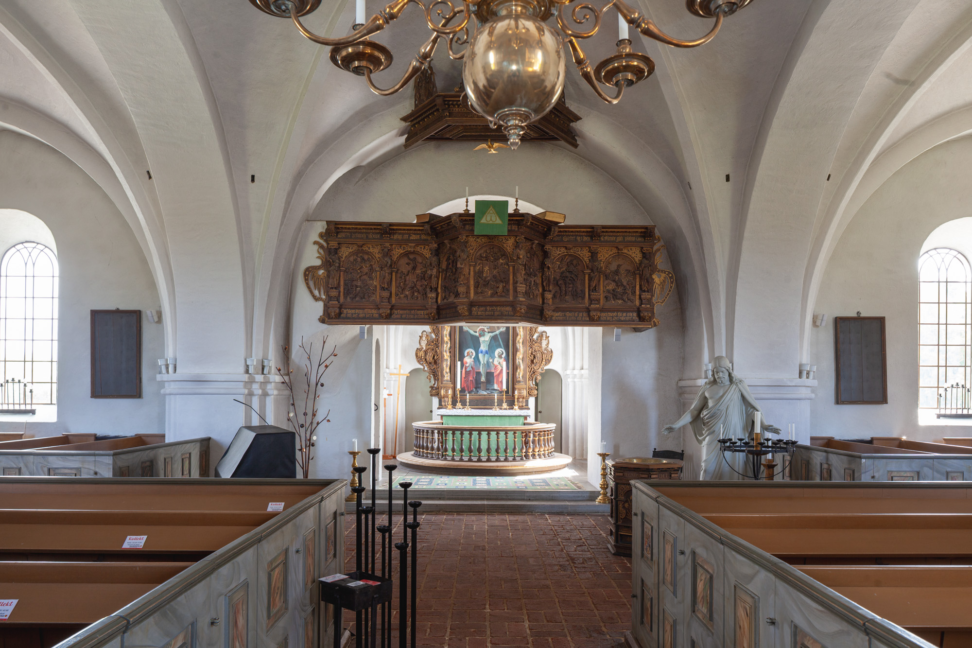 Altertavlen er fra 1668 og er en af de få fra denne periode. Den bærer Rasmus Hafgaards navn, se epitafiet nedenfor. Billedet er udført af Per Siegård 1929.