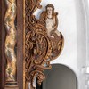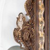 Mikael Dragedræber ses I buen til venstre. Han holder et lille skjold i højre hånd og lansen i den anden. Dragens hale ligger i en sløjfe. Lars Tynell kan se, at Mikael har korsglorie. Figuren til højre er skadet foroven, men vingen viser, at det er en engel.