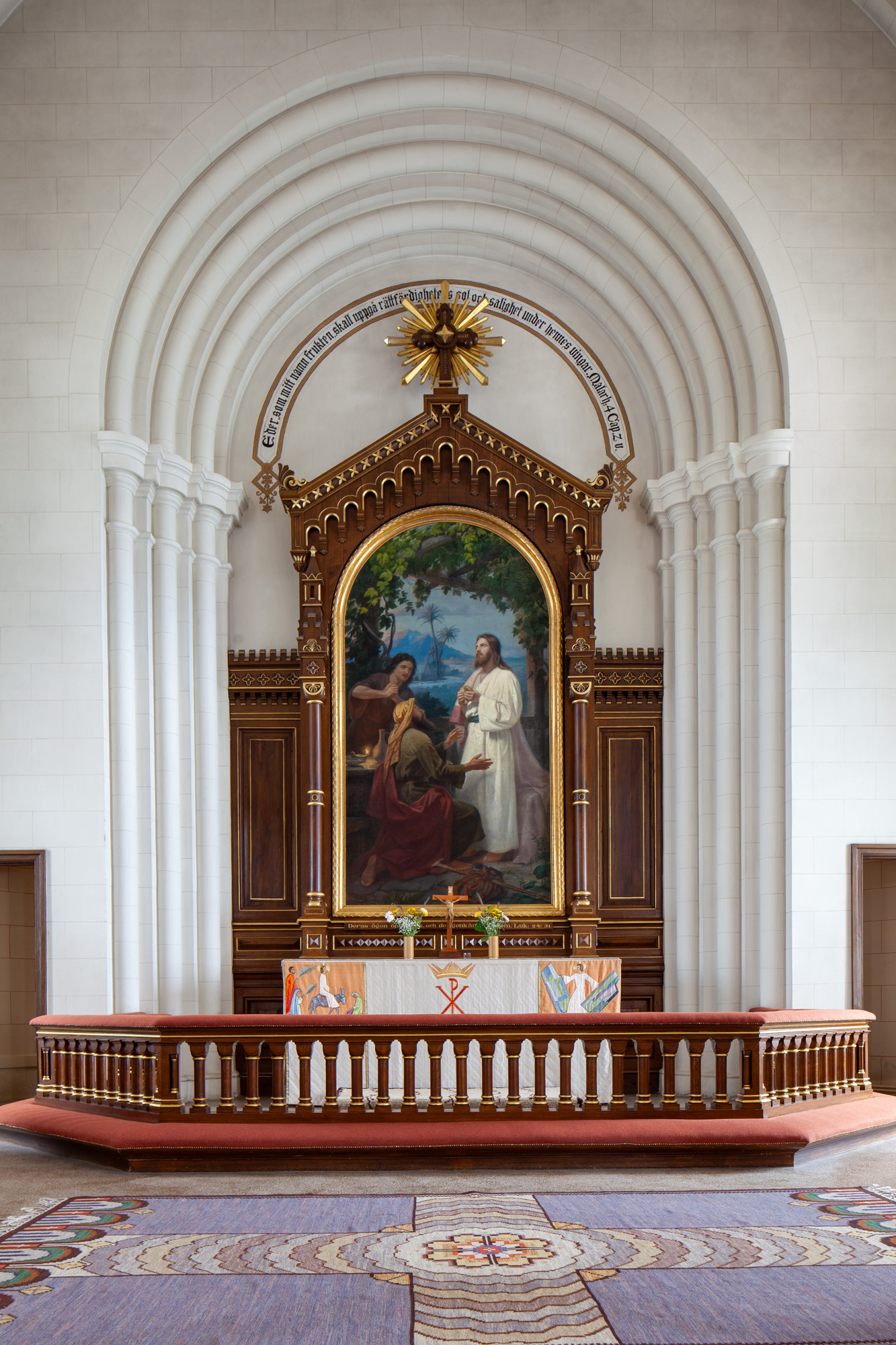 Kristusfigurens hoved er drejet til højre. Tornekronen er snoet. Armene er udstrakte diagonalt og hænder halvt lukkede med bøjede fingre. Sidesåret er diagonalt og placeret lavt. Lændeklædet er kort med en lang fold i højre side, der går bagom kroppen. Fødderne pger nedad med højre fod over venstre.