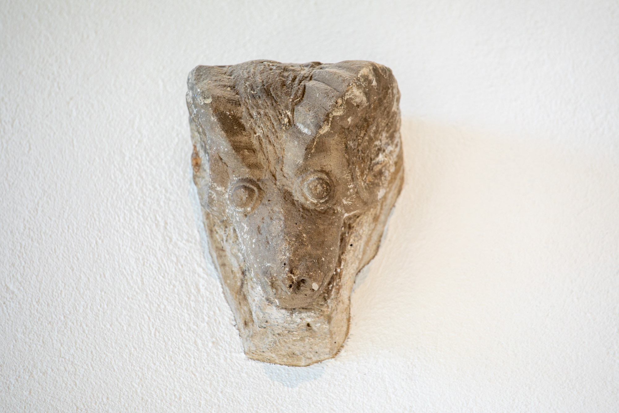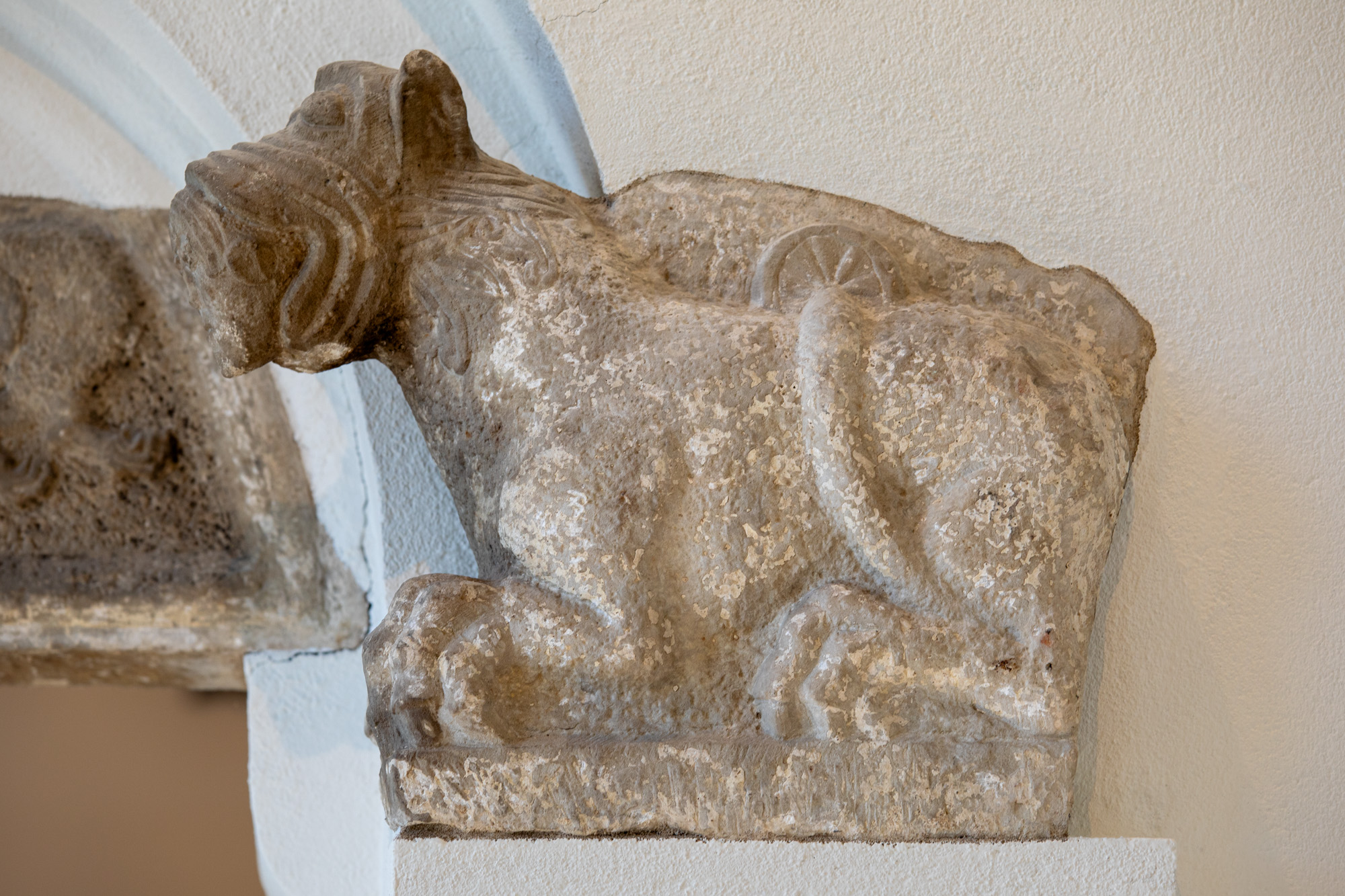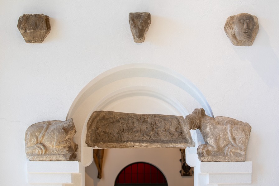En del skulpturer fra den gamle kirke findes på LUHM: en tympanon med to løver, tre konsoller, en kapitæl og en snoet søjle. Det antyder, at den har haft en blindarkade med konsoller og halvsøjler på apsis i lighed med Hør og Hammerlunde. På en af konsollerne findes et vædderhoved og på en anden et brystbillede af en mand. Både løverne og reliefferne i tympanon er tydeligt i Mortens stil, hvor løverne har kraftige manker og karakteristiske klør. Det er dog ikke ham selv, der har hugget dem, men en medarbejder på hans værksted.
