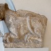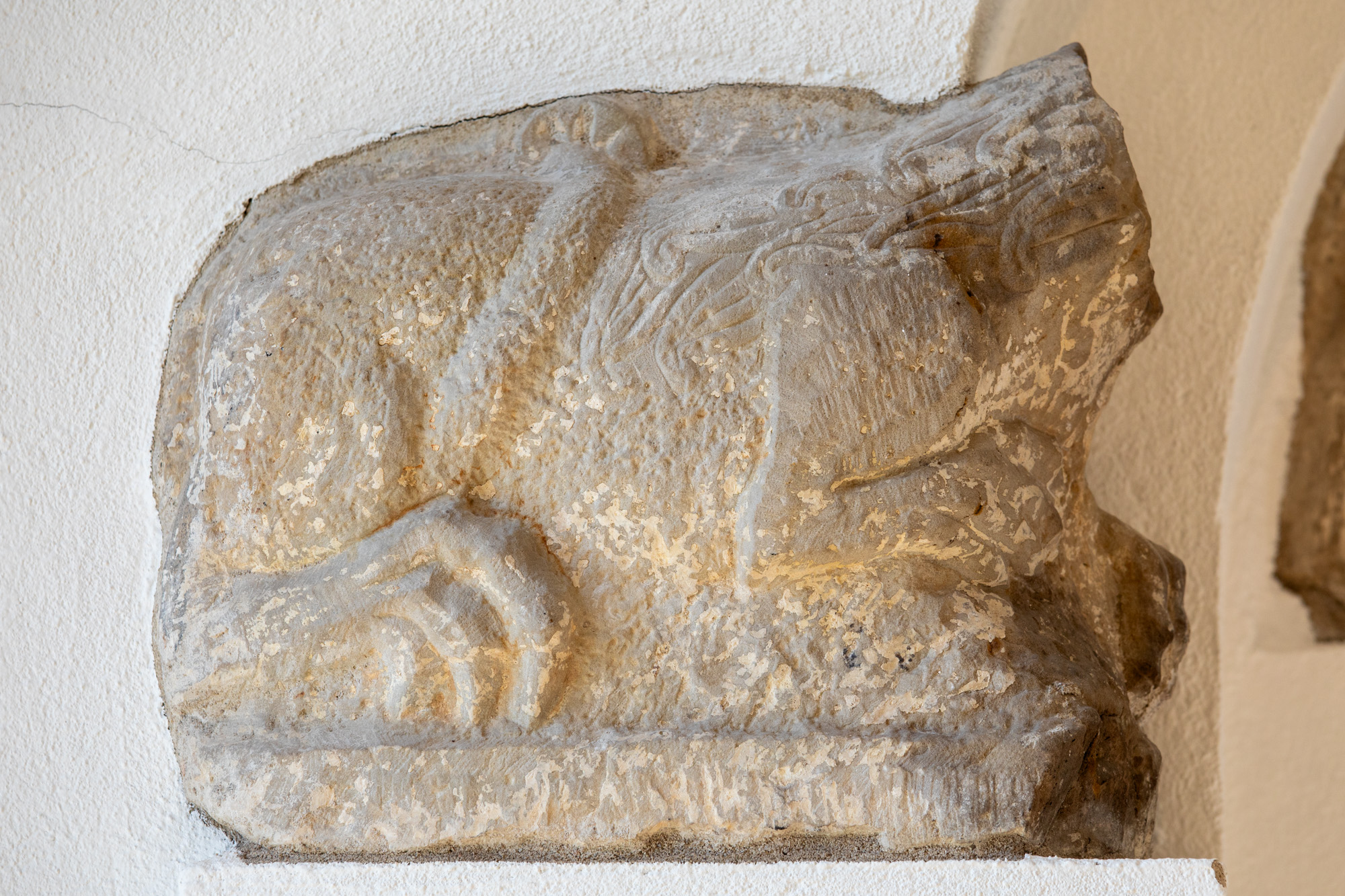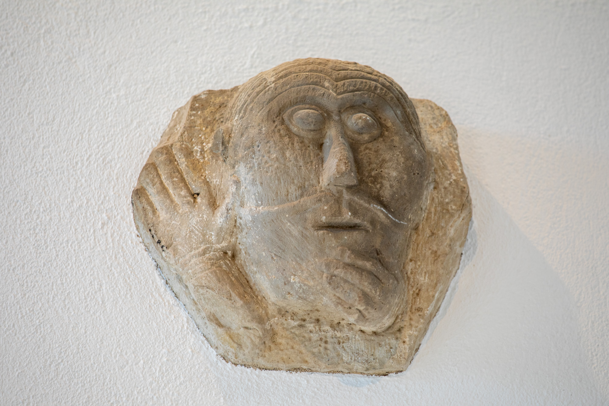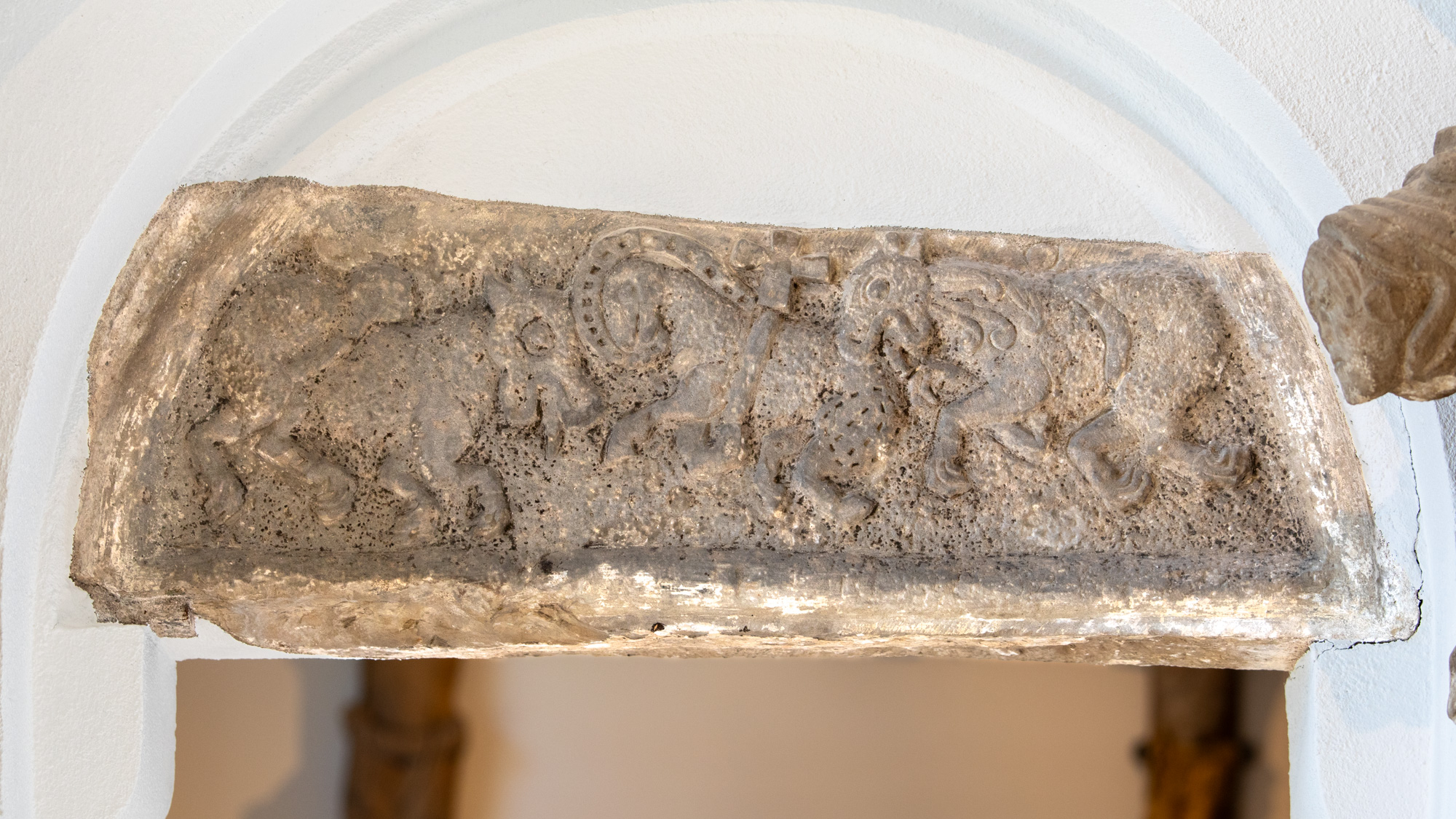 En del skulpturer fra den gamle kirke findes på LUHM: en tympanon med to løver, tre konsoller, en kapitæl og en snoet søjle. Det antyder, at den har haft en blindarkade med konsoller og halvsøjler på apsis i lighed med Hør og Hammerlunde. På en af konsollerne findes et vædderhoved og på en anden et brystbillede af en mand. Både løverne og reliefferne i tympanon er tydeligt i Mortens stil, hvor løverne har kraftige manker og karakteristiske klør. Det er dog ikke ham selv, der har hugget dem, men en medarbejder på hans værksted.