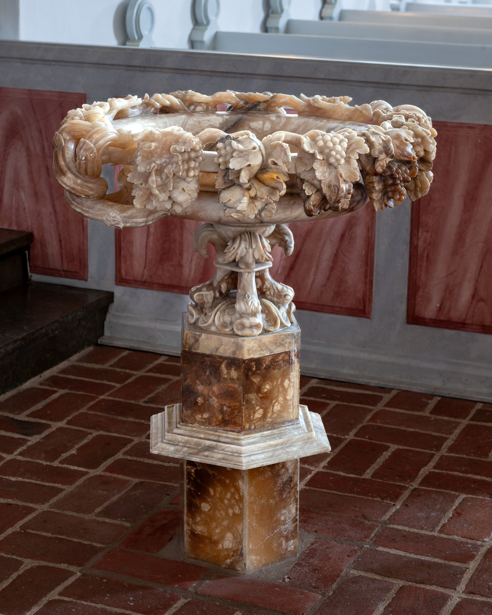 Døbefonten er af alabast og lavet i Italien 1860. Den er lavet som en blomsterkrukke til den russiske zar, men på grund af et skibsforlis drev den i land ved Rydebäck gård. Ejeren af gården skænkede den til Kvistofte kirke.