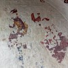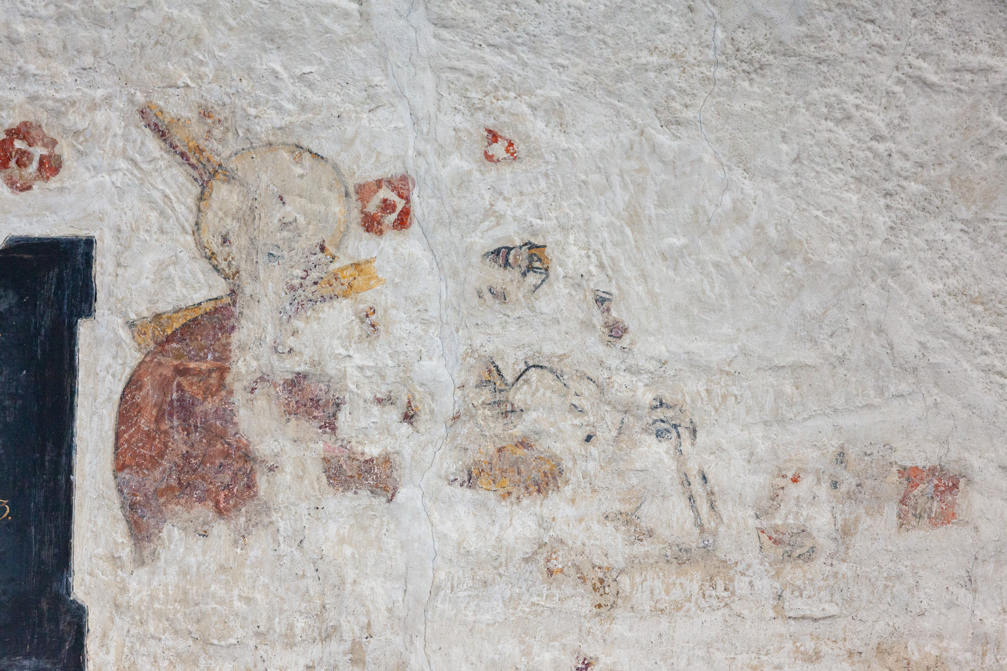 To fragmenter på vestvæggens nordside kan tydes. Øverst ses Korsbæringen. Udfor Jesu hoved ses en hånd fra en bøddel, som holder en stok.