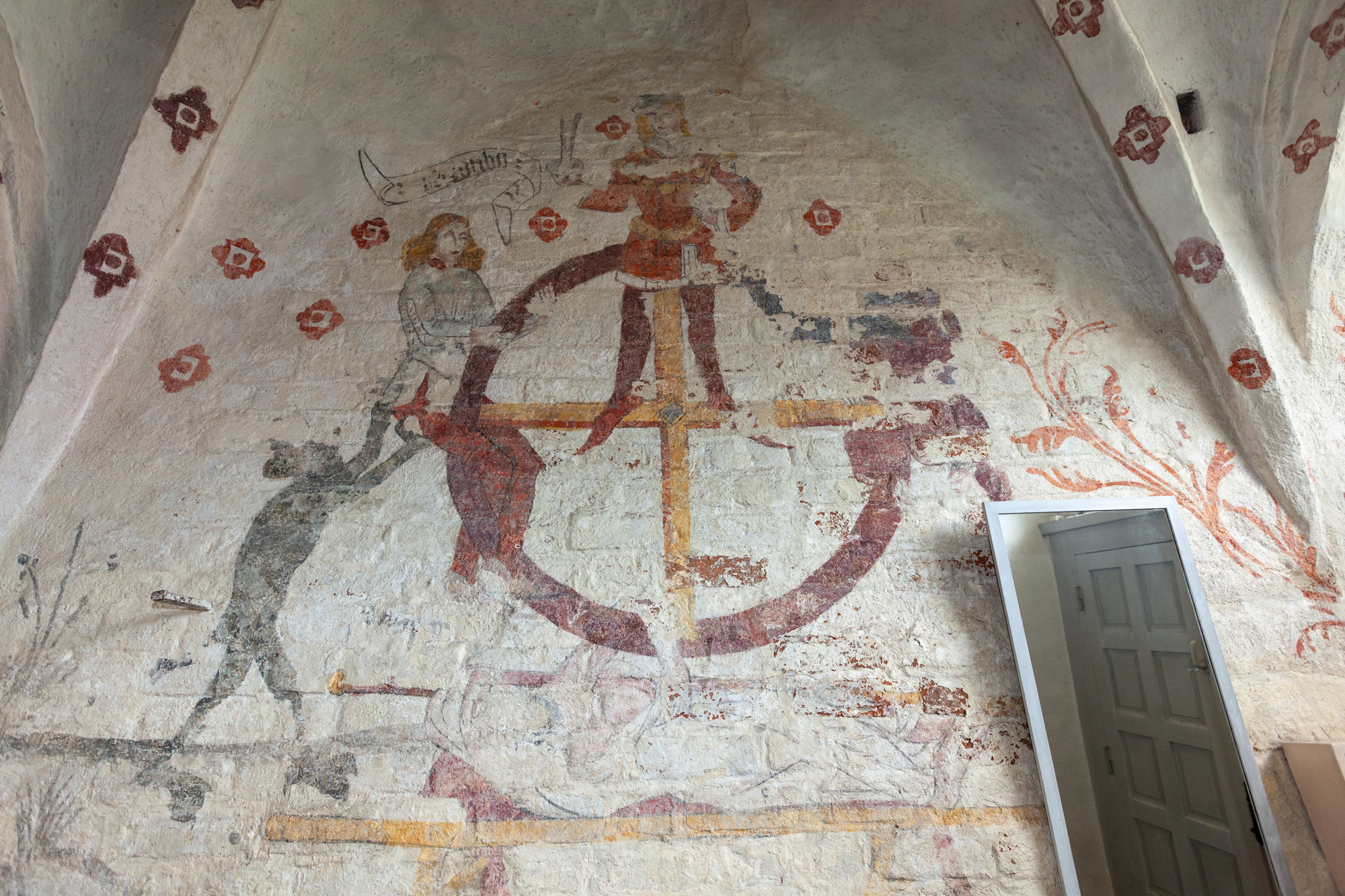 Sydvæg: Livshjul. En ung mand er på op og frem, mens en mørk djævel søger at trække ham ned. Øverst sidder den voksne mand, som er skildret med al sin rigdom. Han er fornemt klædt. Om skuldrene har han et bånd med bjælder og om livet en kraftig guldkæde. I højre hånd holder han et vinglas. I højre side ses hans fald, hvor det kun går nedad. Nederst ligger han i ligklæder og forsøger at holde fast i livshjulet.