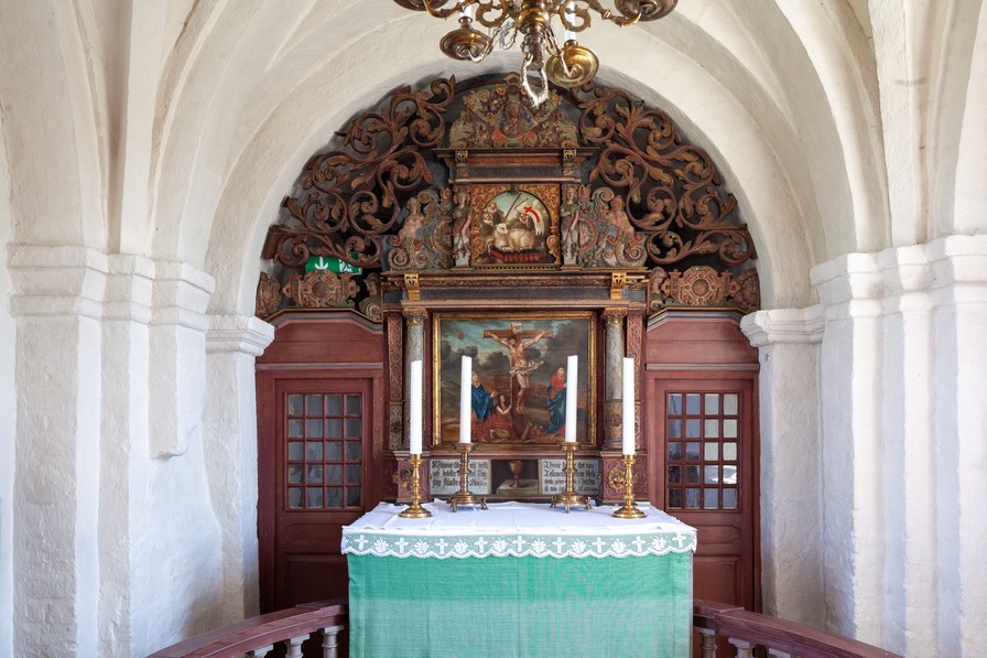 Altertavlen er fra 1634. Årstallet står to gange på fodstykket ved siden af konsollerne sammen med nogle initialer. På nordsiden står der H P I S 1634 og på sydsiden P O S T M S 1634. På konsollerne er der groteske ansigtsmasker og på forsiden af den sydlige en løvemaske. Teksten på fodstykket er blevet fornyet i svensk tid, mens teksterne på de to gesimser er de oprindelige. Øverst står der: Salvator mundi (Verdens frelser), og på bjælkelaget over storstykket står der: