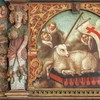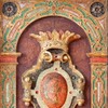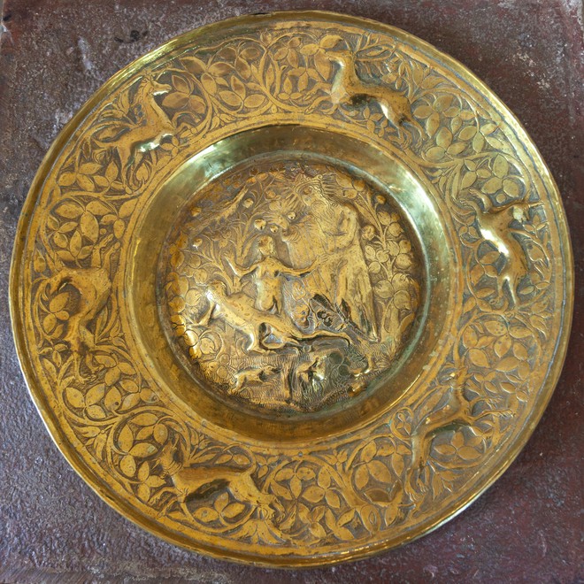 Motivet i bunden er Evas skabelse, idet hun vokser ud af Adams side. Til højre står Skaberen med glorie og kongekrone. Motivet omgives af dyr og planter fra Edens Have. På randen er der springende hjorte mellem et rigt rankeværk.