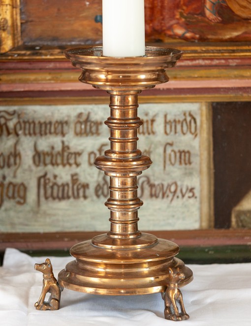 Alterstage af malm fra 1500-tallet båret af tre siddende hunde.