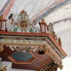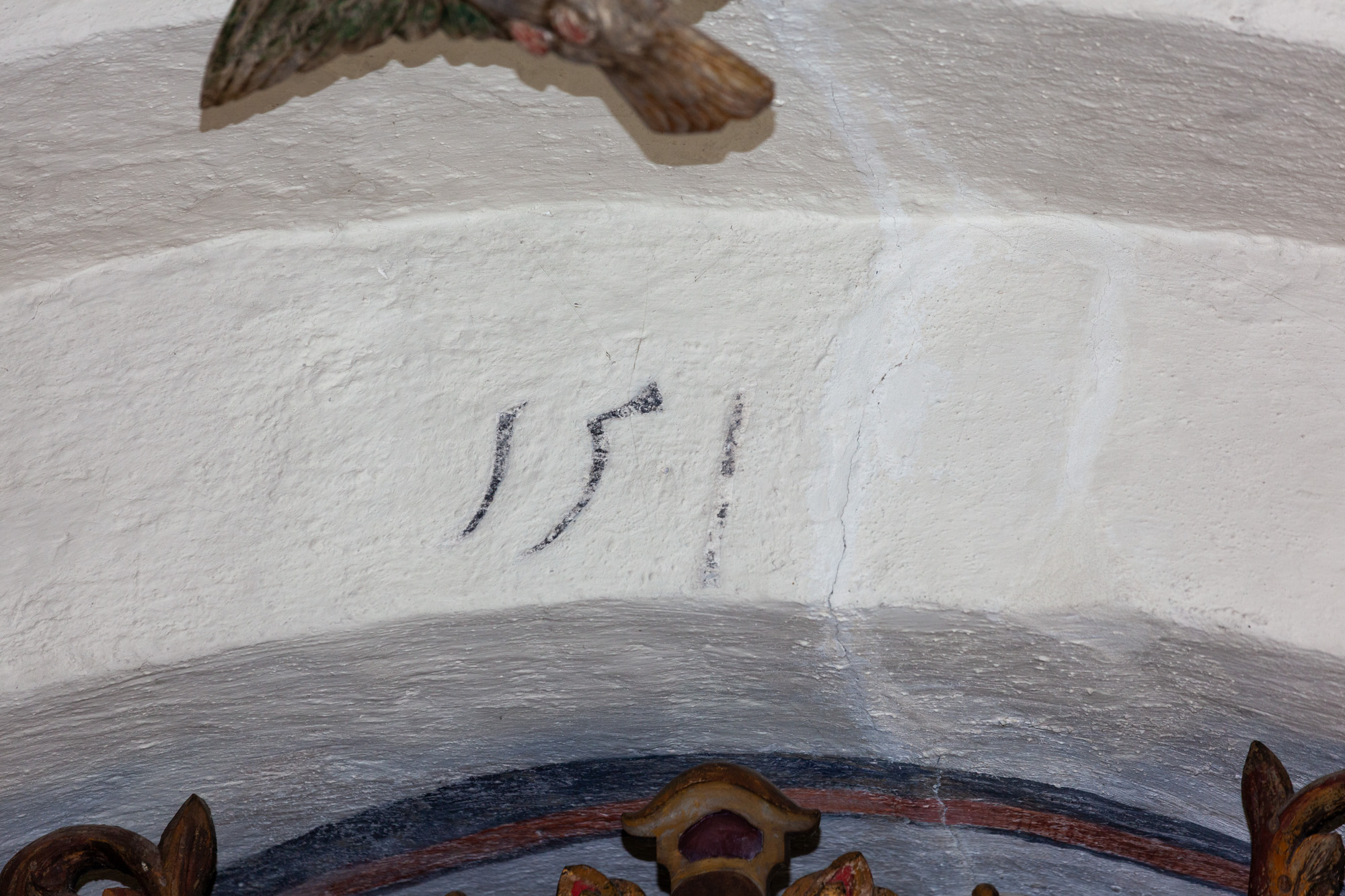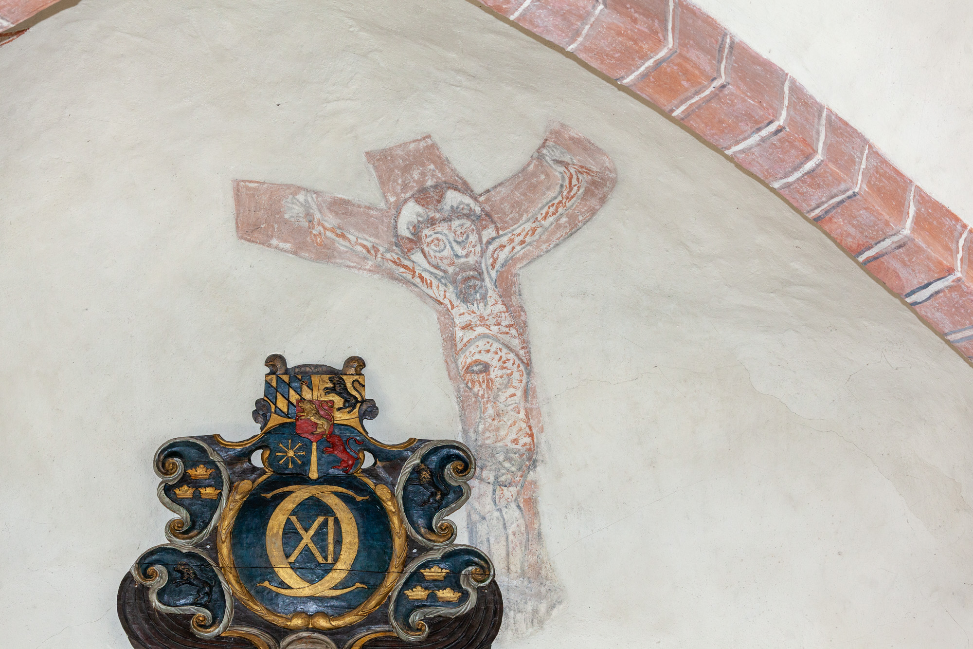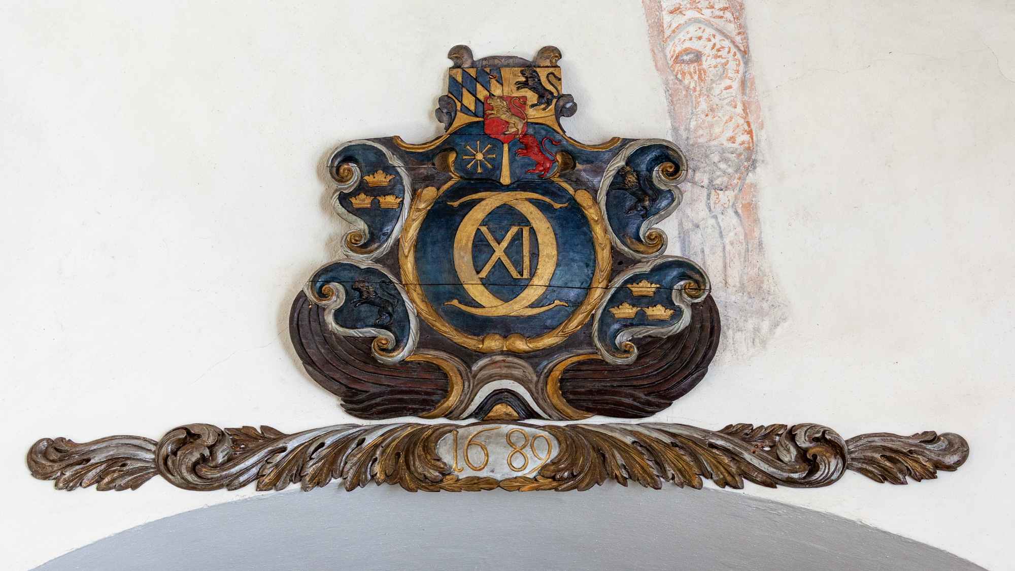 Carl Xis monogram fra 1689 hænger over tårnbuen i skibet.