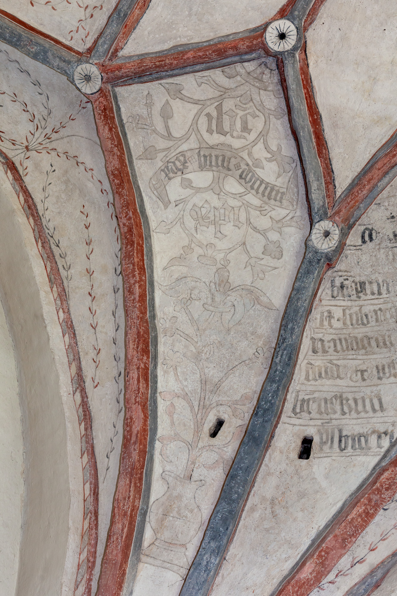 I delkappen ved siden af vokser en plante op af en vase / urtepotte med blade og blomster. I rankeværket over planten er et skriftbånd med orden ”pax huic domui”. Det refererer til ritualet for indvielse af en kirke. Ovenover skriftbåndet ses bogstaverne ihc for Jesus og nedenunder xpi for Kristus.