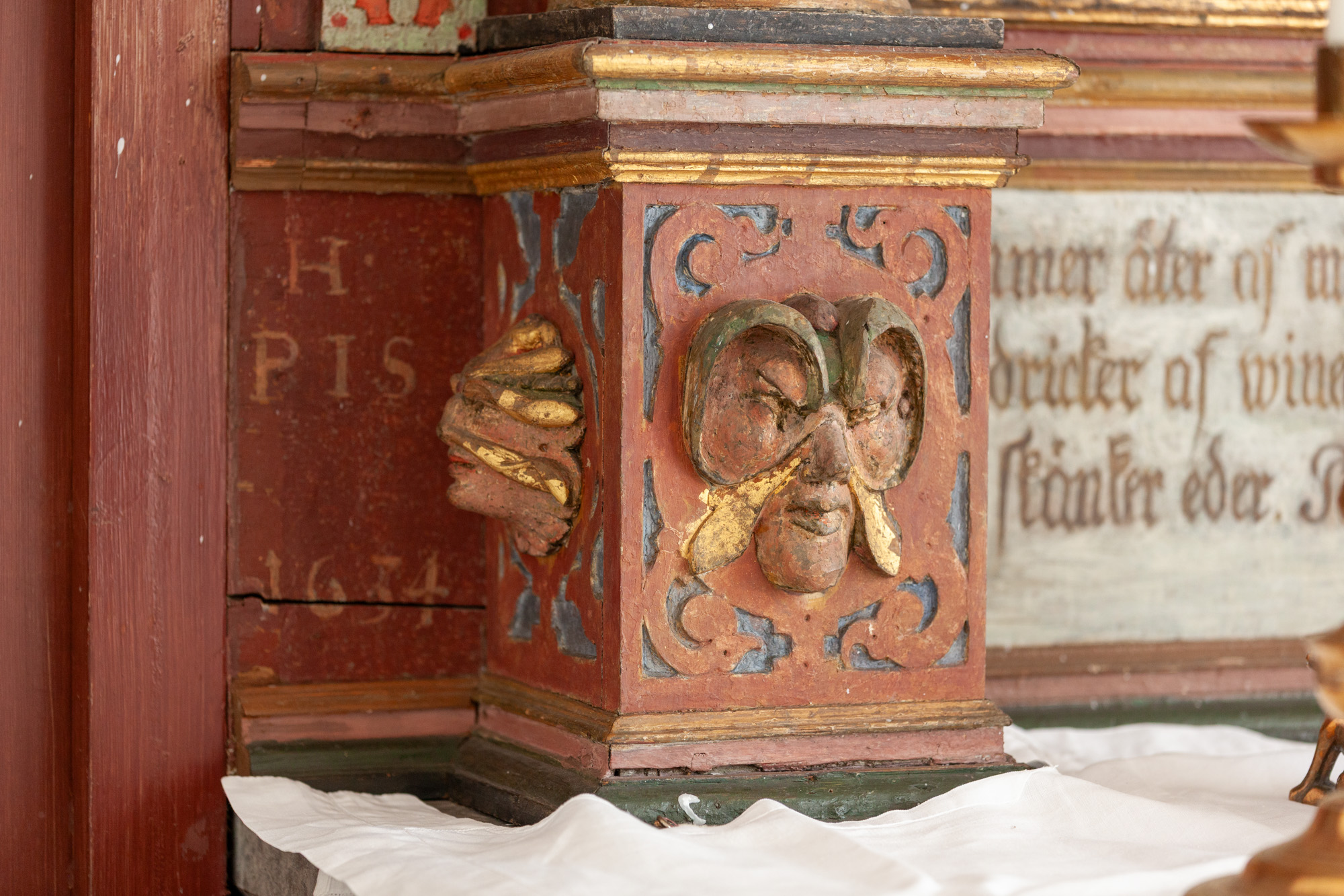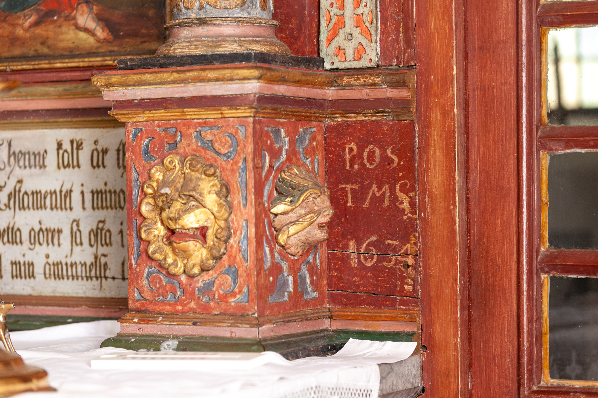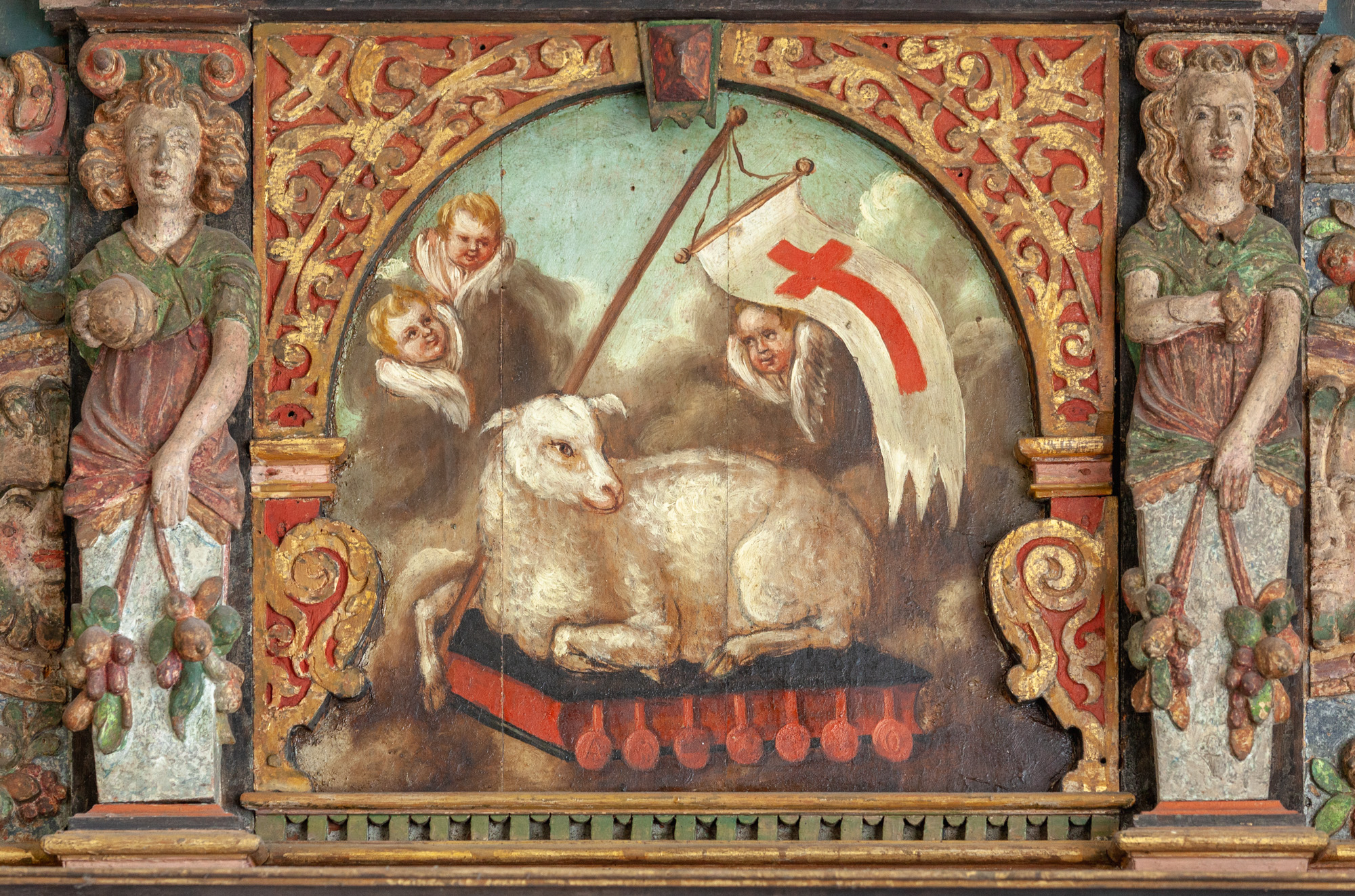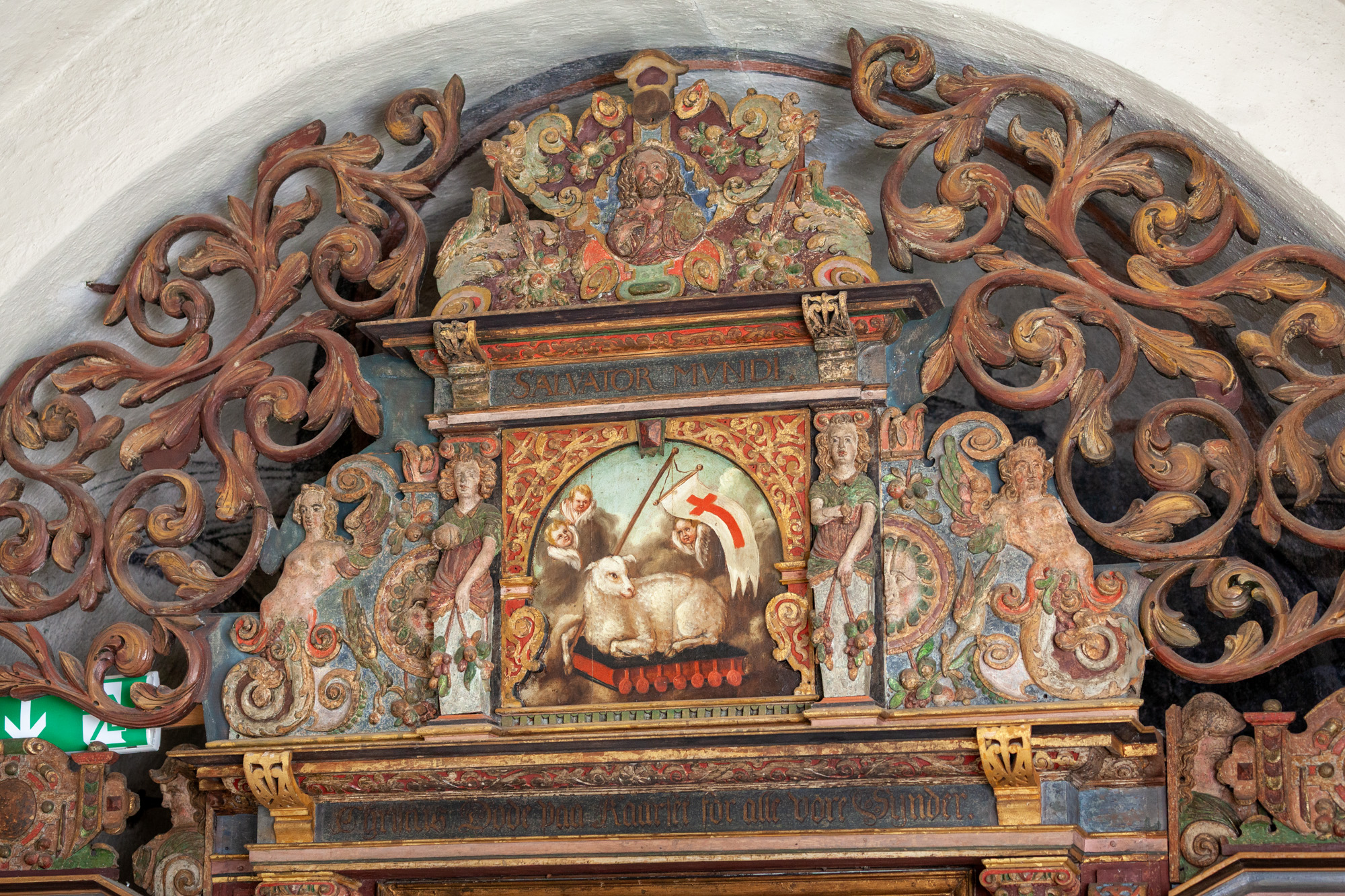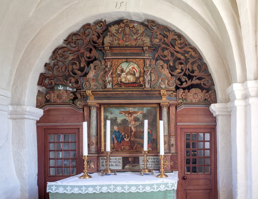 Korsfæstelsesscenen, som er udført af Joh. Luthman 1783, flankeres af to joniske søjler med glatte skafter og prydbælter. Topstykket har et billede af korslammet i en rundbue flankeret af to kvindelige hermer. Øverst ses Kristus omgivet af et væld af frugter, to dyrehoveder og to fugle alt sammen iblandet bruskelementer.