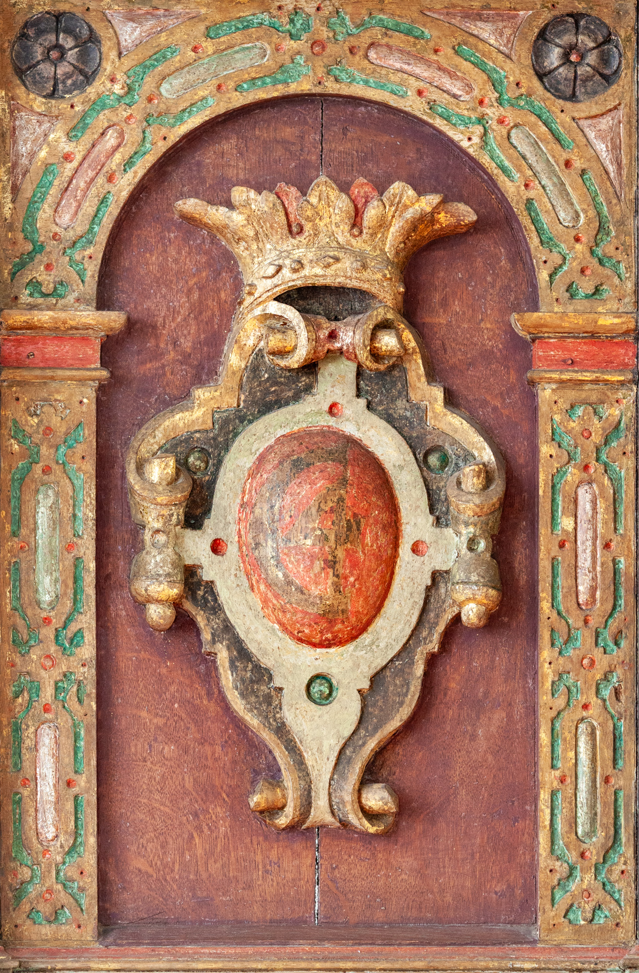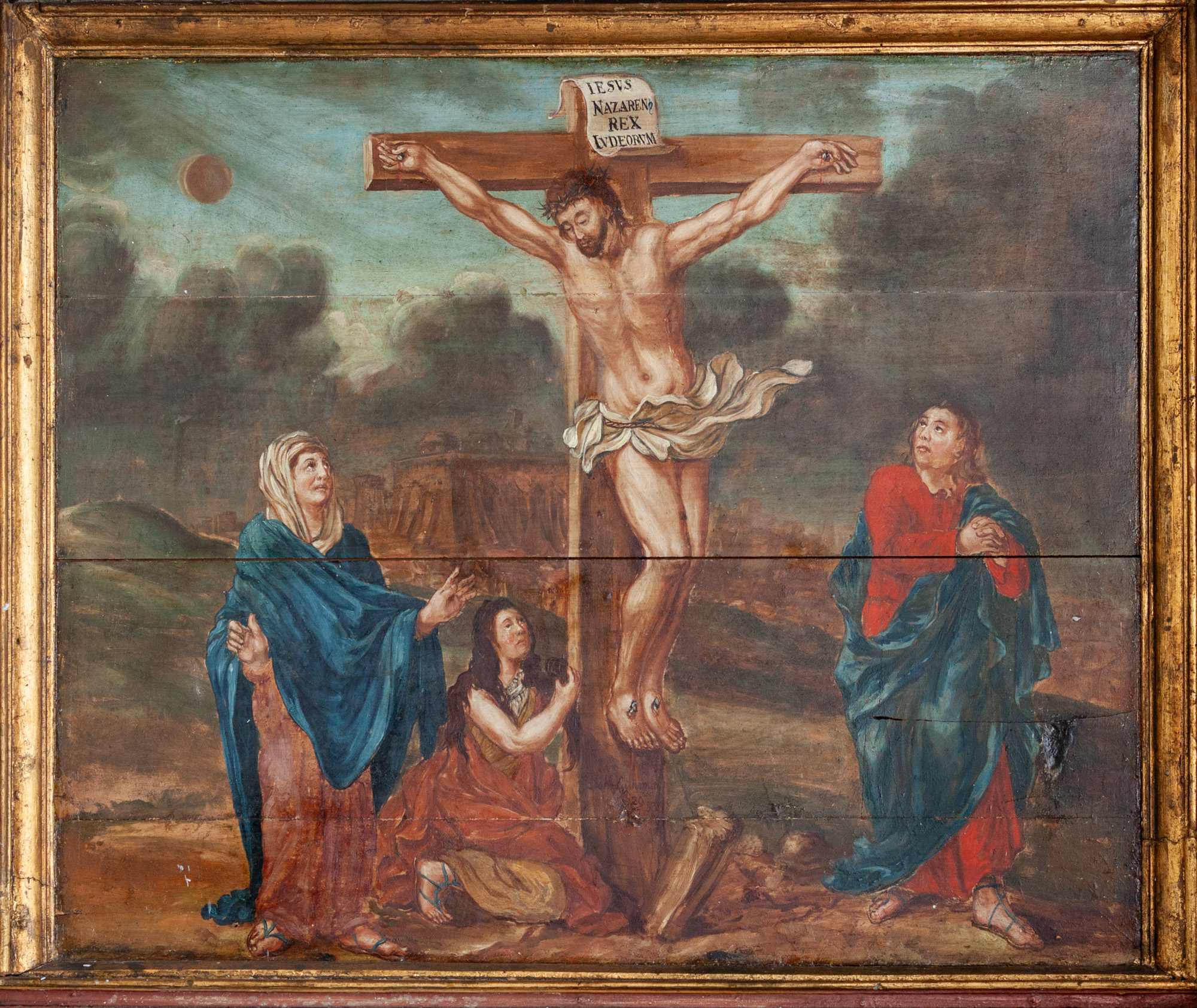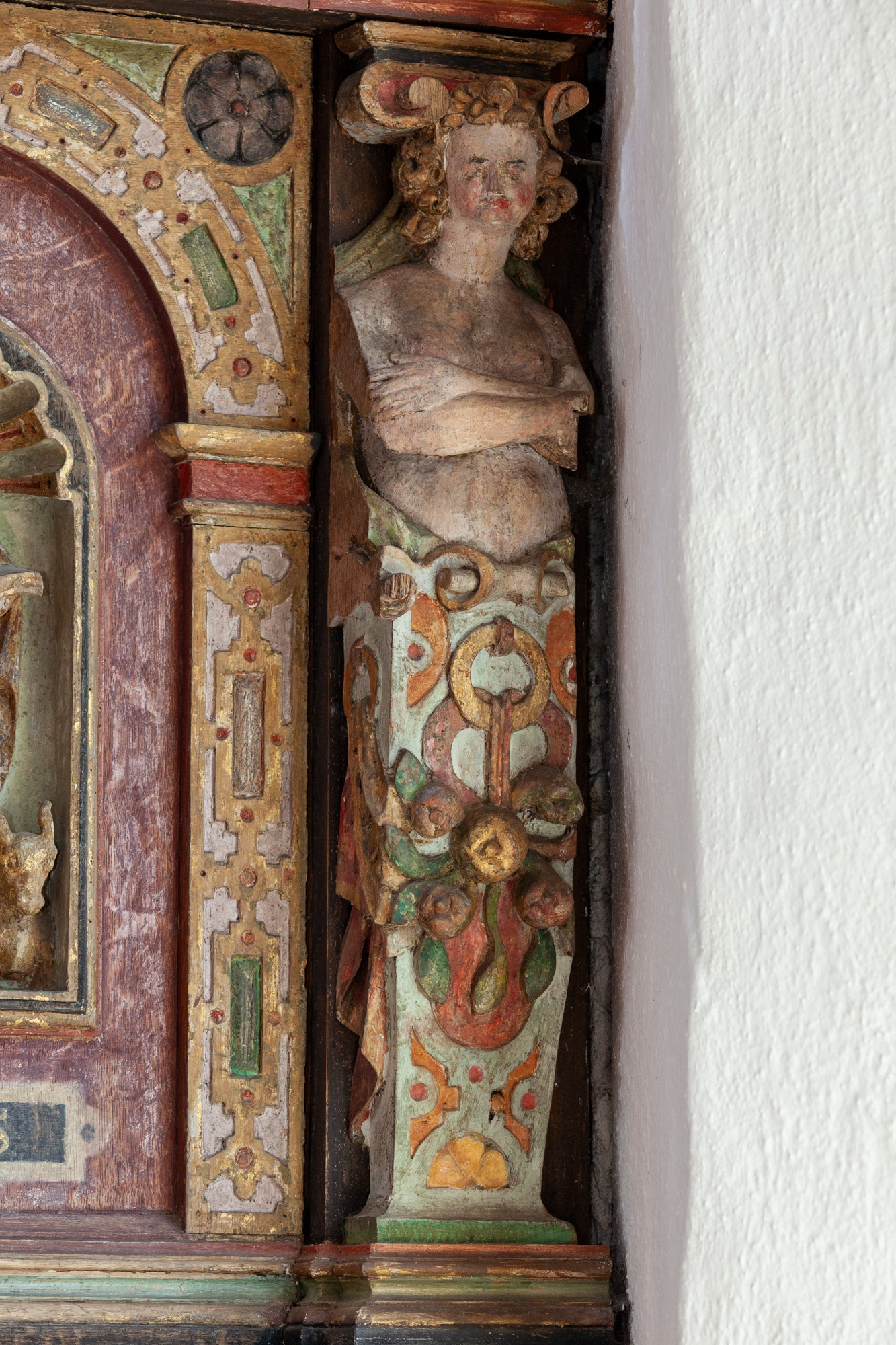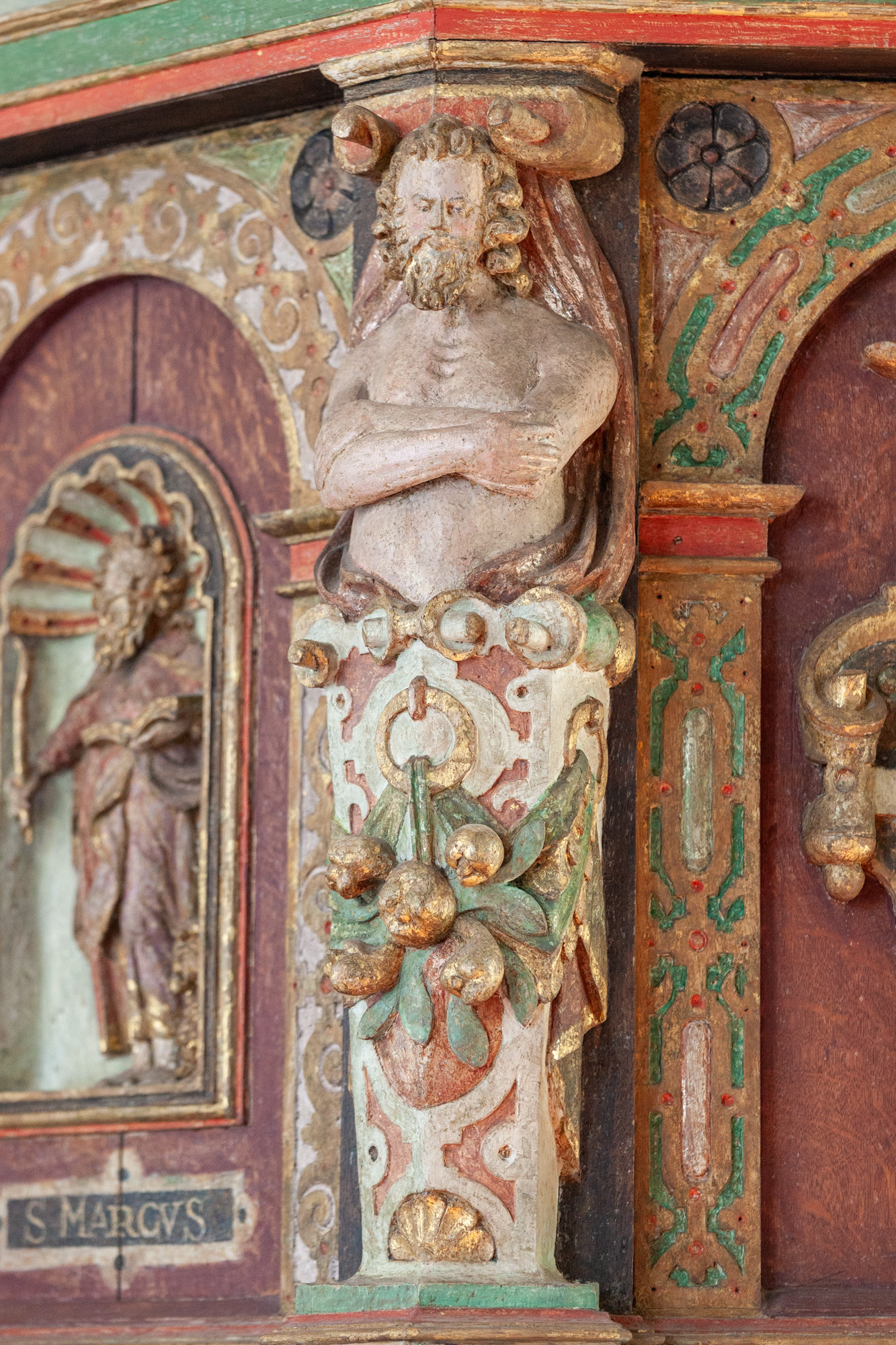 Korsfæstelsesscenen, som er udført af Joh. Luthman 1783, flankeres af to joniske søjler med glatte skafter og prydbælter. Topstykket har et billede af korslammet i en rundbue flankeret af to kvindelige hermer. Øverst ses Kristus omgivet af et væld af frugter, to dyrehoveder og to fugle alt sammen iblandet bruskelementer.