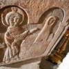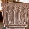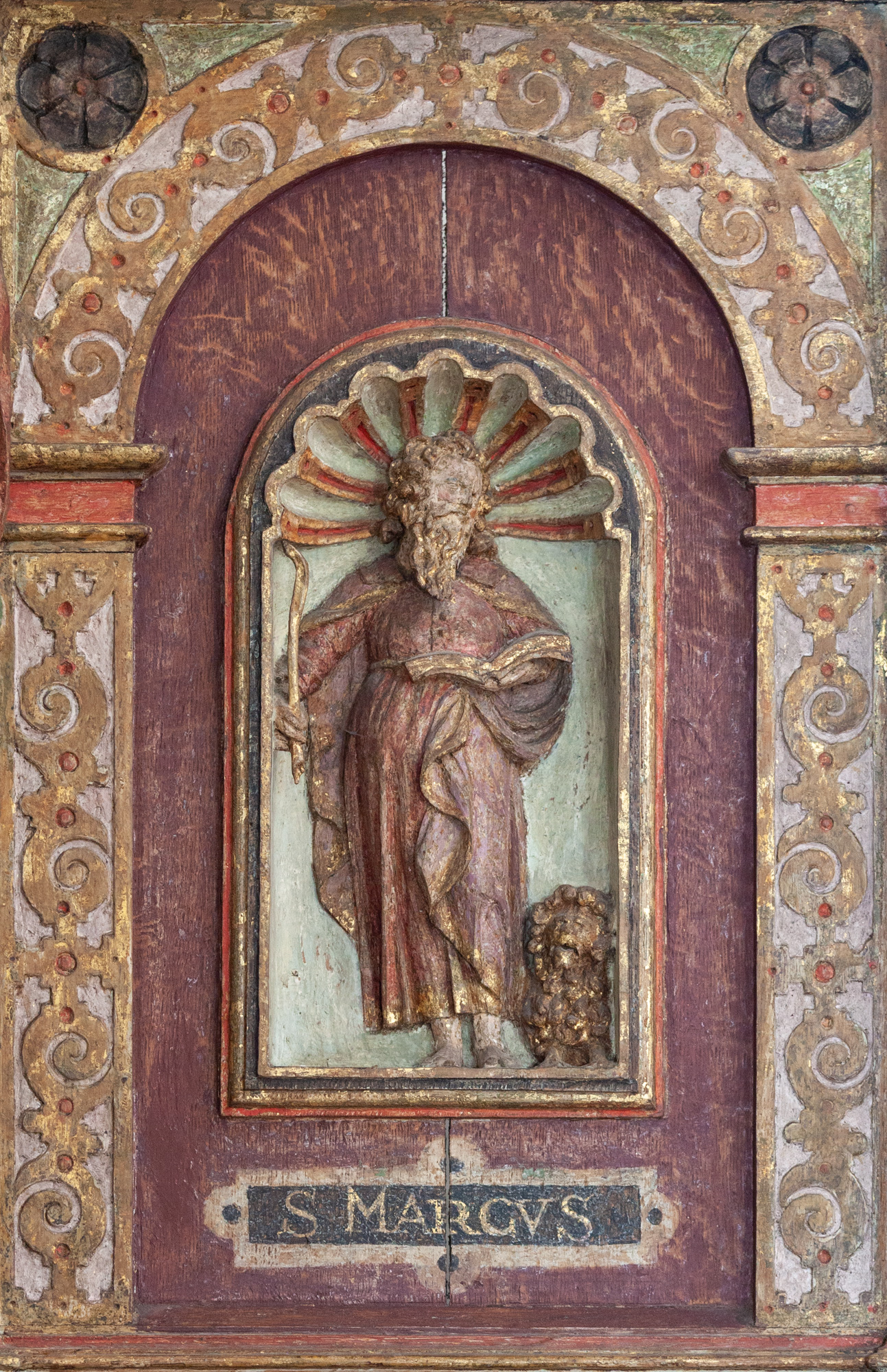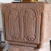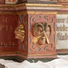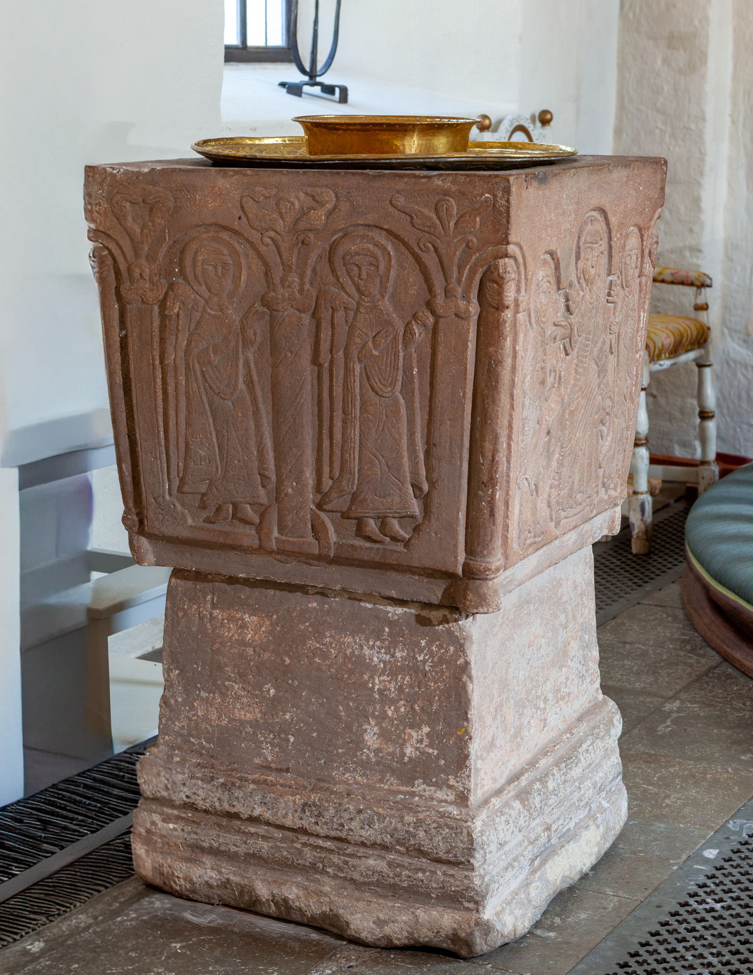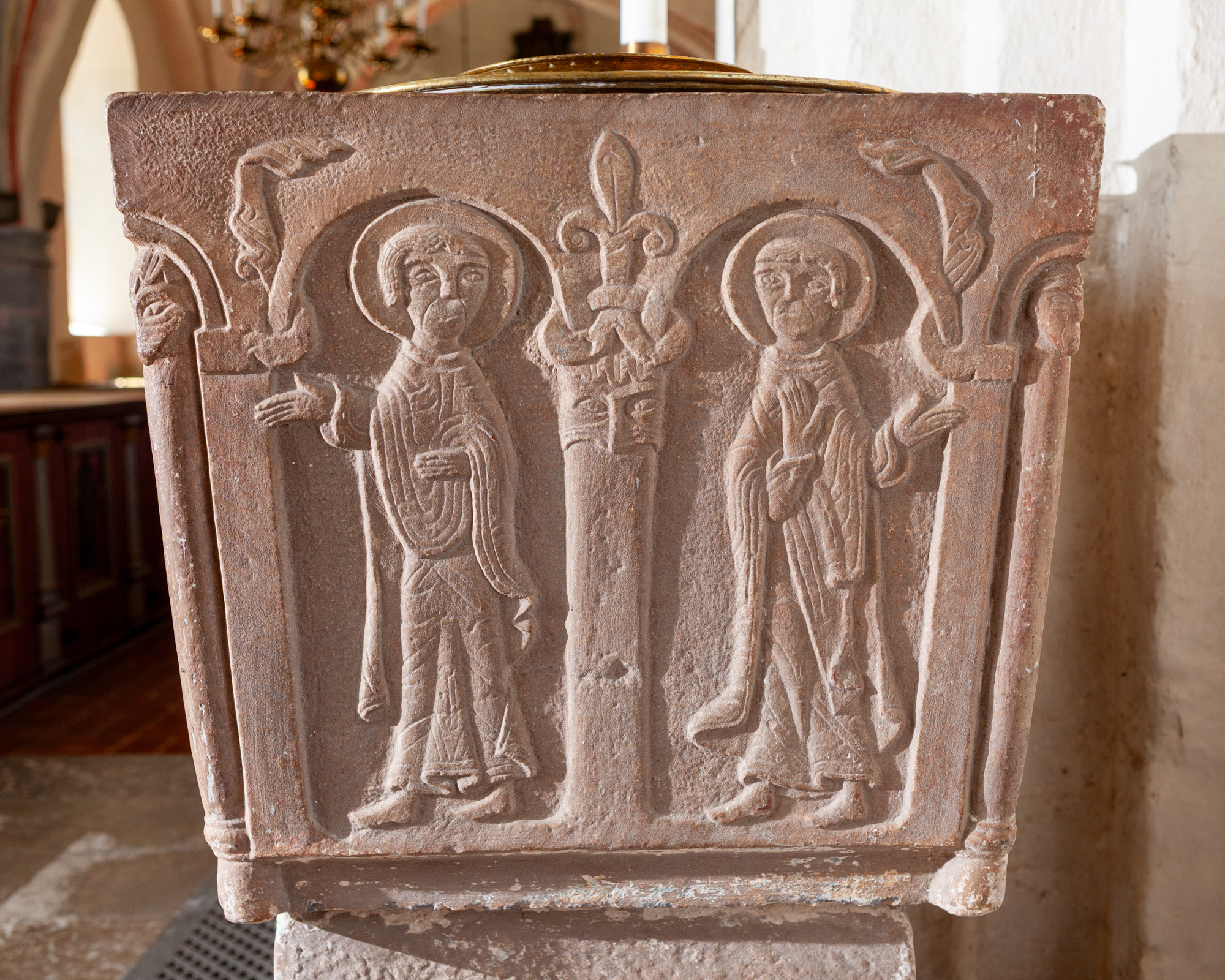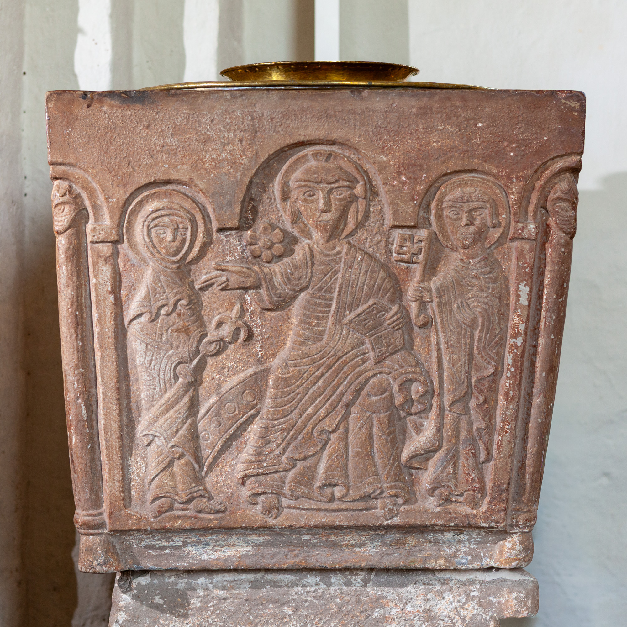 På den ene side af kummen er der tre rundbuer. I den midterste, som er den højeste, står Kristus med en bog i venstre hånd, mens han med højre peger mod Maria, der står med en lilje. På den anden side står Peter med nøglen. De andre sider har hver to rundbuefelter adskilt med en søjle og i sviklerne en akantus. I felterne står engle og helgener uden attributer.