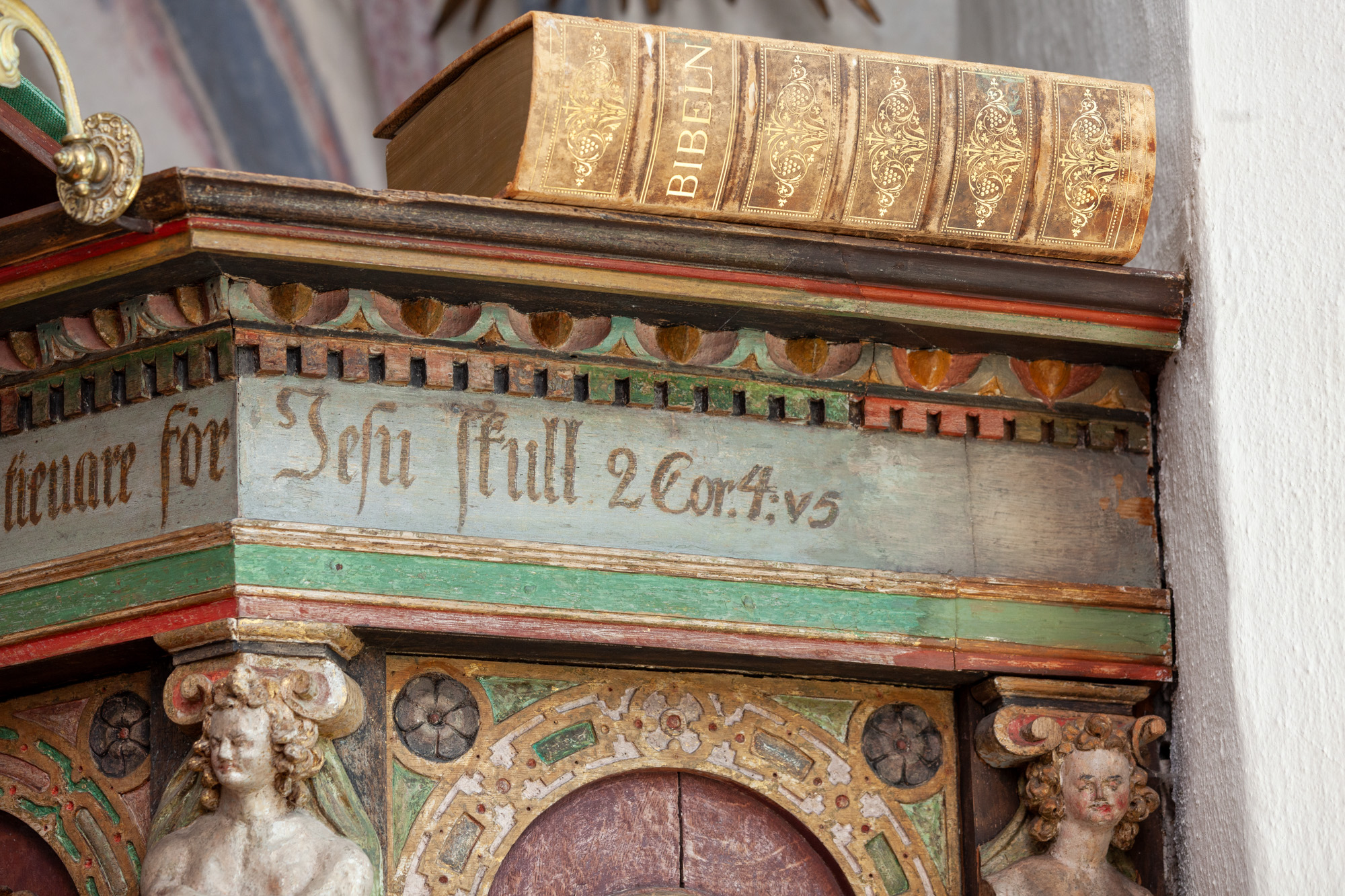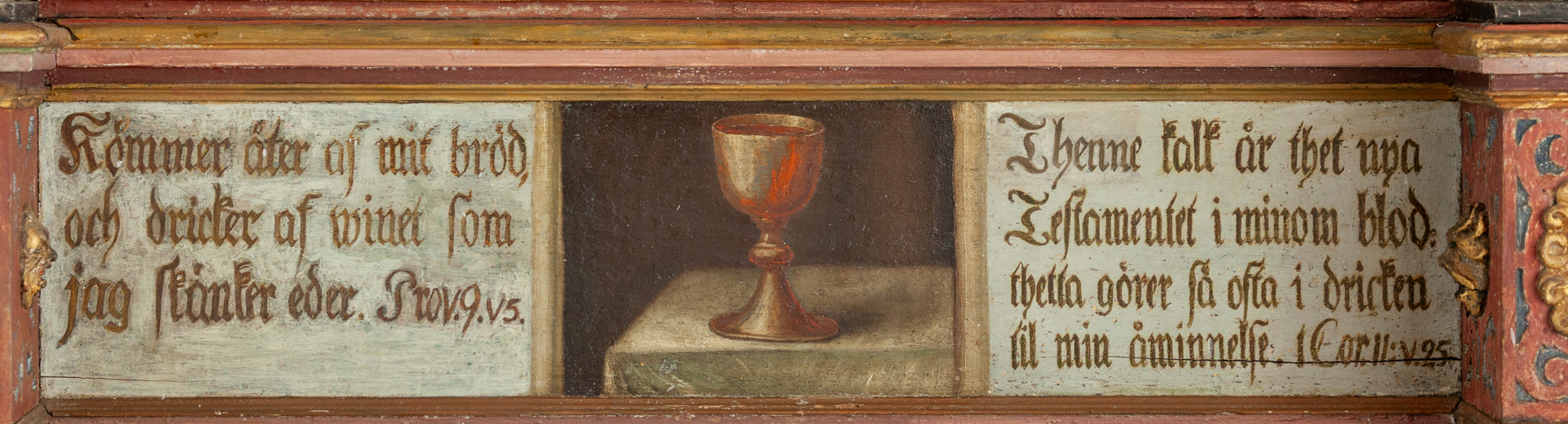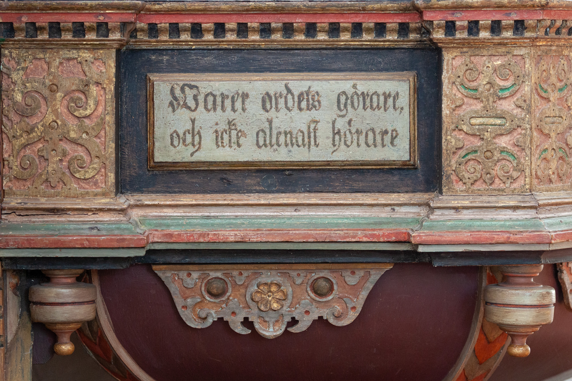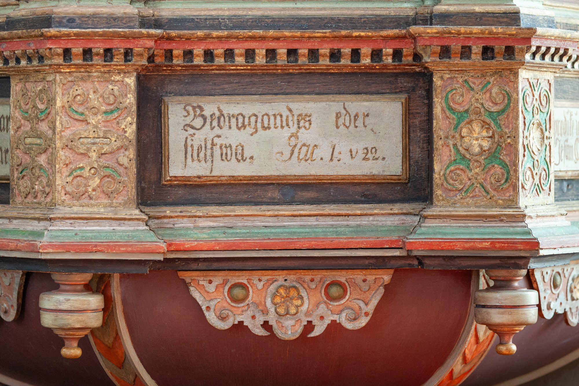Teksterne i de to andre smalfelter for neden er ”Varer ordets görare, och icke alenast hörare,” og: ”Bedragandes eder sielfwa. Jac. 1: v 22. De to citater er fra det samme vers i Jakobsbrevet.