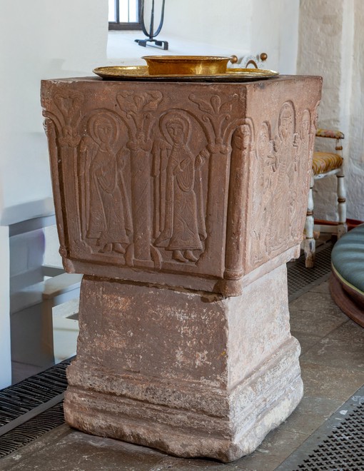 Døbefonten er af sandsten. Den er firkantet, men har rund udhulning. Der er ingen fals, men afløbshul. Over stavene i hjørnerne er der gabende dyre- og fuglehoveder.