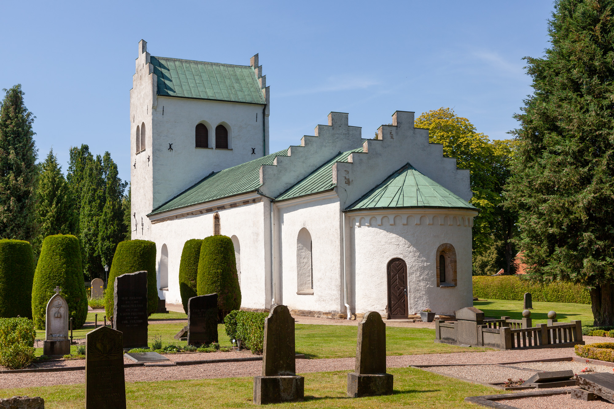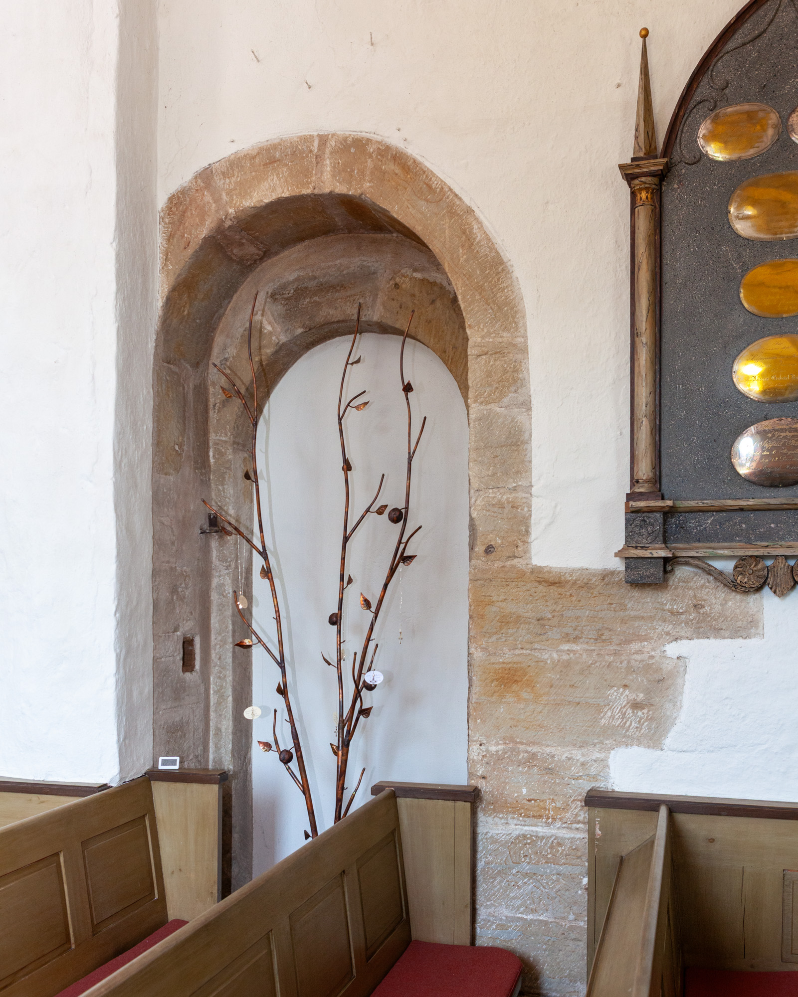 En rundstav pryder korbuen, som menes helt at være opført af Helsingborg-sandsten. Korbuen i den romanske Helsingborg Vor Frue kirke var af lignende art.