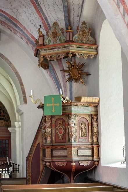 Prædikestolen er fra 1620. Kurven har kun tre storfelter med billeder af to evangelister, Markus og Lukas. Det tredje storfelt har Christian IV’s monogram. På hjørnerne står der mandlige hermer med bar overkrop og korslagte arme. Hermedelen består af beslagornamentik og frugtnedhæng.