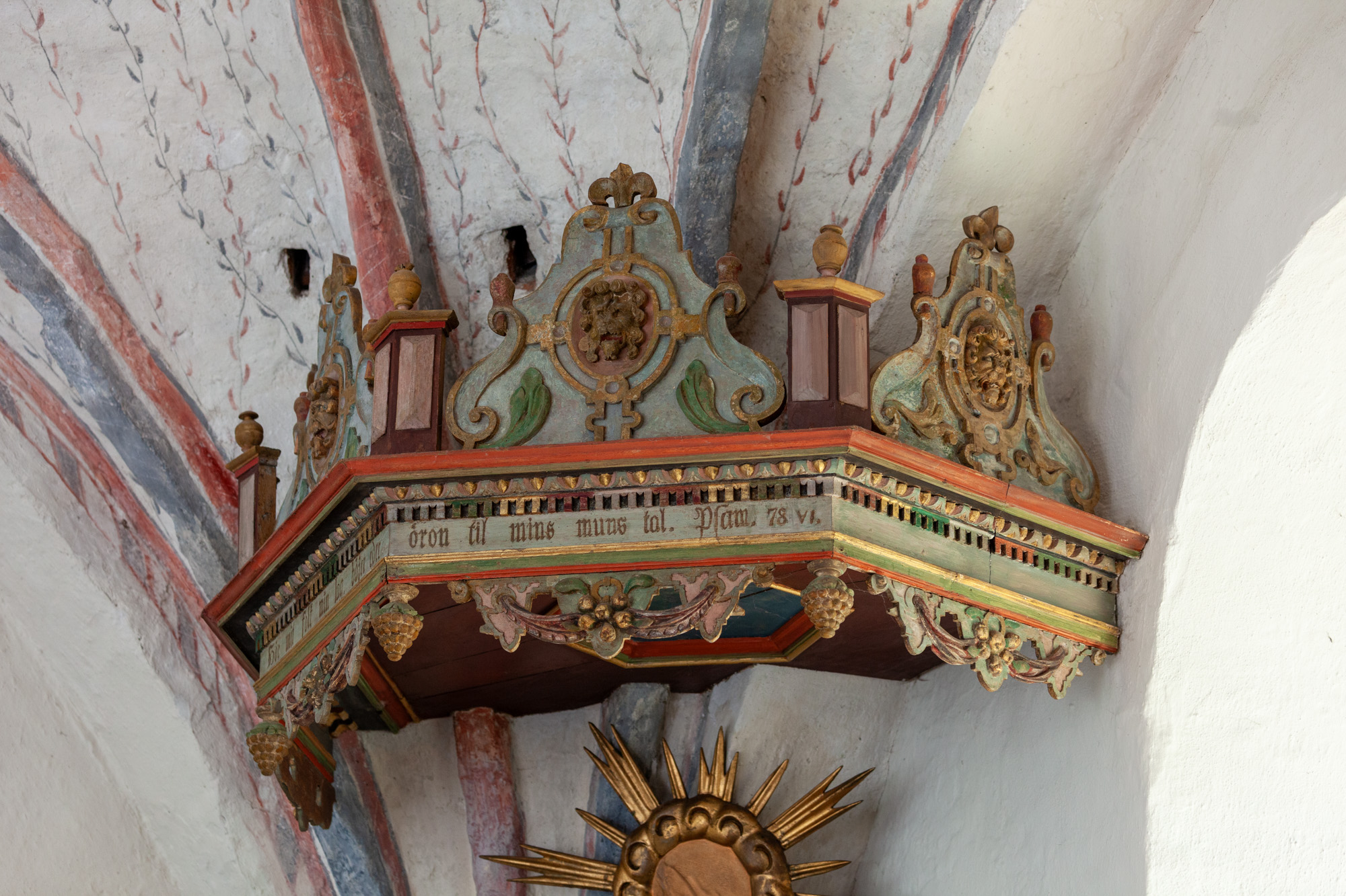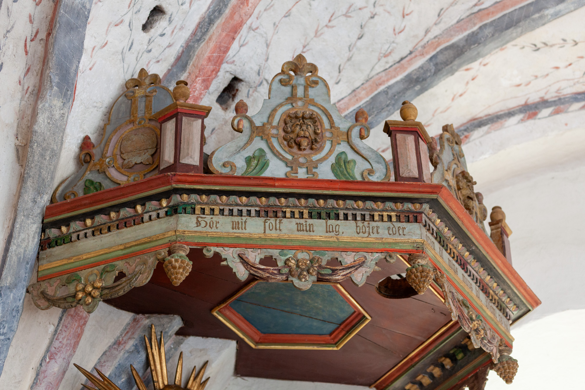 Lydhimlen har fire sider. Under den hænger en sol, som oprindeligt var lavet til altertavlen 1768.