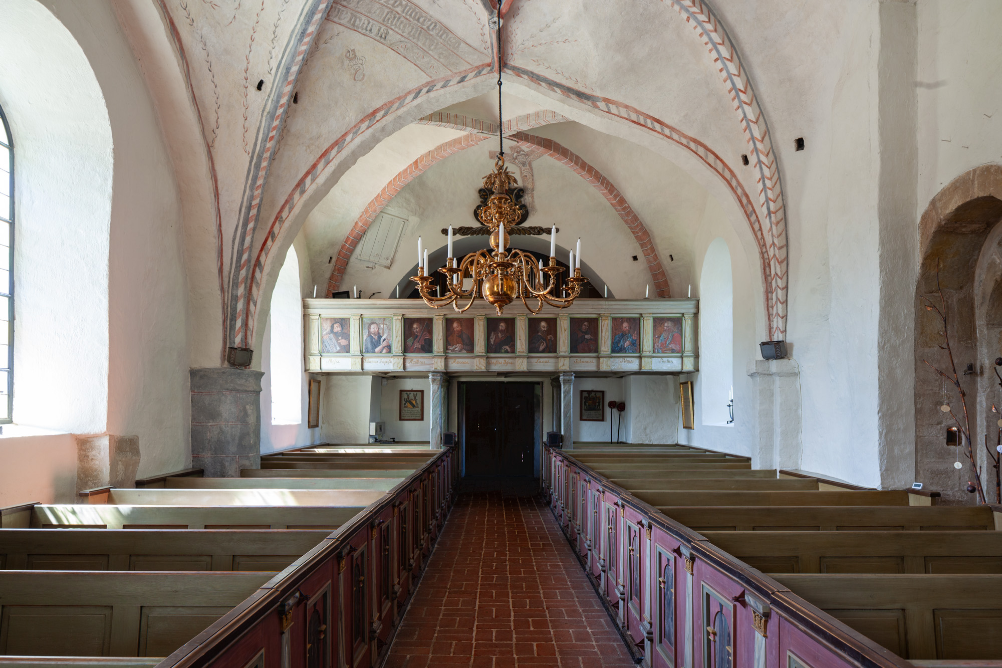 En lysekrone af malm er fra 1600-tallet. En anden er fra 1700-tallet.