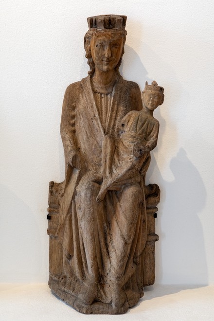 Tronende Madonna fra midten af 1200-tallet. Hun sidder fremadvendt på en bænk med et lille smil. På hovedet bærer hun ringen til en krone. Spirene er væk. Hun er klædt i kjortel og kappe, der hænger i lange folder helt ned til fødderne. Jesusbarnet hælder mod venstre og støtter fødderne mod moderens højre knæ. I venstre hånd har han en jordklode, der støttes mod venstre knæ. Han bærer en krone med små spidser.