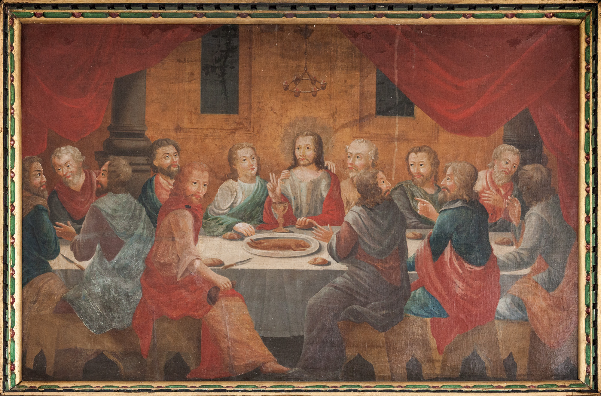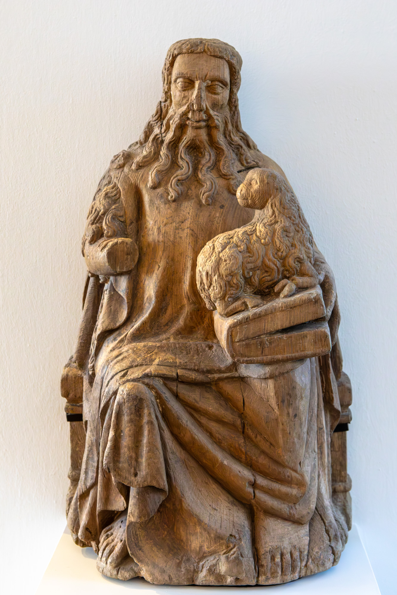 Johannes sider på en bænk. I venstre arm holder han en bibel med lammet ovenpå. Kameluldsdragten er synlig på højre skulder.