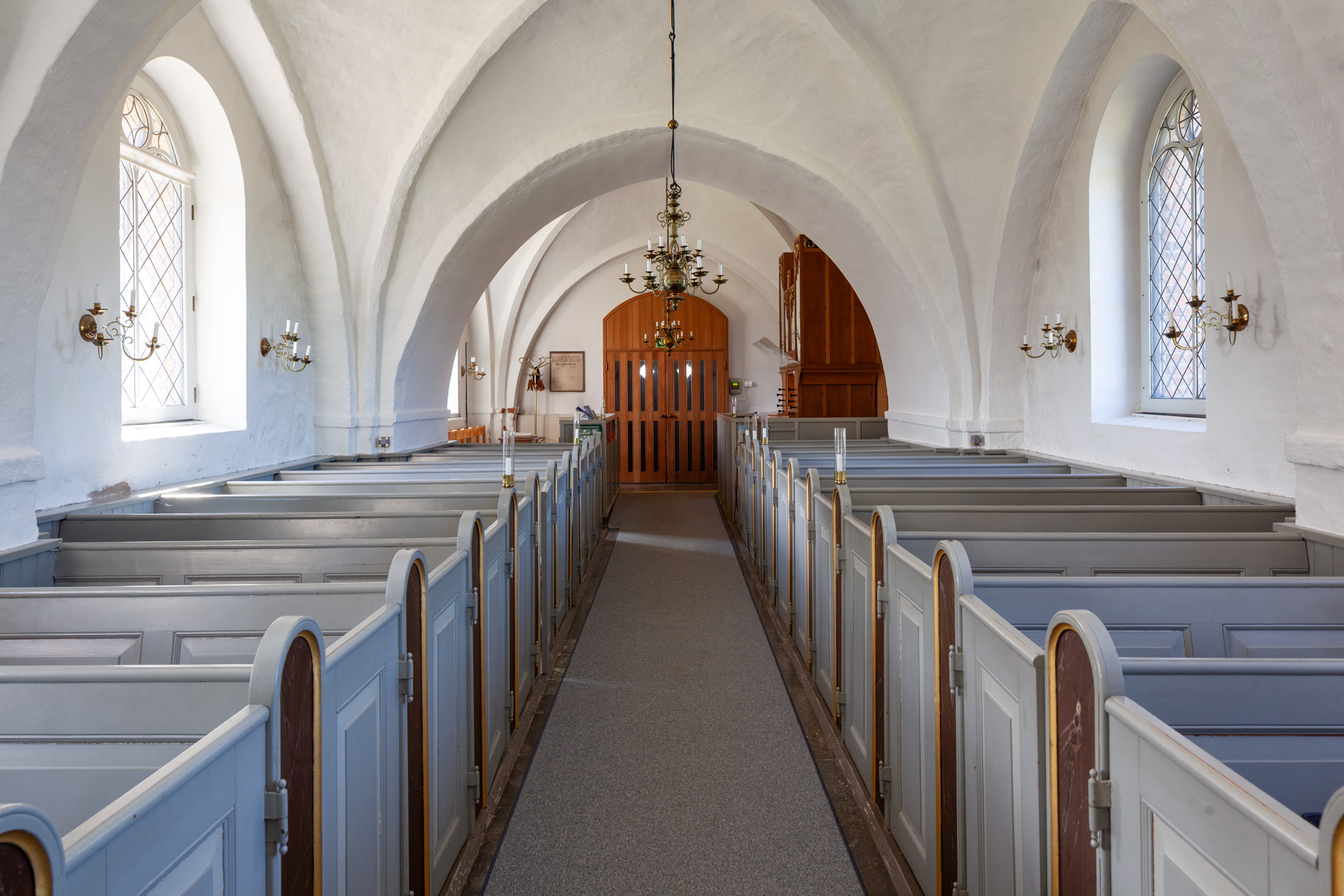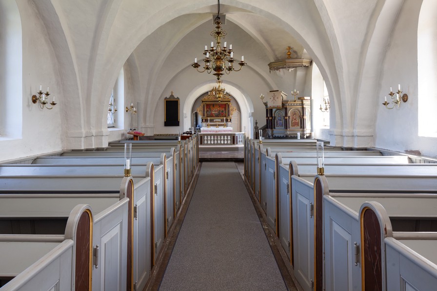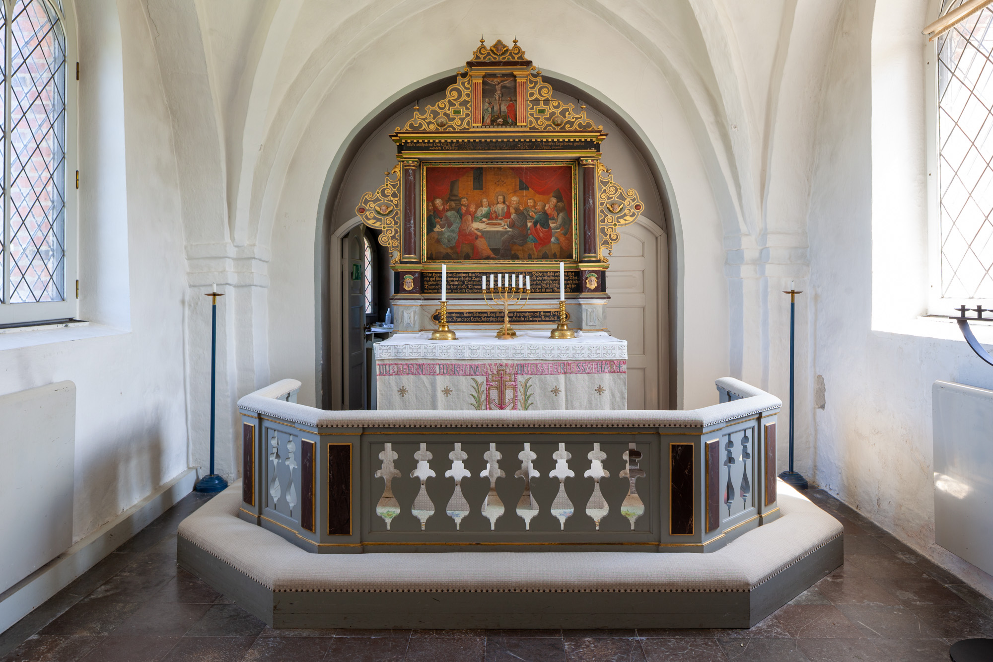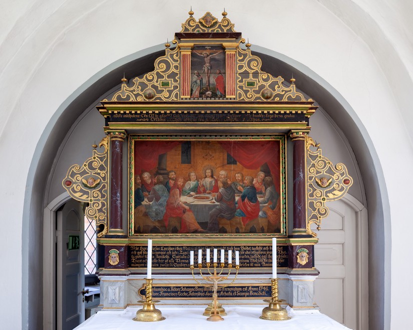 Altertavlen er fra begyndelsen af 1600-tallet. Et stort maleri, som forestiller Nadveren, er udført af Johan Borg 1741. Det flankeres af to glatte søjler. Der er både sidevinger og topvinger med beslagornamentik. Topstykket har et billede af Kristus på korset med Maria og Johannes. Det flankeres af to riflede pilastre. Teksterne på fodstykket og bjælkelaget stammer sikkert fra ændringen af altertavlen i 1741.