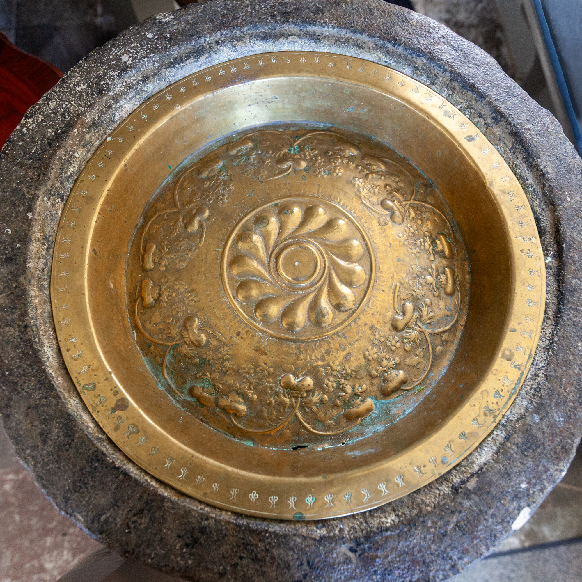 Dåbsfad med pæreformede bukler, blomster- og bladranker. Anden halvdel af 1500-tallet.