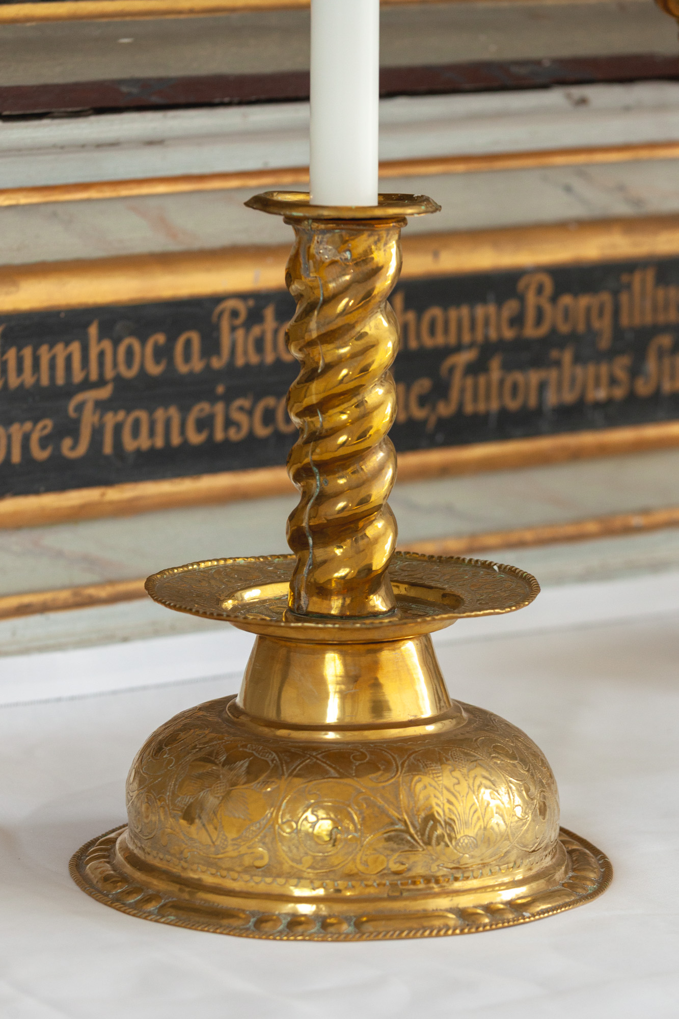 Lysestager af messing, rund hvælvet ornamenteret fod samt spiraldrejet skaft. Derimellem er en dryppeskive. Datering: anden halvdel af 1600-tallet.