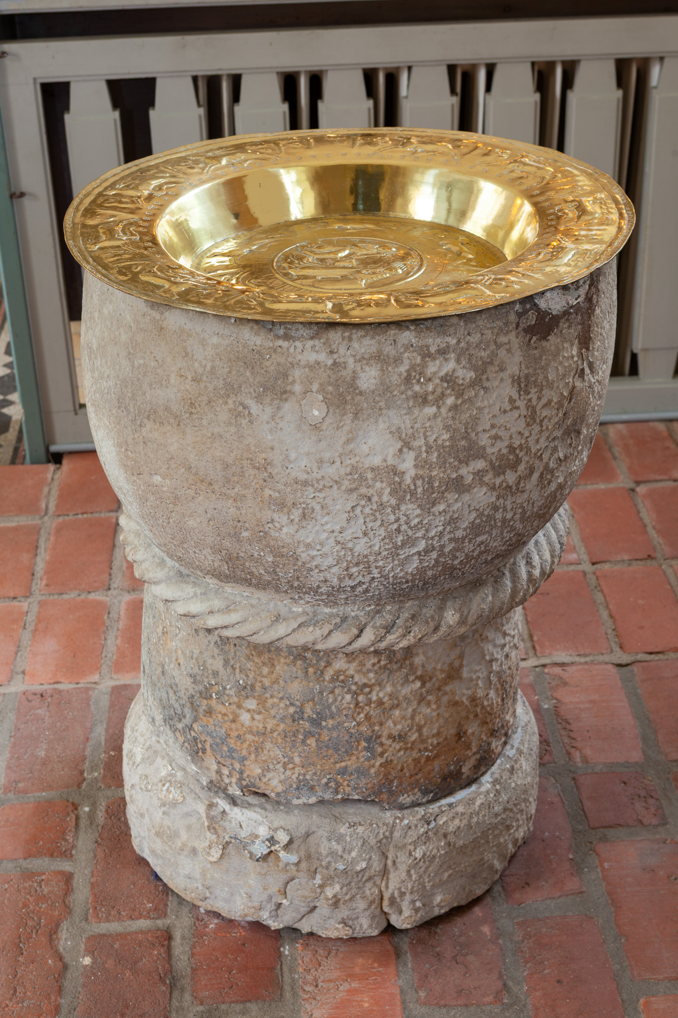 Døbefont af sandsten med fals og udtømningshul. Kummen er glat og uden udsmykning udover tovstaven, som afslutter den forneden. Skaftet er cylinderformet og står på en rund plade med rundede sider. Den er ikke tilskrevet nogen gruppe.
