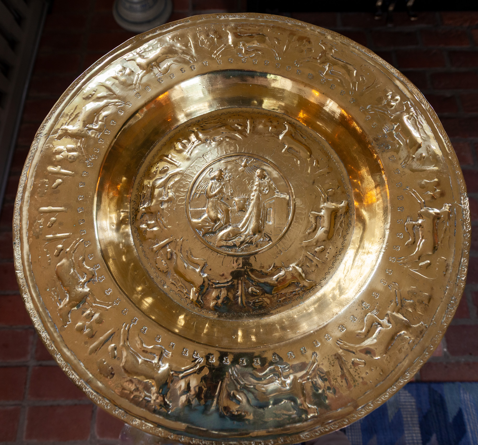 Mariæ Bebudelse omgivet af en indskrift, som sikkert kun er bogstaver uden nogen mening. Springende hjorte både i bunden og på fadets rand.