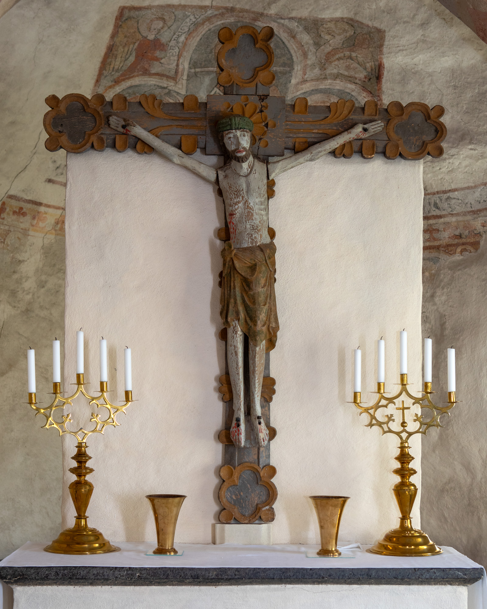 Krucifix fra første halvdel af 1200-tallet anvendes i stedet for altertavle.