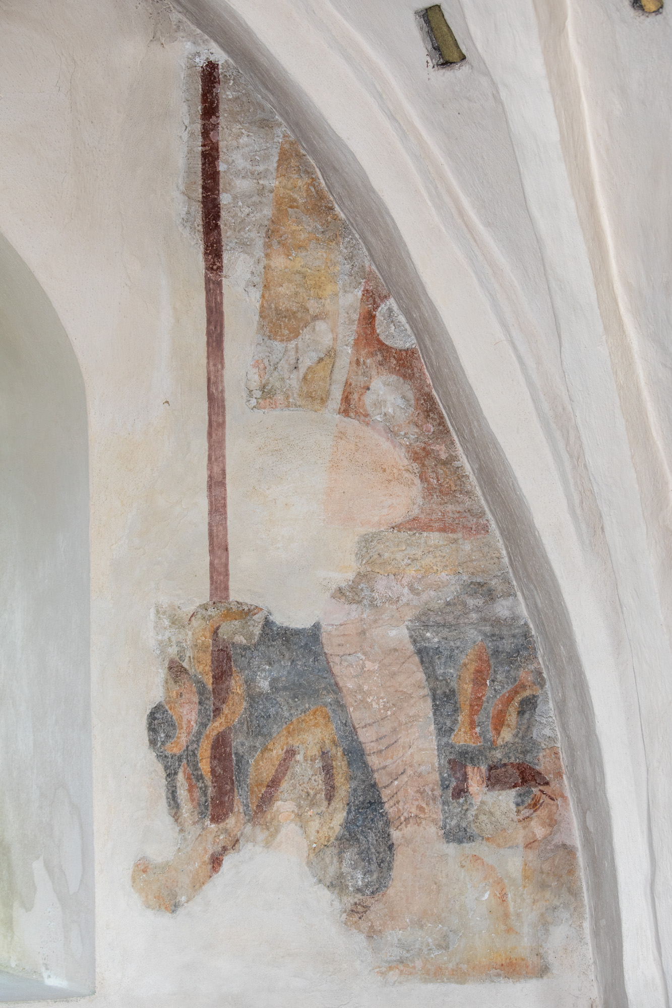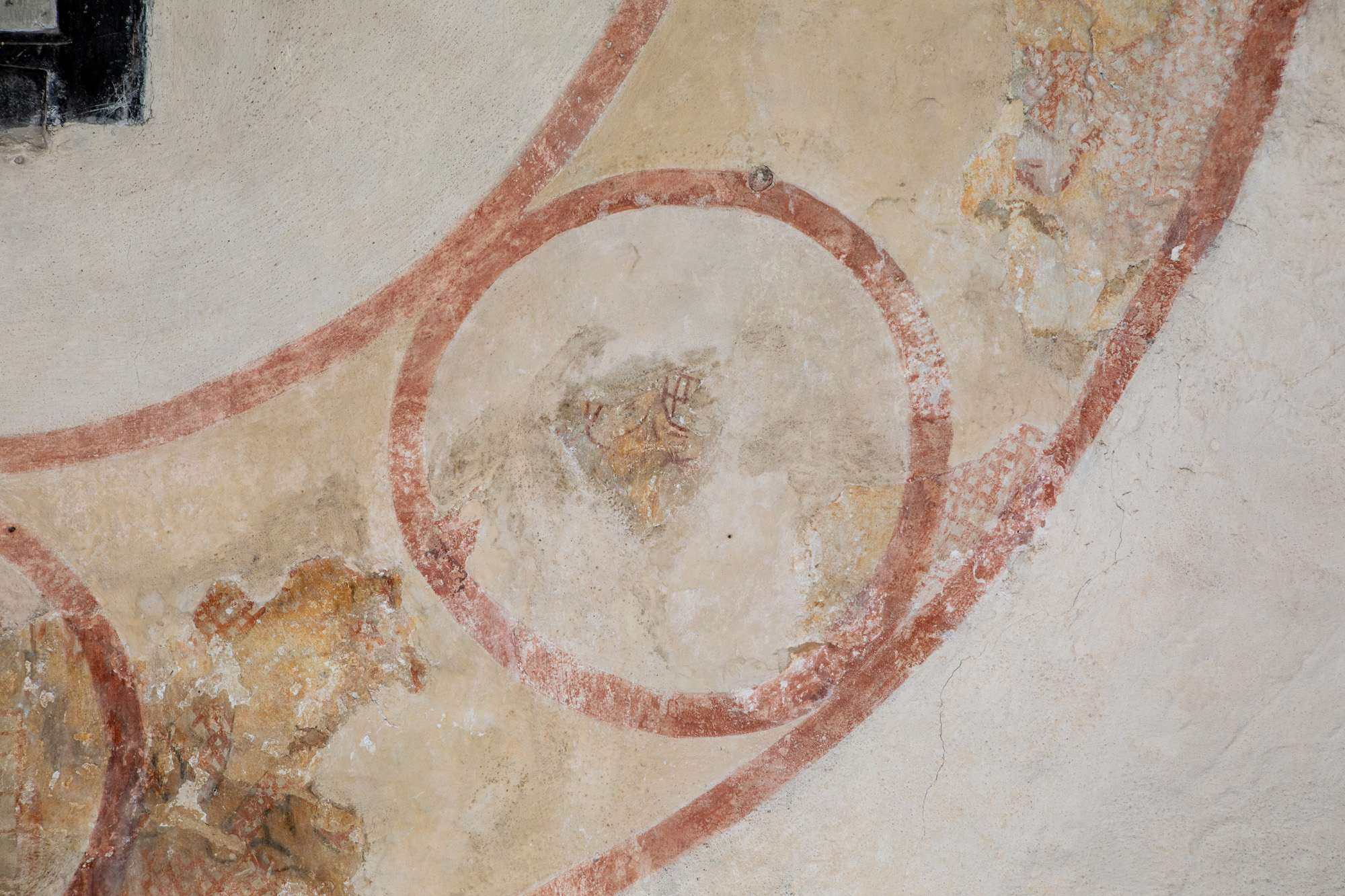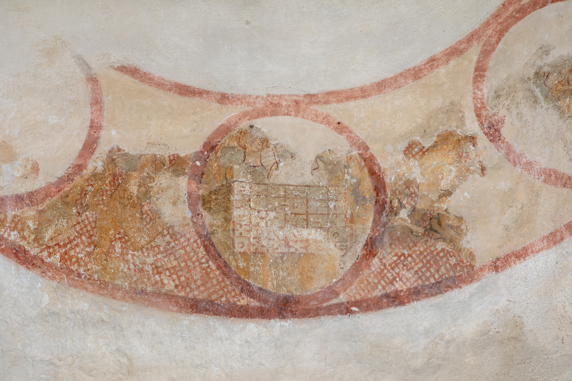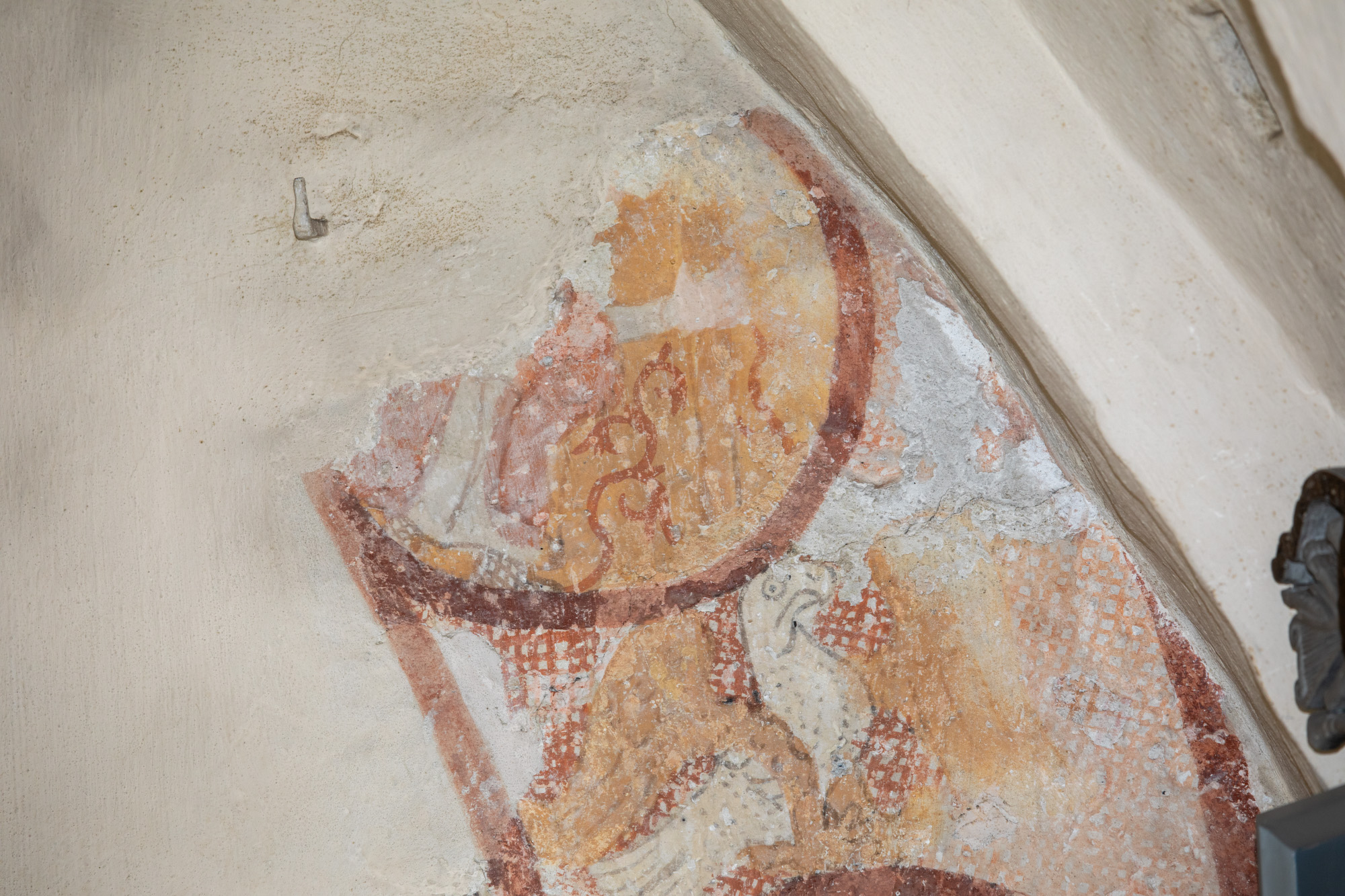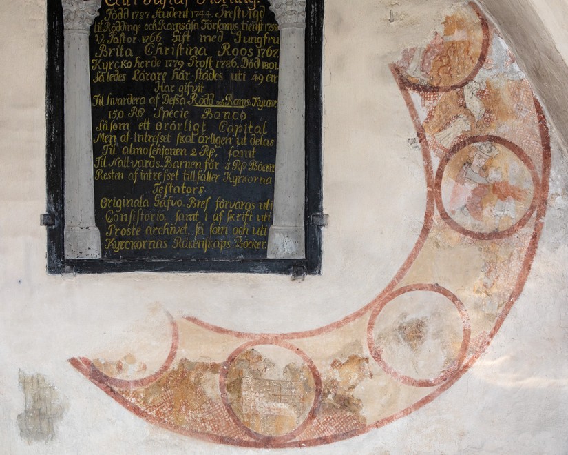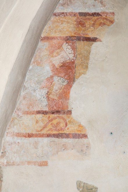 To motiver er bevaret på nordvæggen i første fag. Skjoldbuen gennemskærer det vestlige billede, mens mindetavlen har ødelagt en stor del af livshjulet.