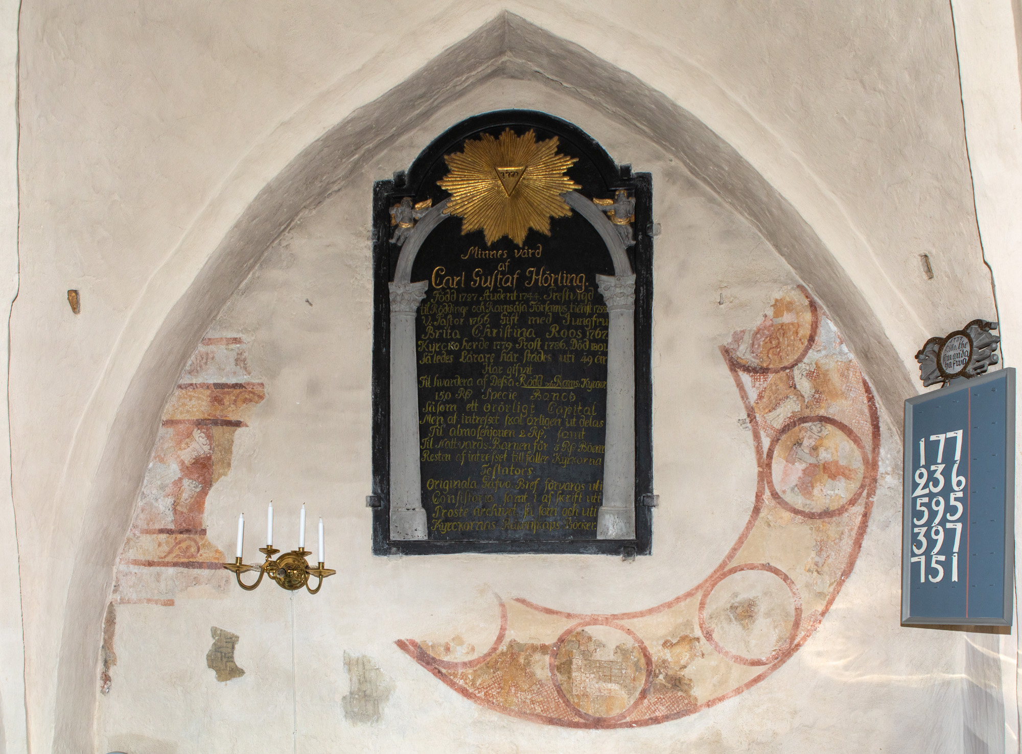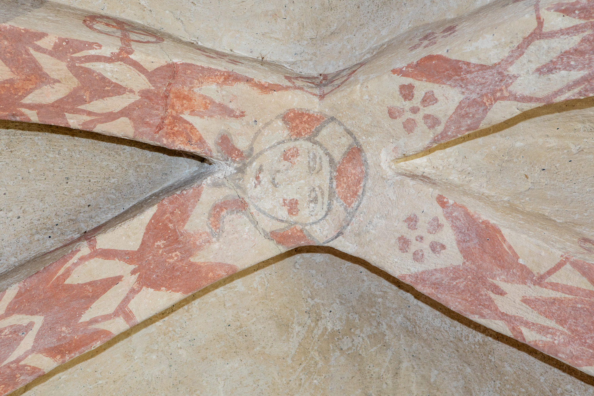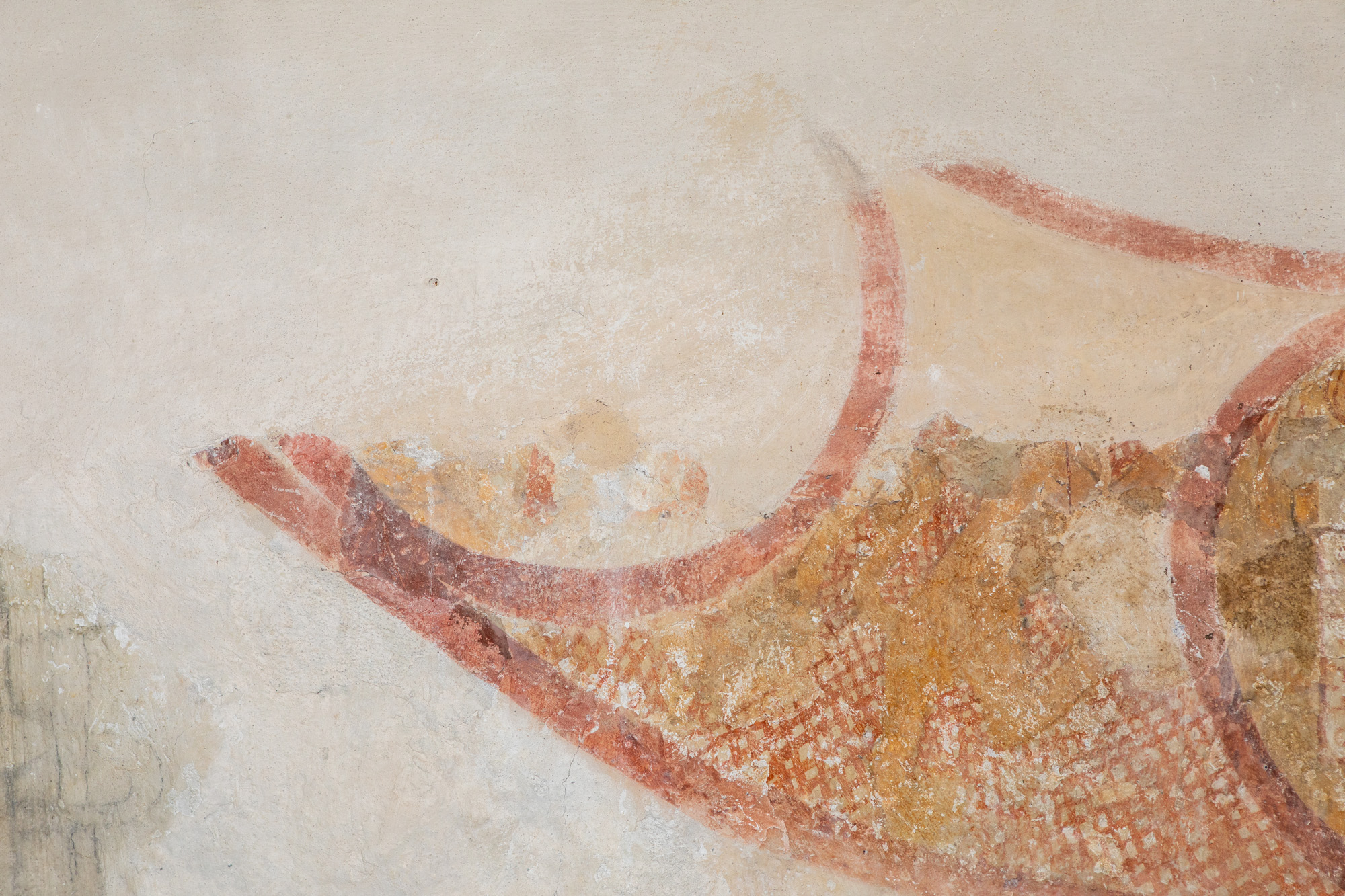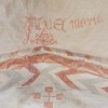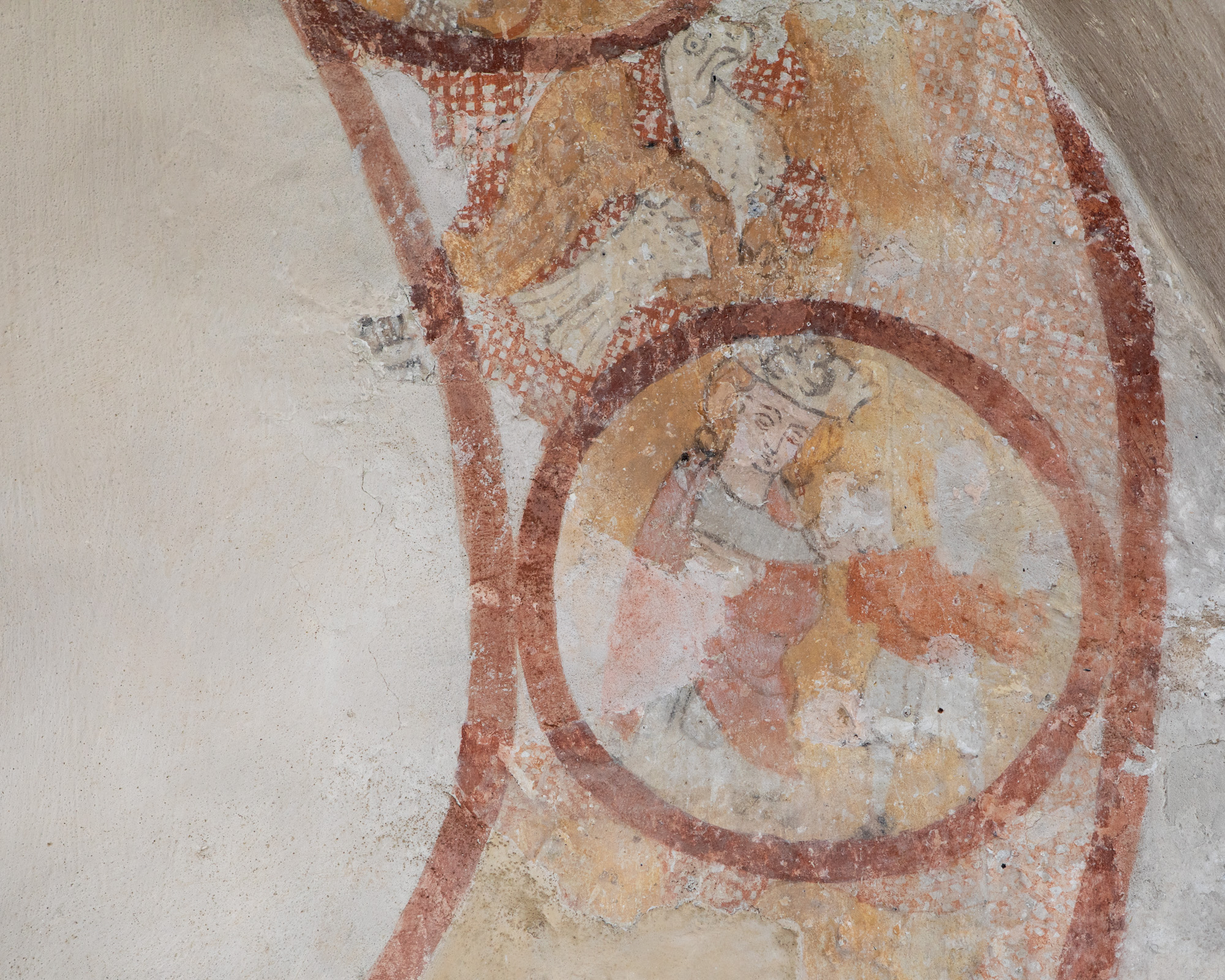 To motiver er bevaret på nordvæggen i første fag. Skjoldbuen gennemskærer det vestlige billede, mens mindetavlen har ødelagt en stor del af livshjulet.