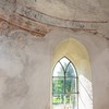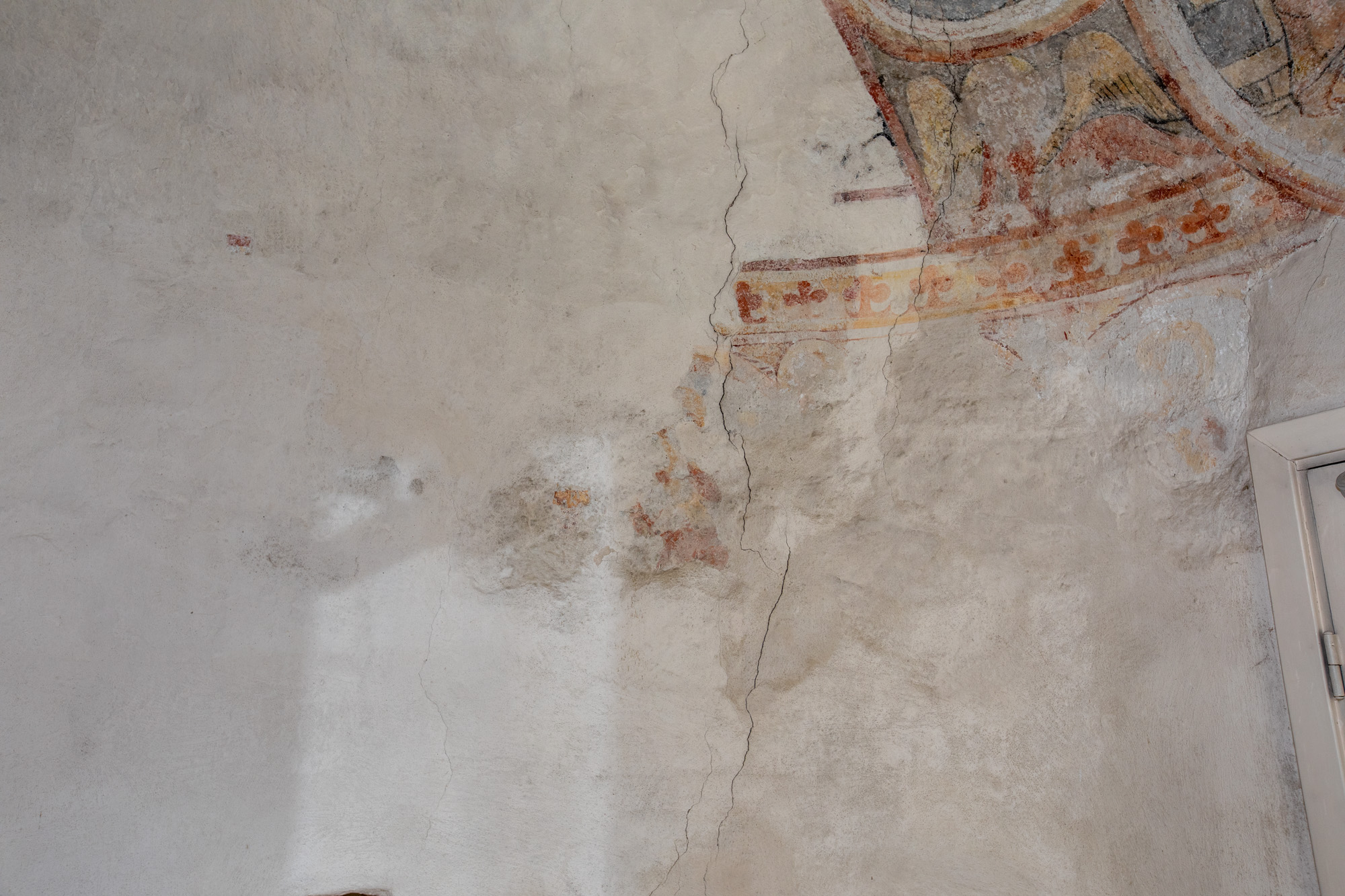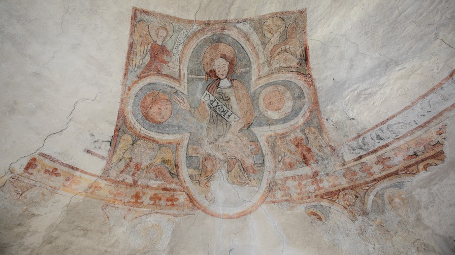 Under Verdensdommen ses resterne af en apostelrække. Nederst i hvælvkappen ses en due.