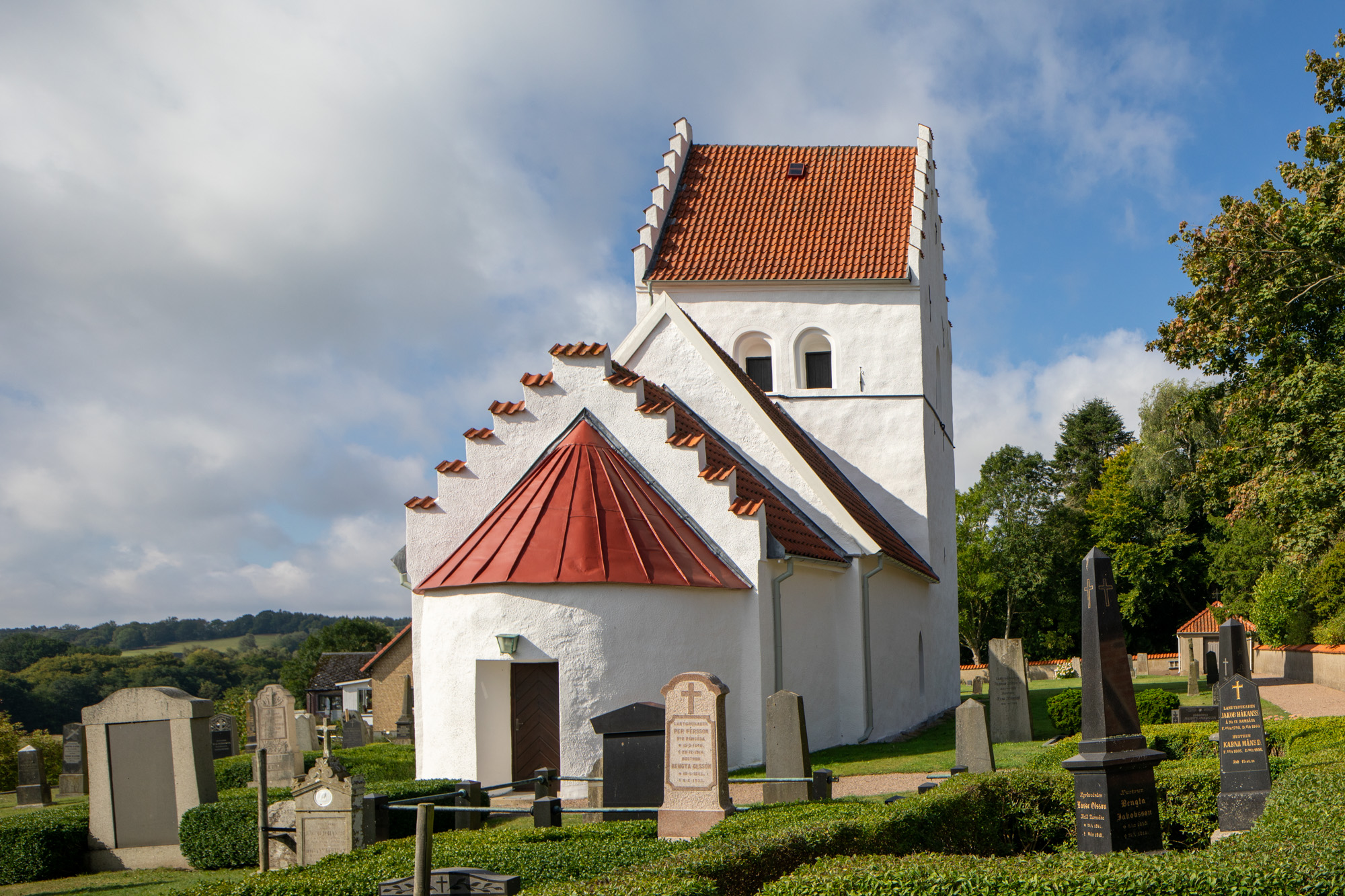 I apsis troner Verdensdommeren på en tronstol. Han har glorie, og to sværd udgår fra hans mund. Højre hånd er løftet til velsignelse, mens han holder et skriftbånd i venstre hånd. Bogstaverne vender hovedet: IHS XRC. Det er en forkortelse for Jesus Kristus. Ved siden af ham ses solen og månen, som her repræsenterer det kosmiske i stedet for den traditionelle regnbue. I hjørnerne ses evangelistsymbolerne med skriftbånd. De tre er tomme. I den fjerde står der: Matheus.