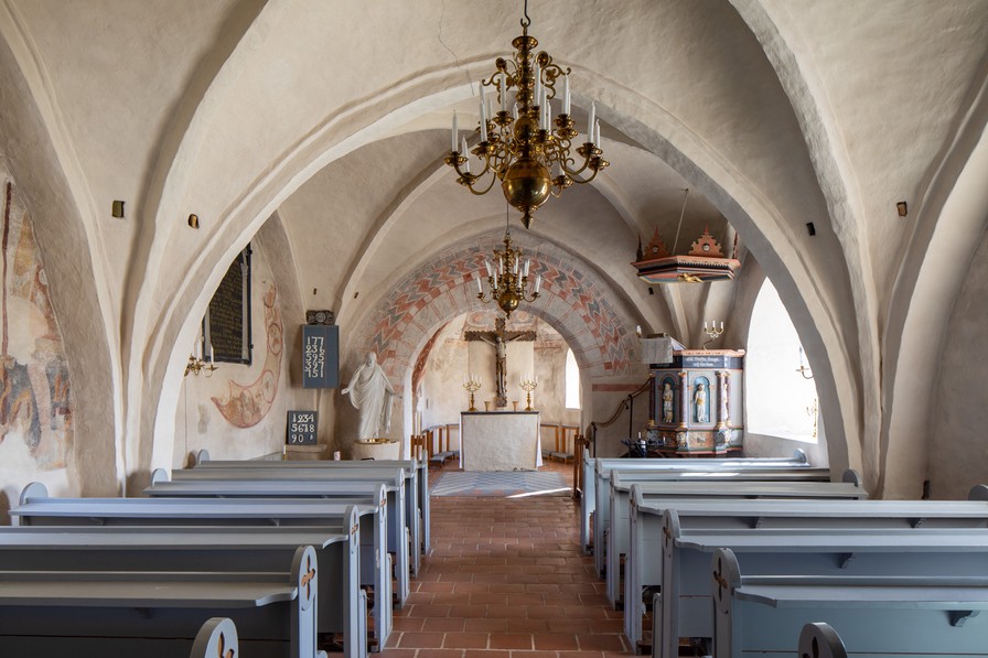 Kalkmalerierne i apsis og på skibets nordvæg er fra 1300-tallet, mens udsmykningen af hvælvet i koret og triumfbuen er fra 1400-tallet.