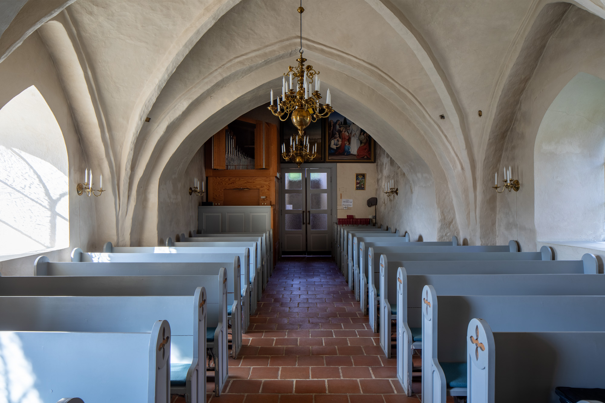 Der er spor af sidealtre i begge skibets østlige hjørner. Pilastrene til hvælvene er placeret på altrene.