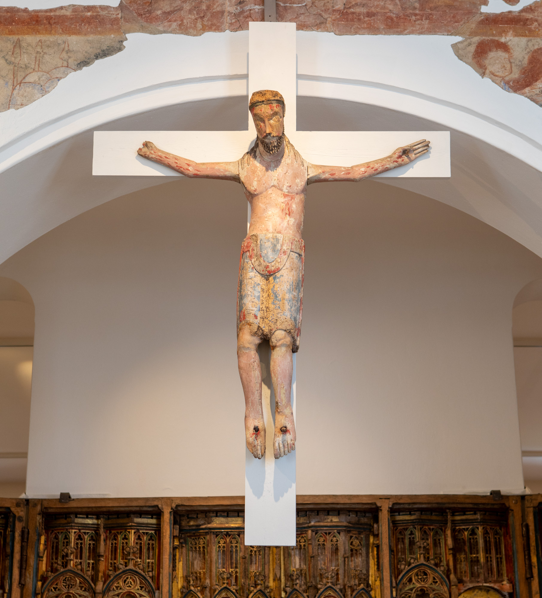 Hovedet har været savet af og monteret igen med en kile, så det hælder en smule. Den oprindelige krone er skiftet ud med en tornekrone, som nu er forsvundet. Benene har været savet over i knæene og lagt over kors. Dette blev dog tilbageført ved en konservering 1910. Også lændeklædet er omarbejdet.